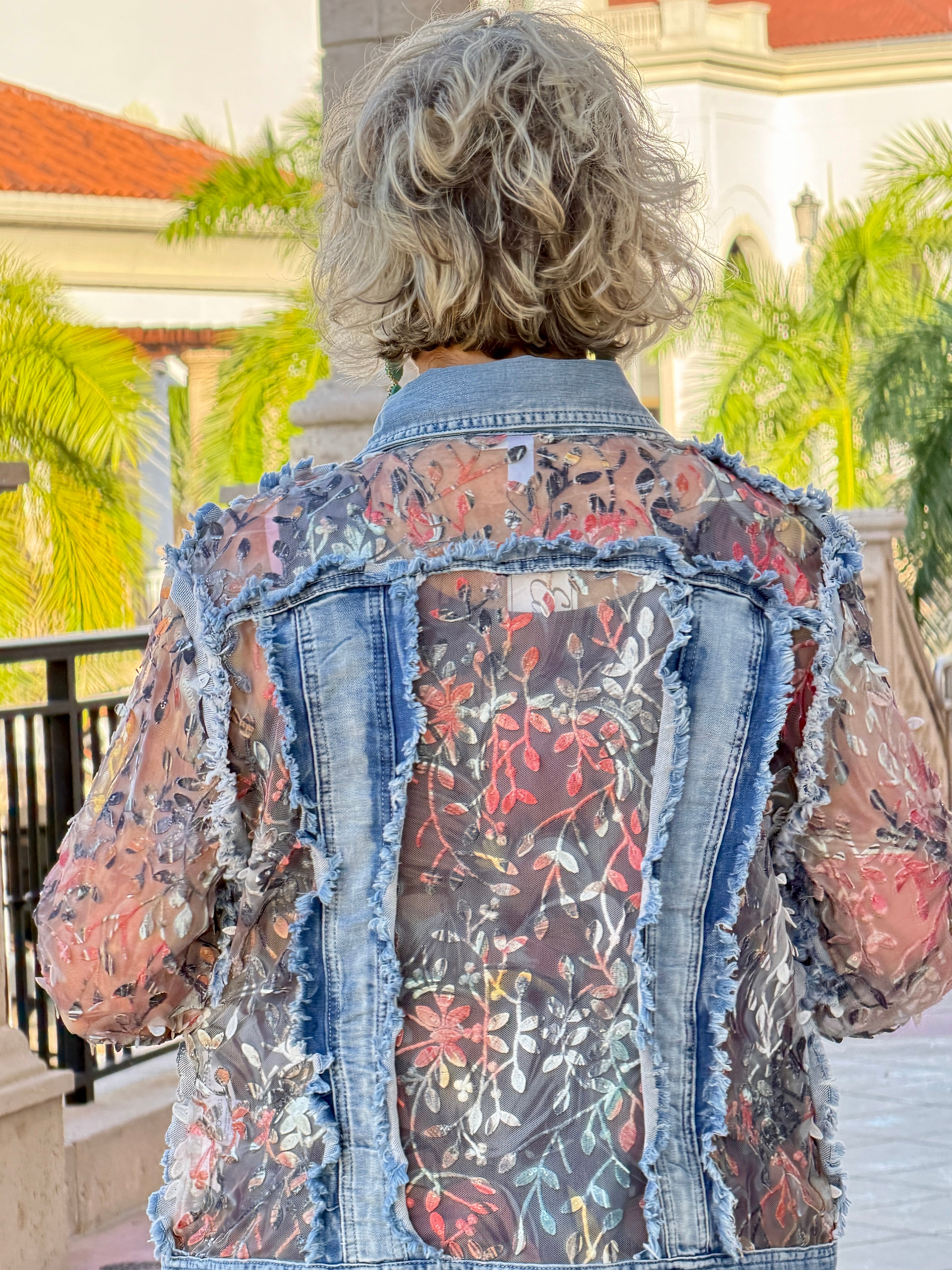 This stunning statement jacket is a must have for 2026 Get ready to collect compliments wherever your wear this artfully designed piece. Delicate floral insets mix with a traditional denim jacket.