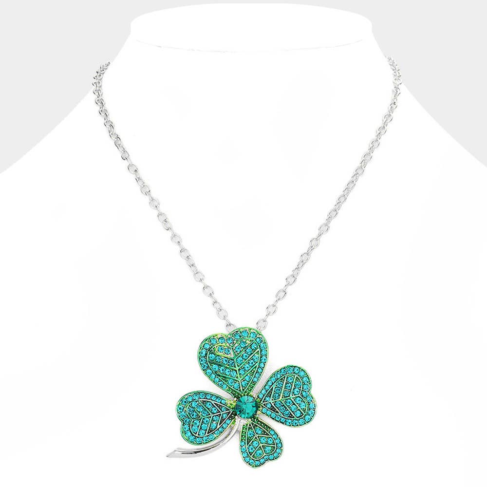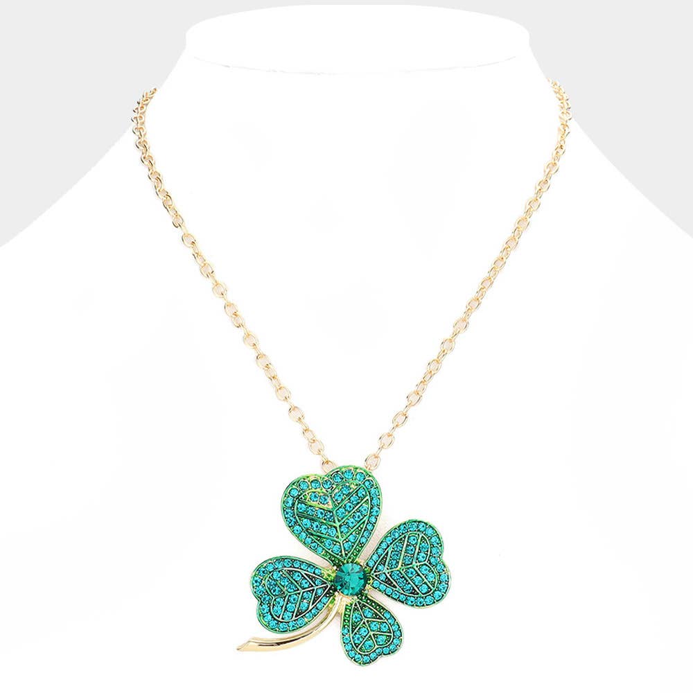 St. Patrick's Day Stone Embellished Clover Pendant Necklace • Necklace Size : 16.5" + 2" L • Pendant Size : 1.75" X 1.8"