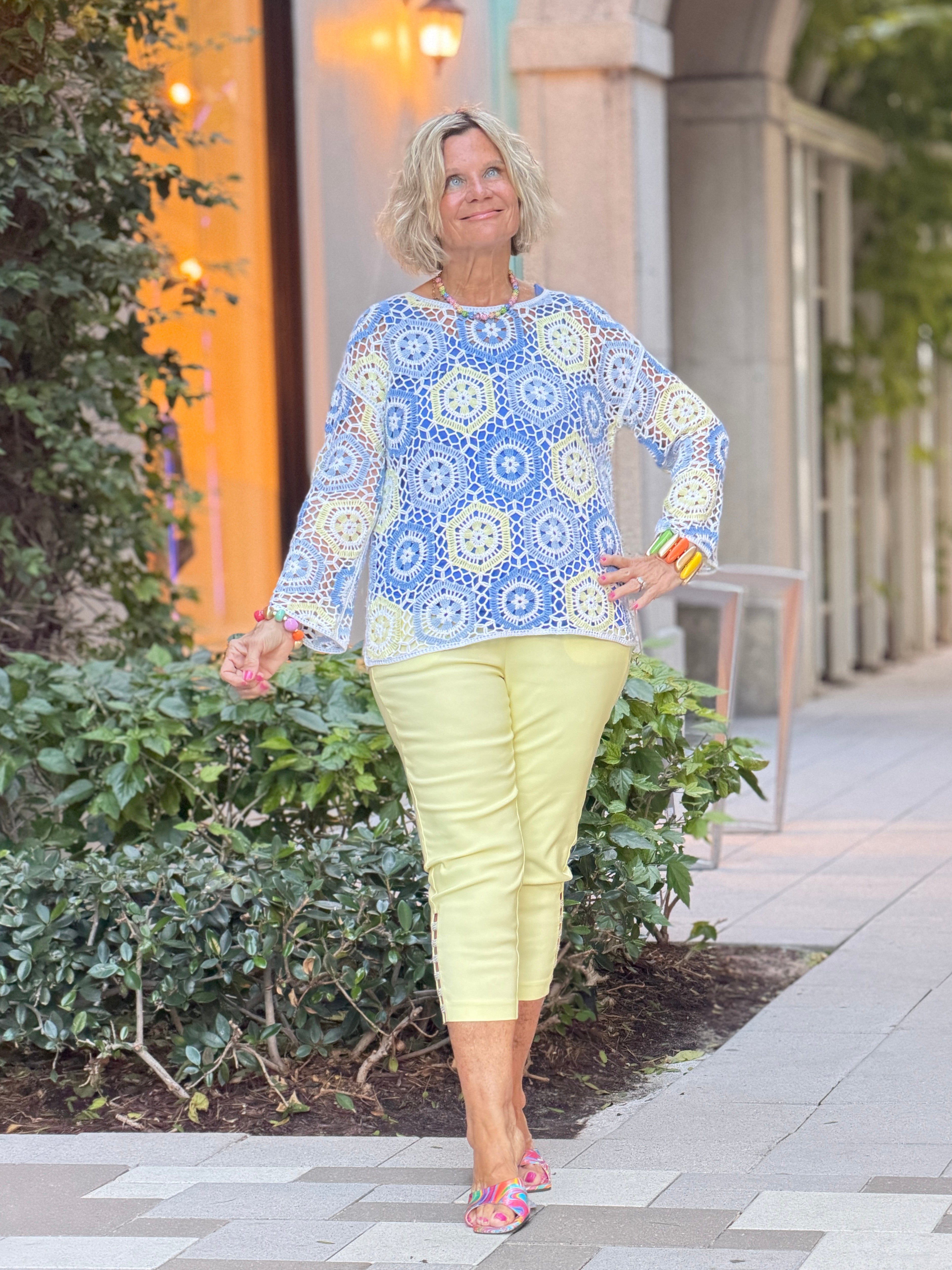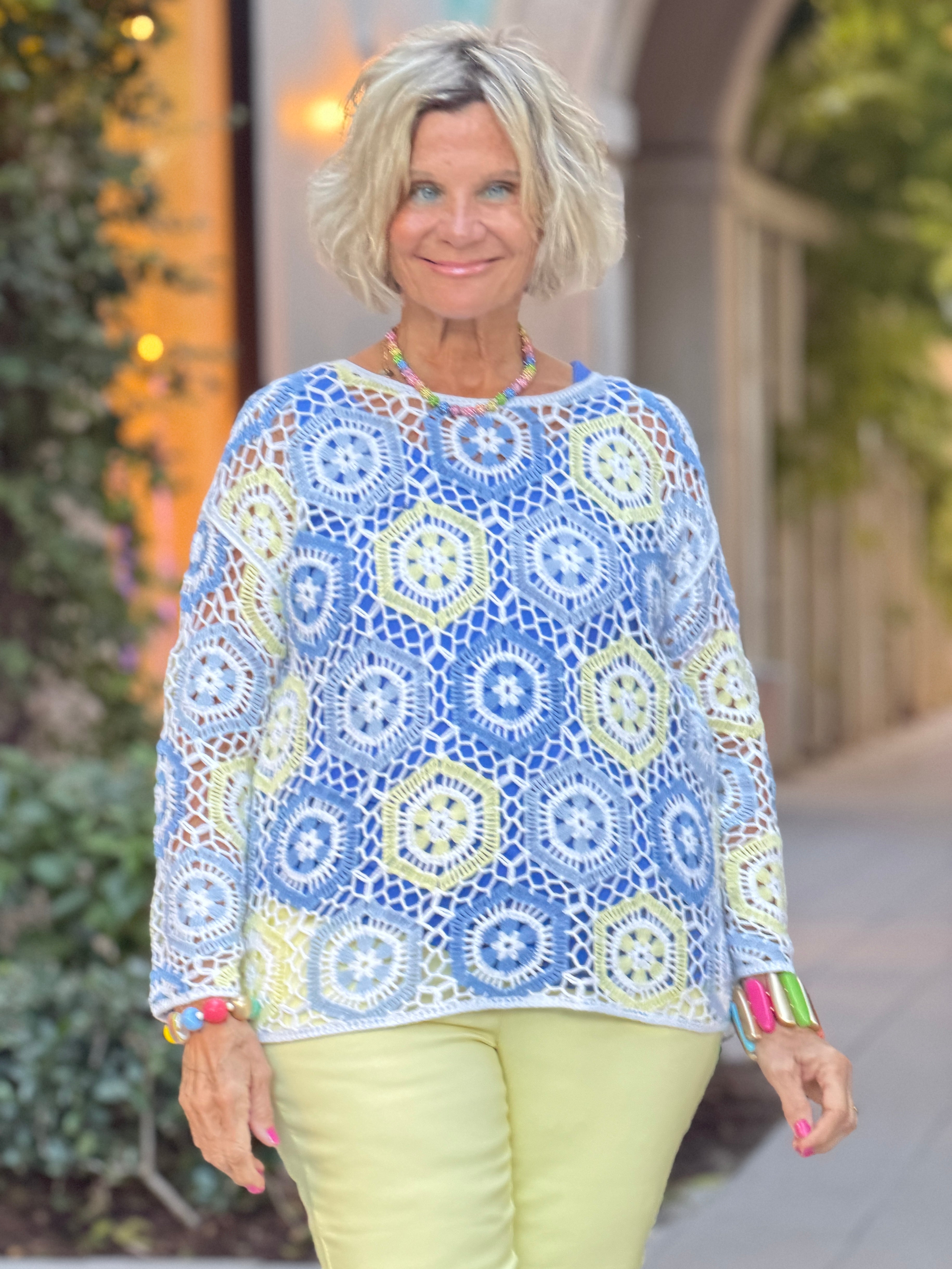 - Hexagonal crocheted fabric (sheer).