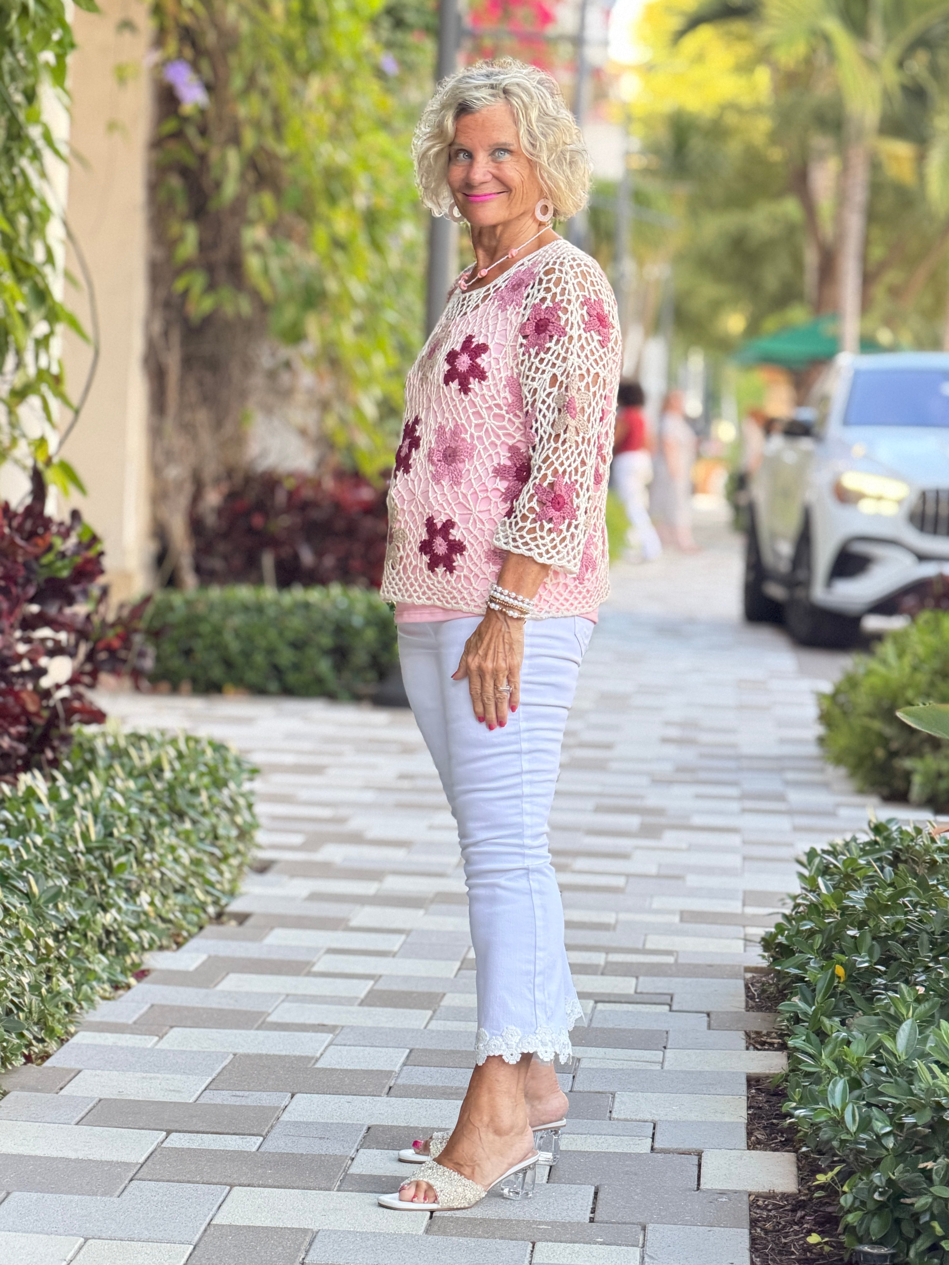Step into a world of charm with this handmade floral crochet top. The soft carnation shade brings elegance, and the detailed design showcases your unique style. Perfect for a breezy day or a stylish evening, this sweater is a must-have for any fashion lover.