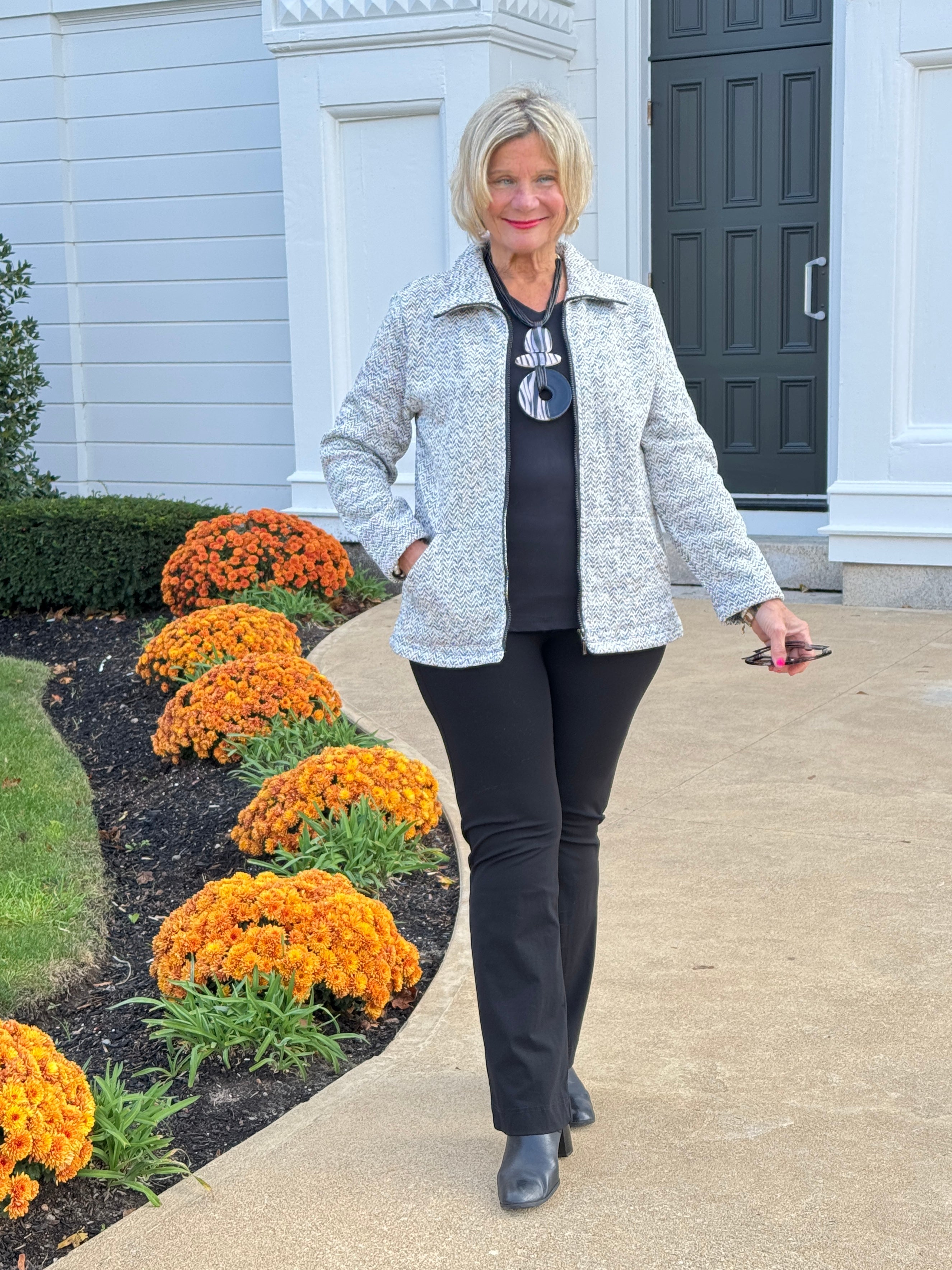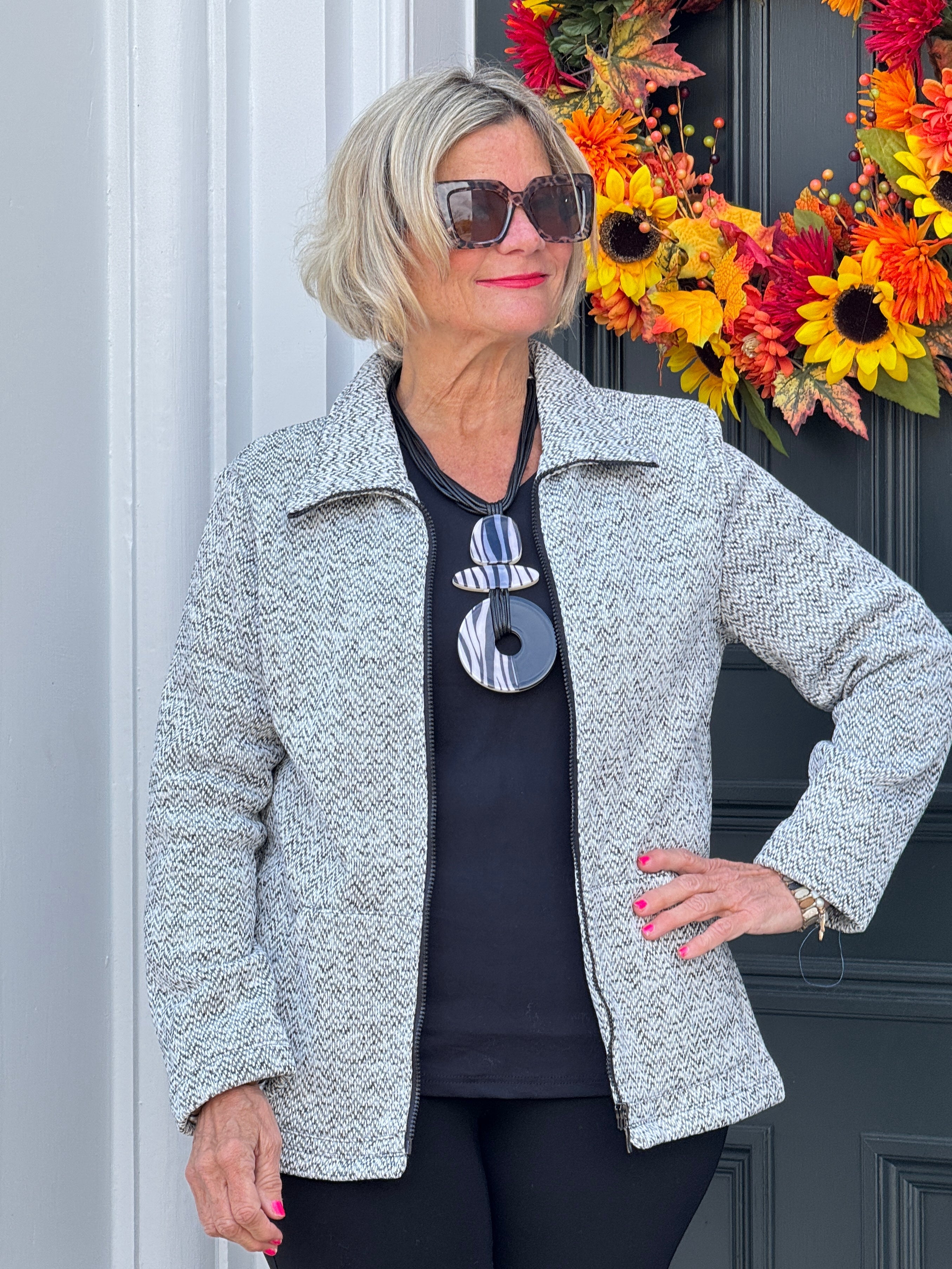 This tailored tweed jacket combines classic texture with modern functionality, featuring a full-length zipper and convenient pockets for a sleek, practical design. Modeled by Cathy at 5'6" wearing a medium, it offers a flattering fit that balances comfort and style, making it a versatile addition to your wardrobe. The fabric content is 100 % Polyester