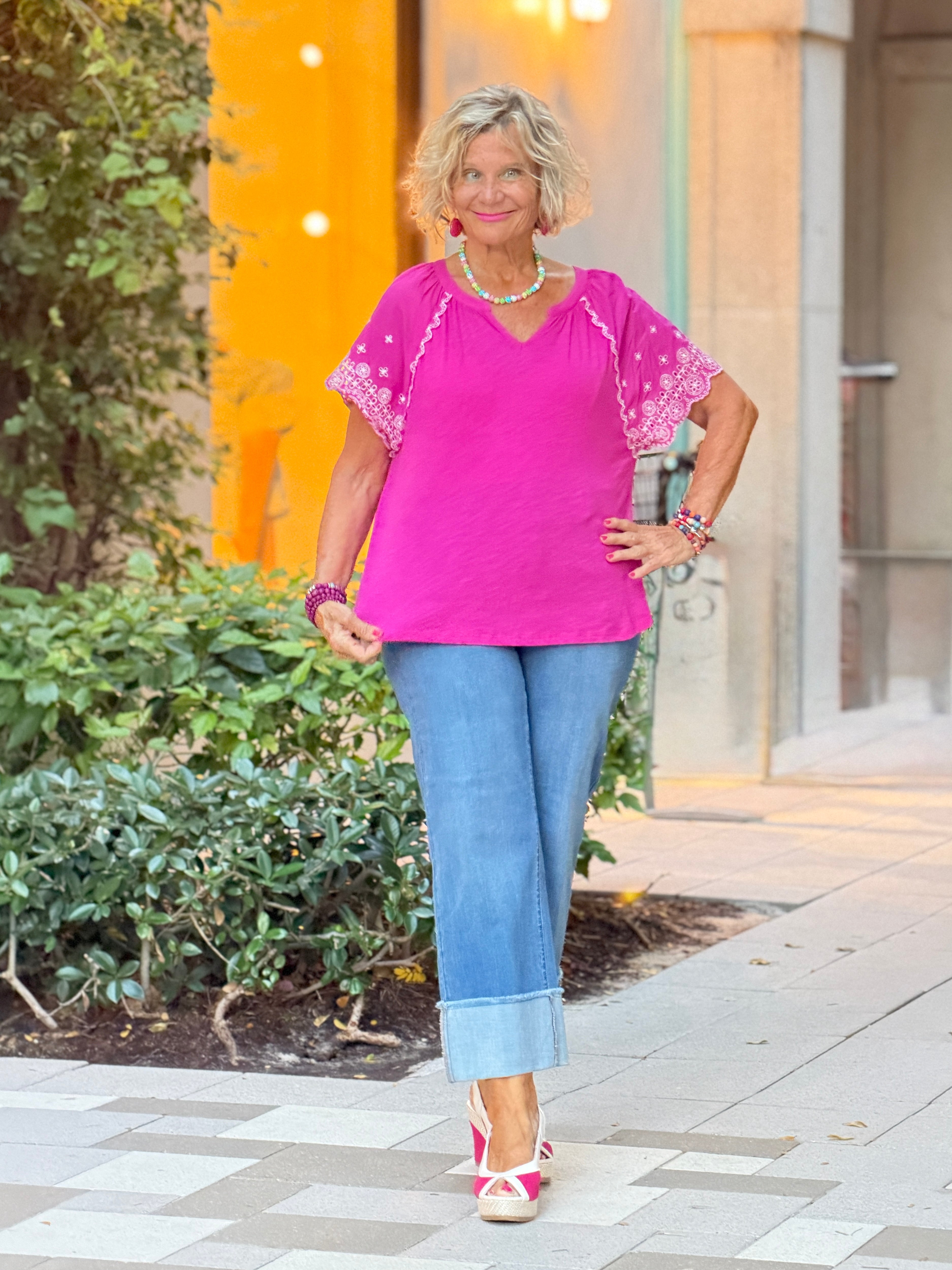 This slub knit tee elevates an everyday silhouette with beautifully embroidered poplin sleeves. The split neckline adds an easy, flattering touch, while the silky slub fabric feels soft and lightweight against the skin. Short sleeves keep it comfortable and breathable, making it perfect for warm days. A polished tee that feels special without trying too hard.