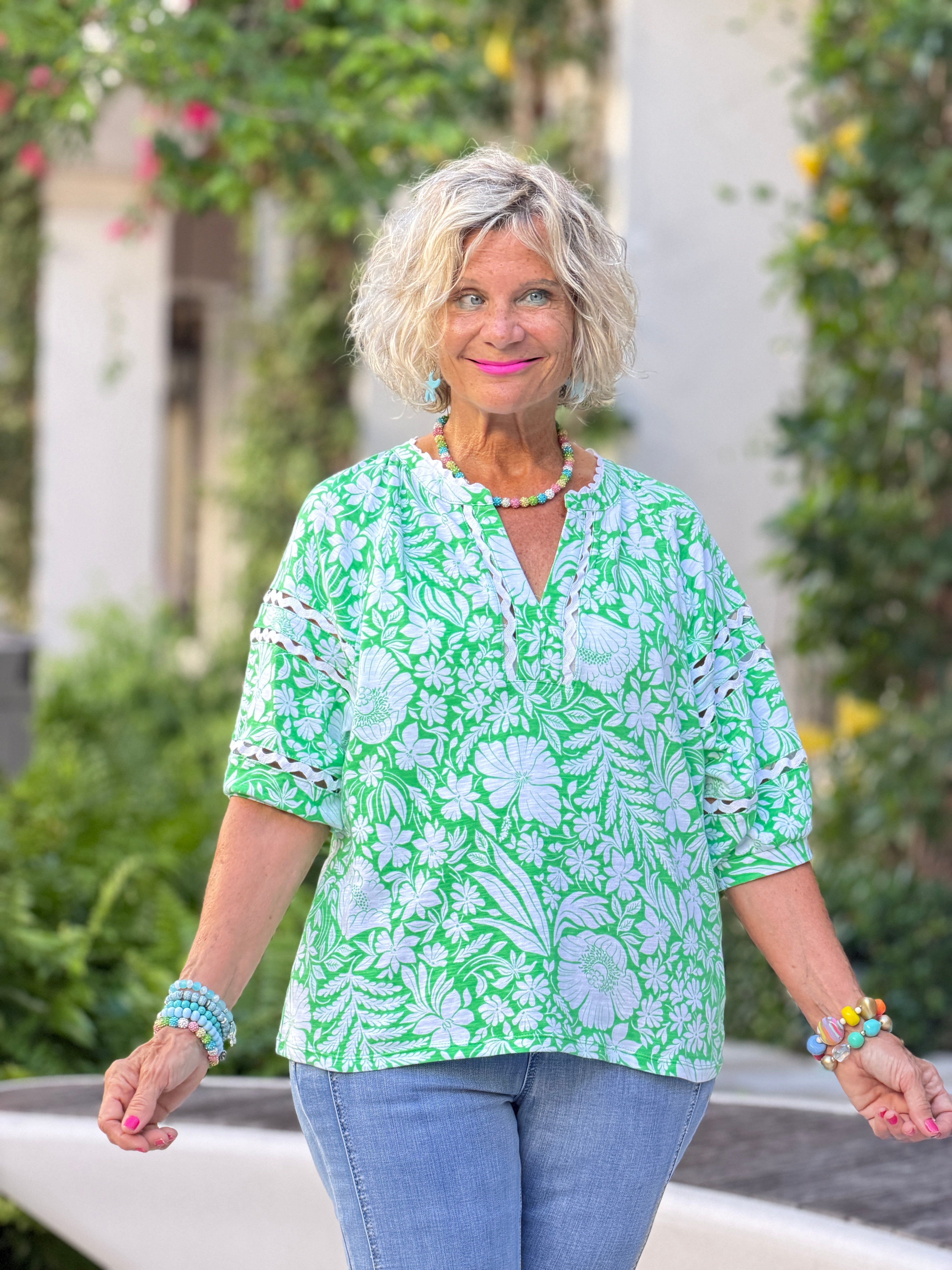 This tropical floral knit top is finished with decorative contrast trim that adds texture and charm along the neckline. The split neck keeps the look relaxed, while elbow-length sleeves offer comfortable coverage. The vibrant print brings energy without overwhelming the silhouette. An easy way to add color and personality to everyday outfits.