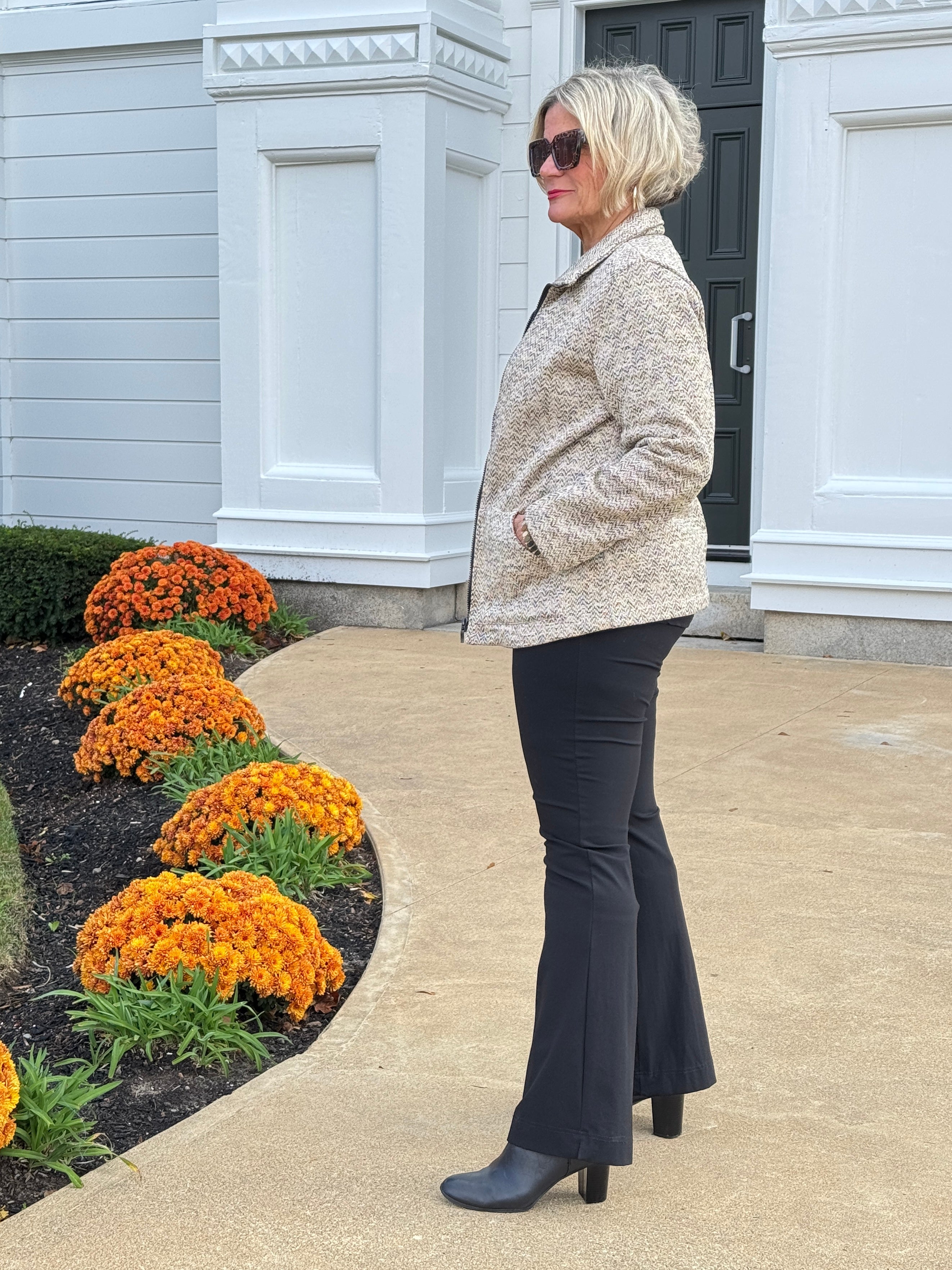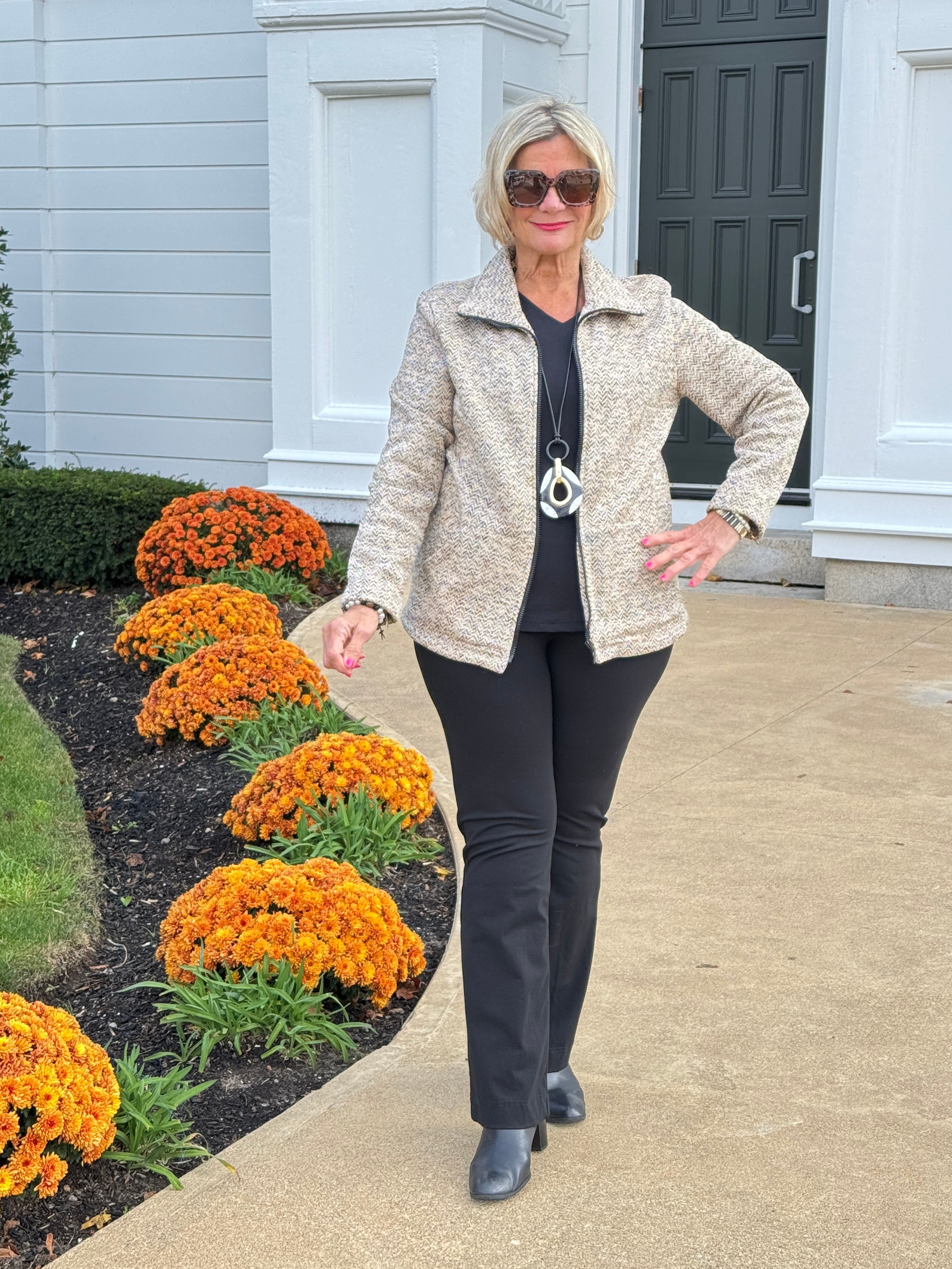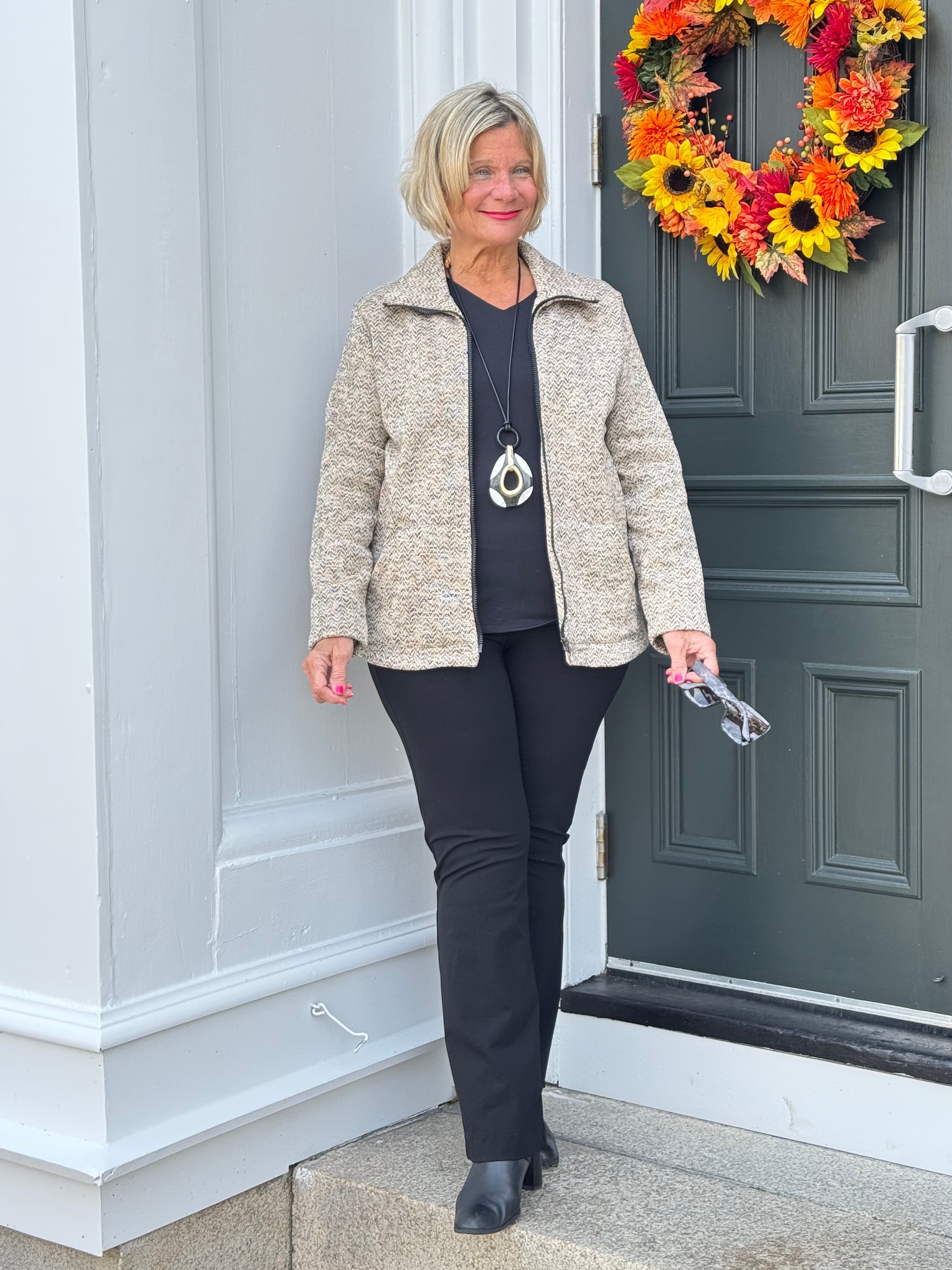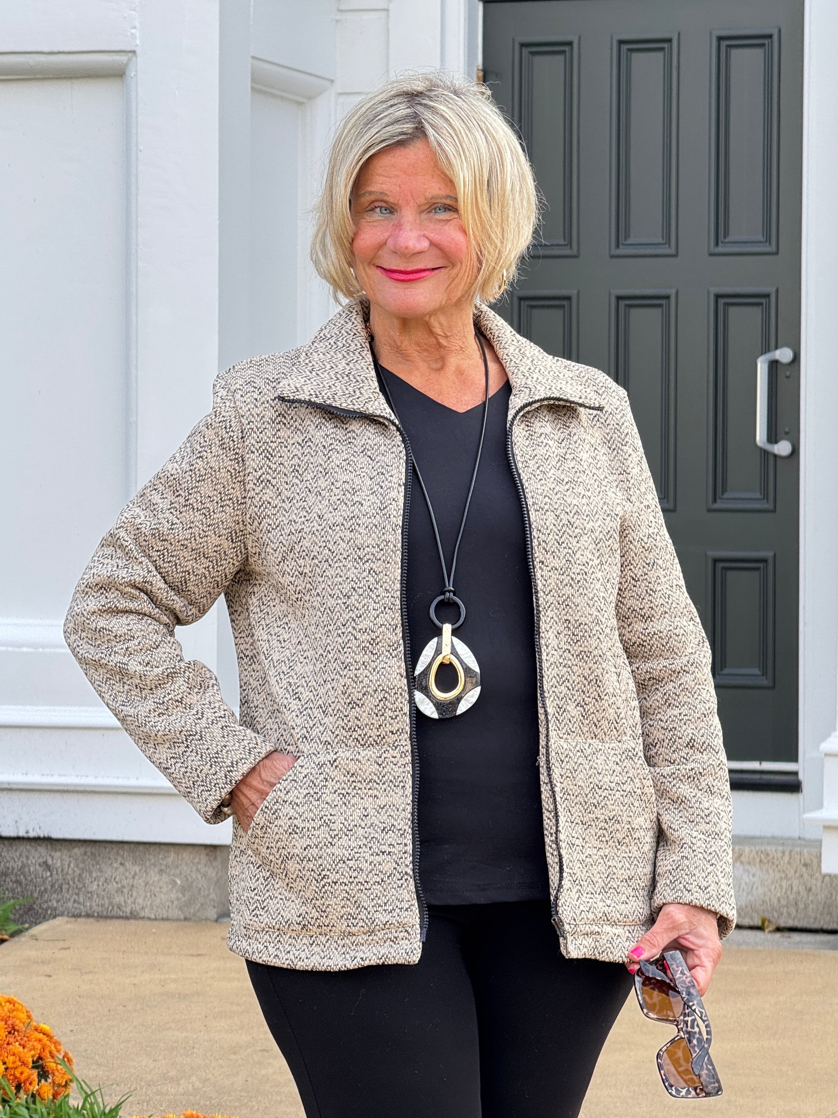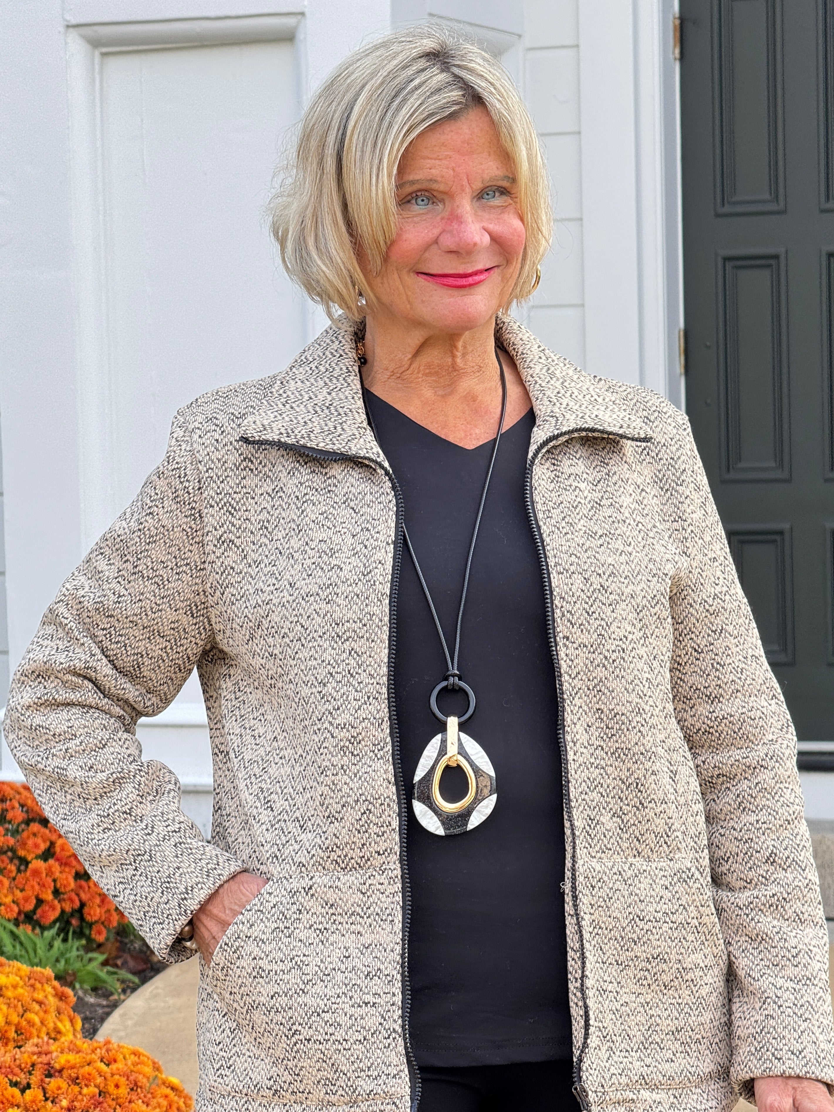 This tailored tweed jacket combines classic texture with modern functionality, featuring a full-length zipper and convenient pockets for a sleek, practical design. Modeled by Cathy at 5'6" wearing a medium, it offers a flattering fit that balances comfort and style, making it a versatile addition to your wardrobe. The fabric content is 100 % Polyester