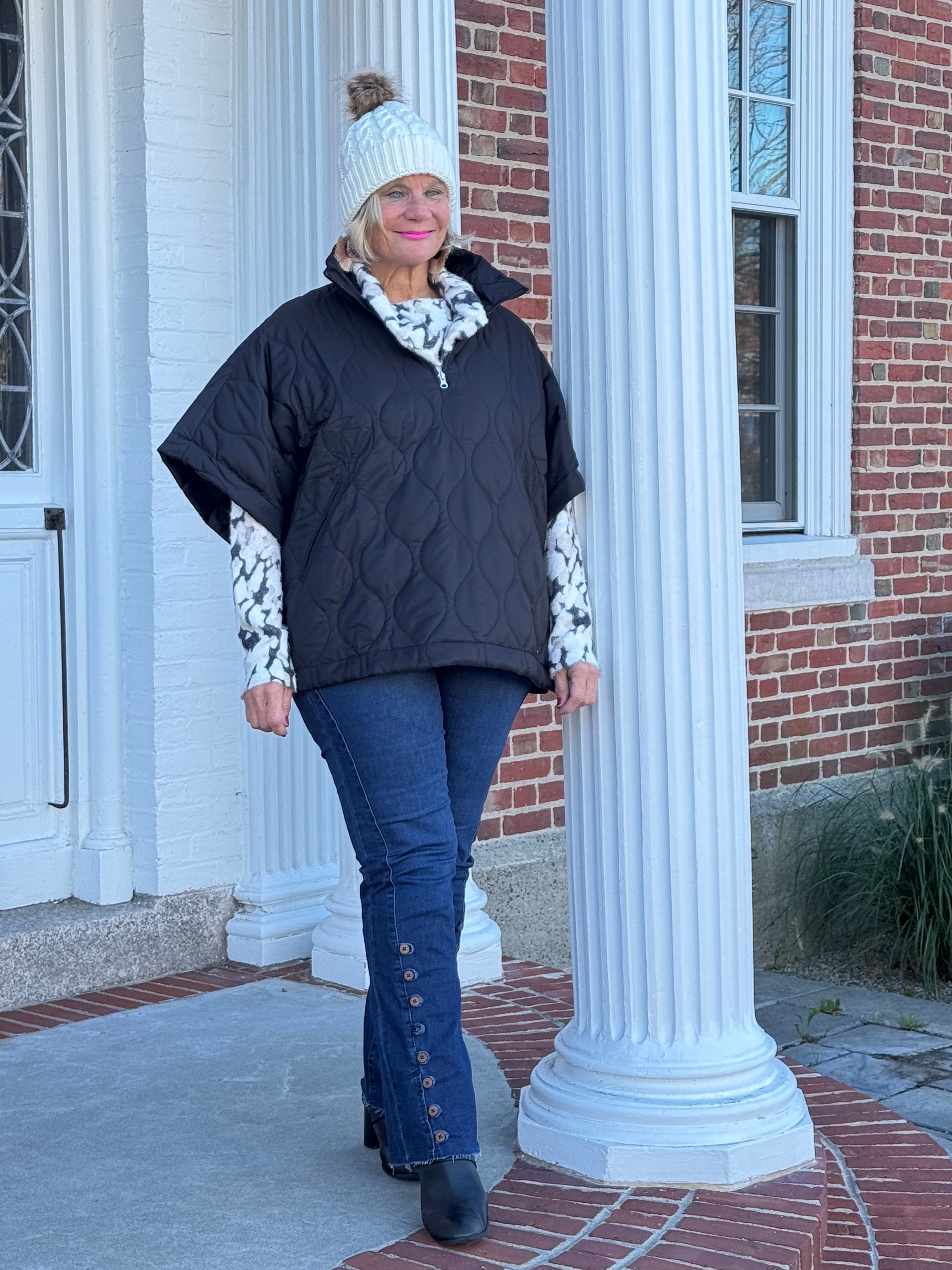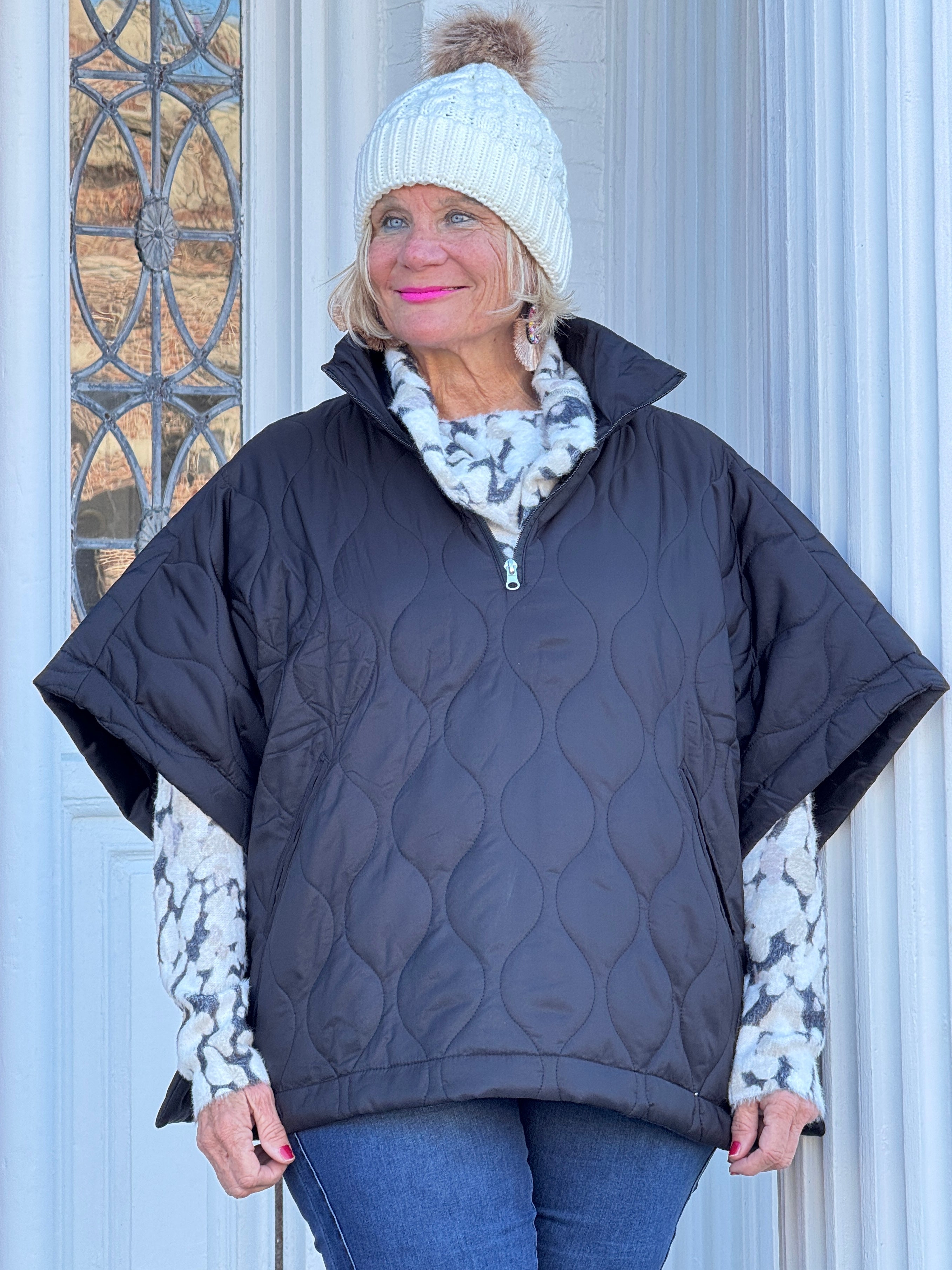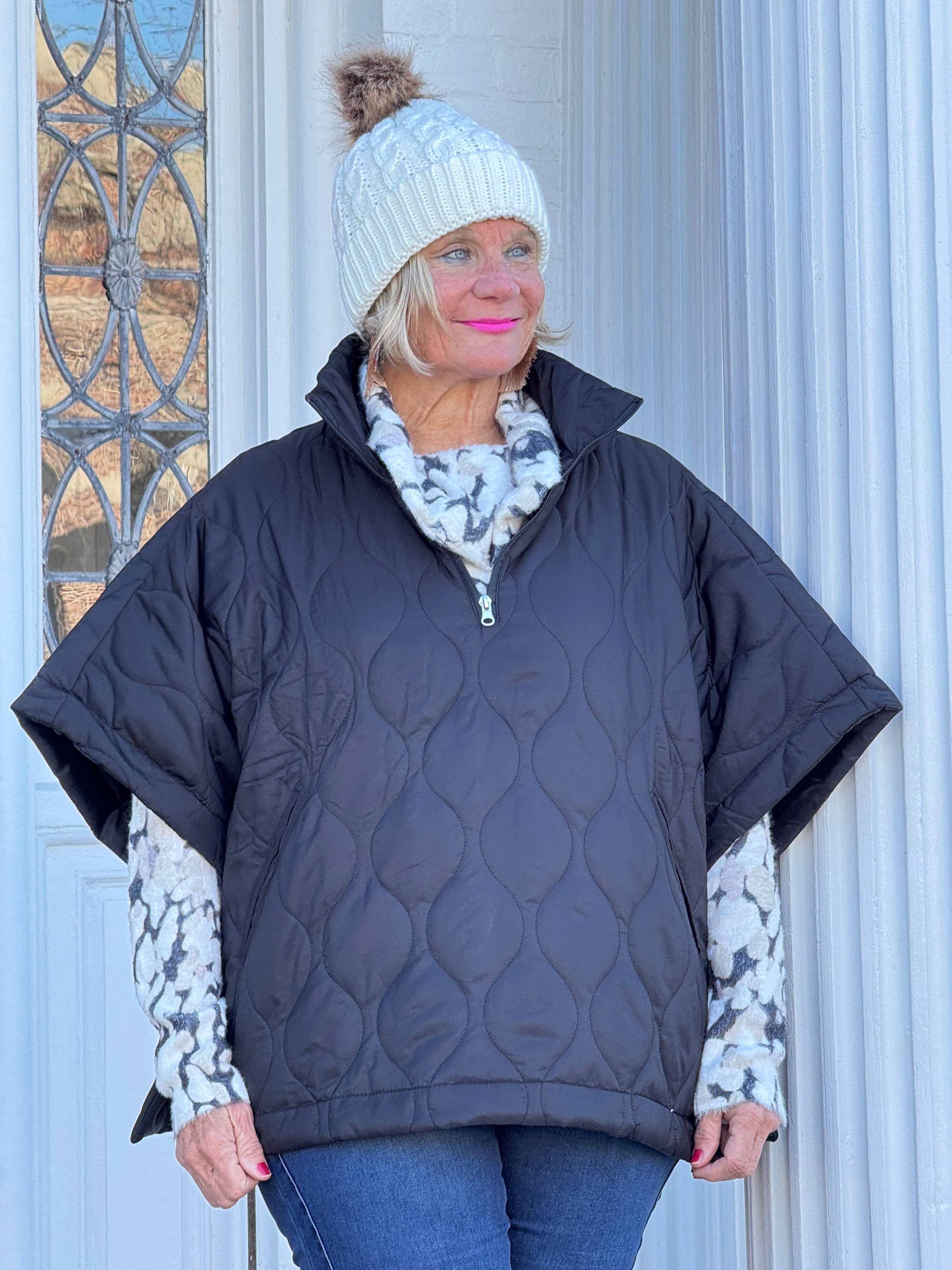 Quilted Short Sleeves Puffer Pullover Poncho Black