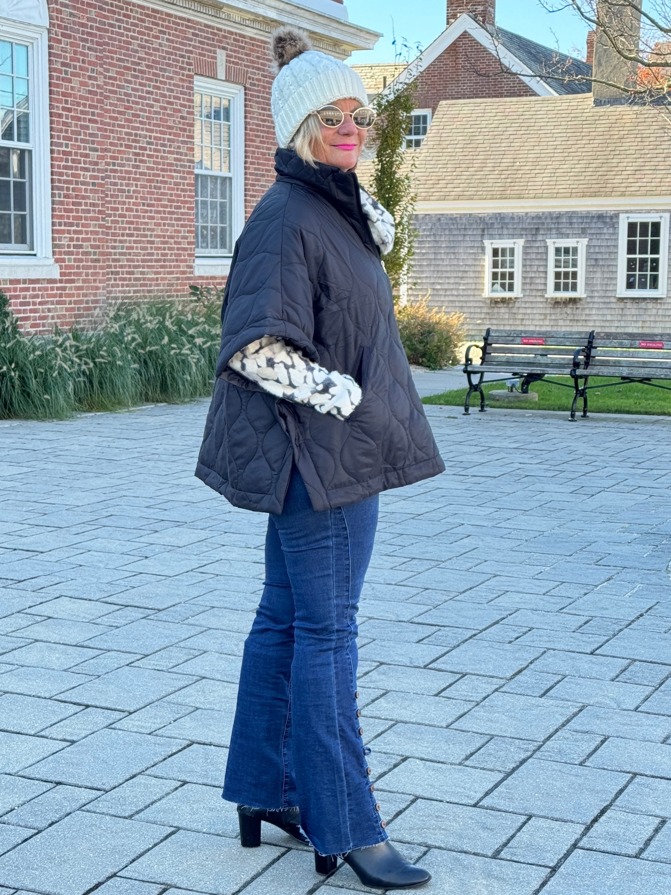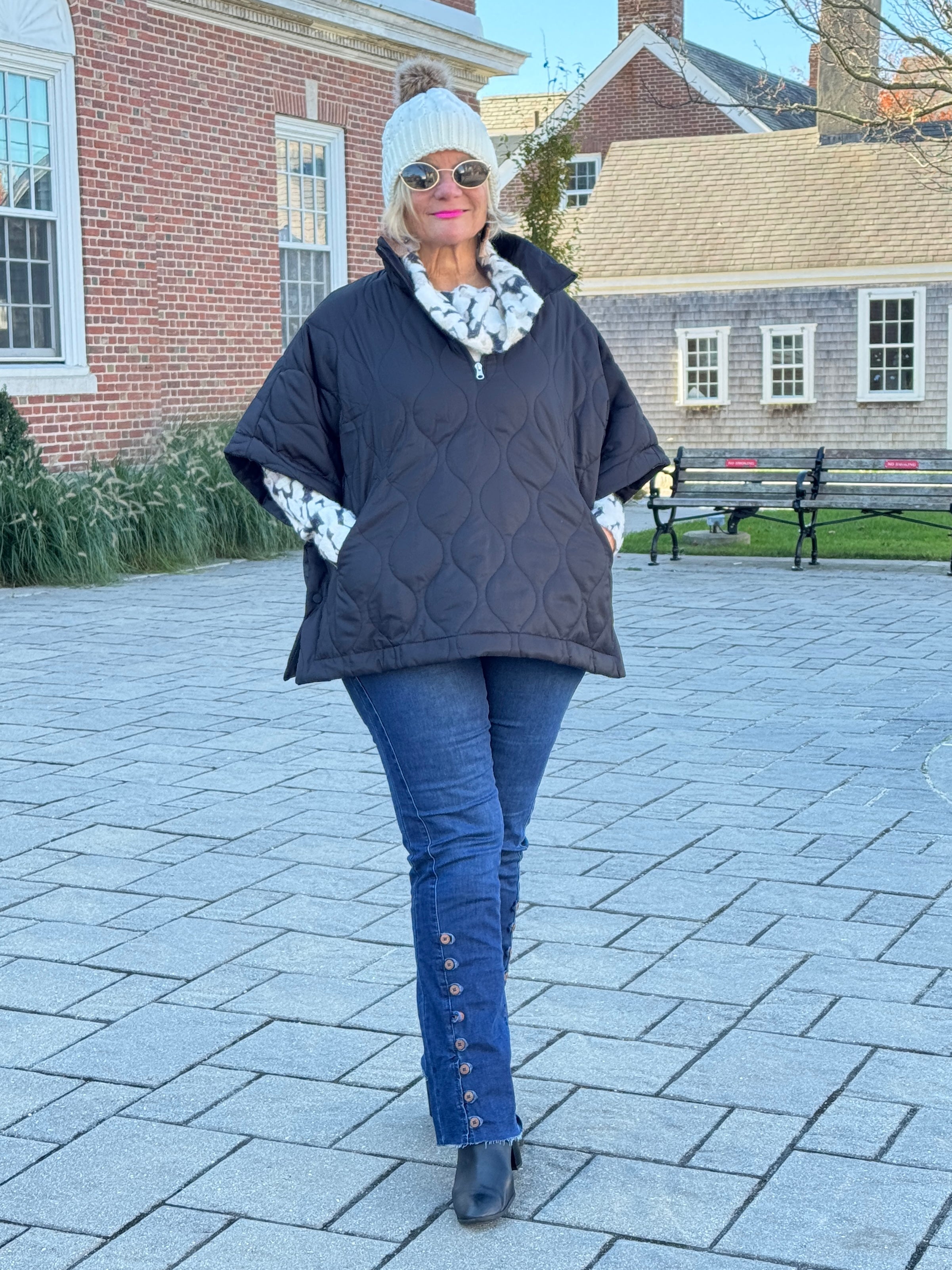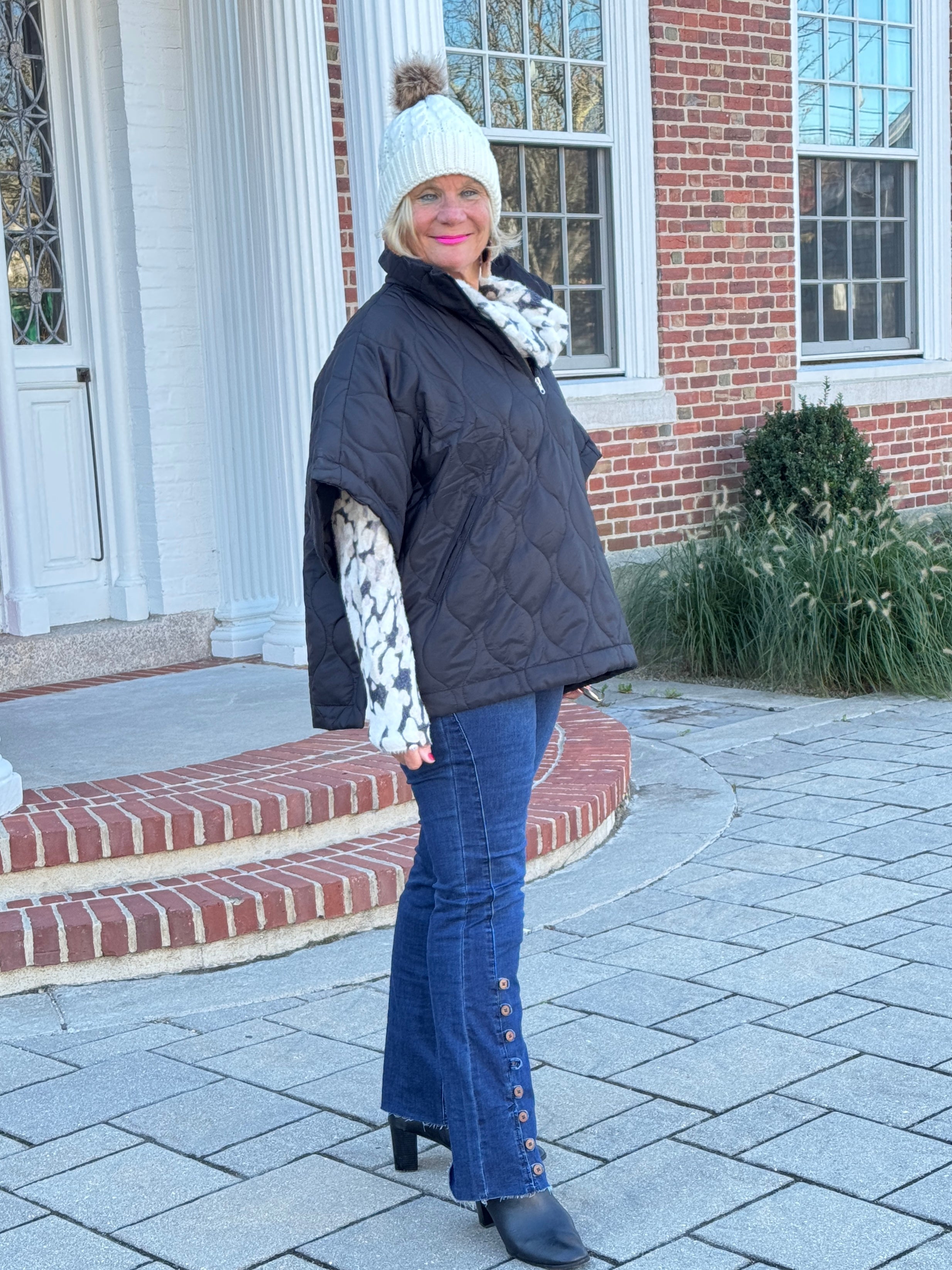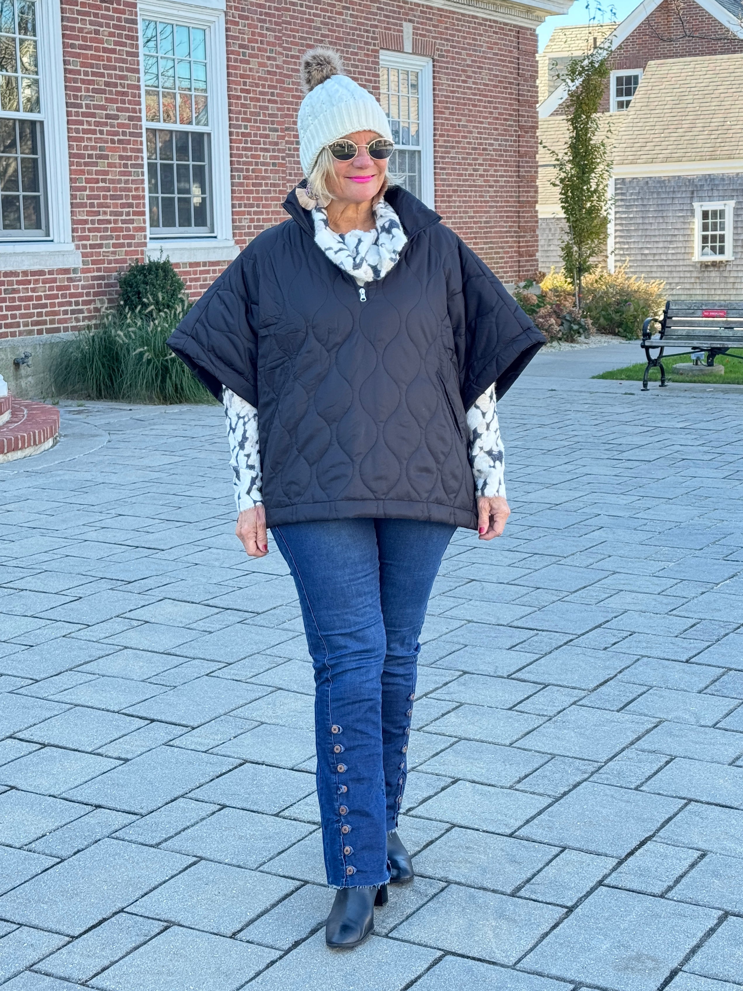 Quilted Short Sleeves Puffer Pullover Poncho Black