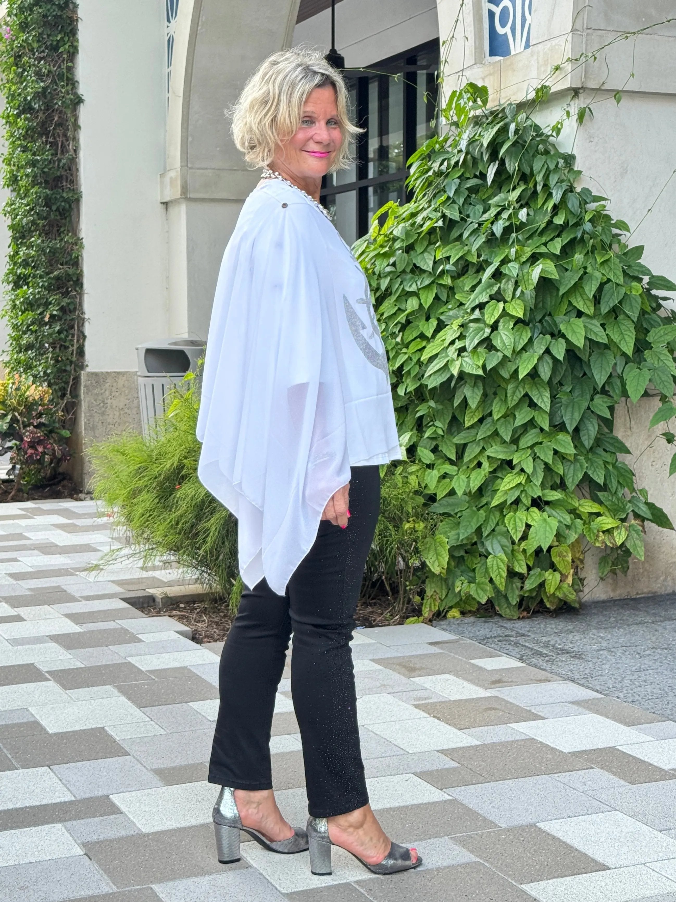 Must-have alert! Kokomo Unlimited's Multi-Way Toppers can be popped over your basics for a fresh new look. Dress up or down with ease in a burnout knit that features colorful printing accented with sparkling silver glitter details. This one-size-fits-most style can be worn as an asymmetric topper, v-neck poncho, one-sleeve poncho, neck scarf and more!