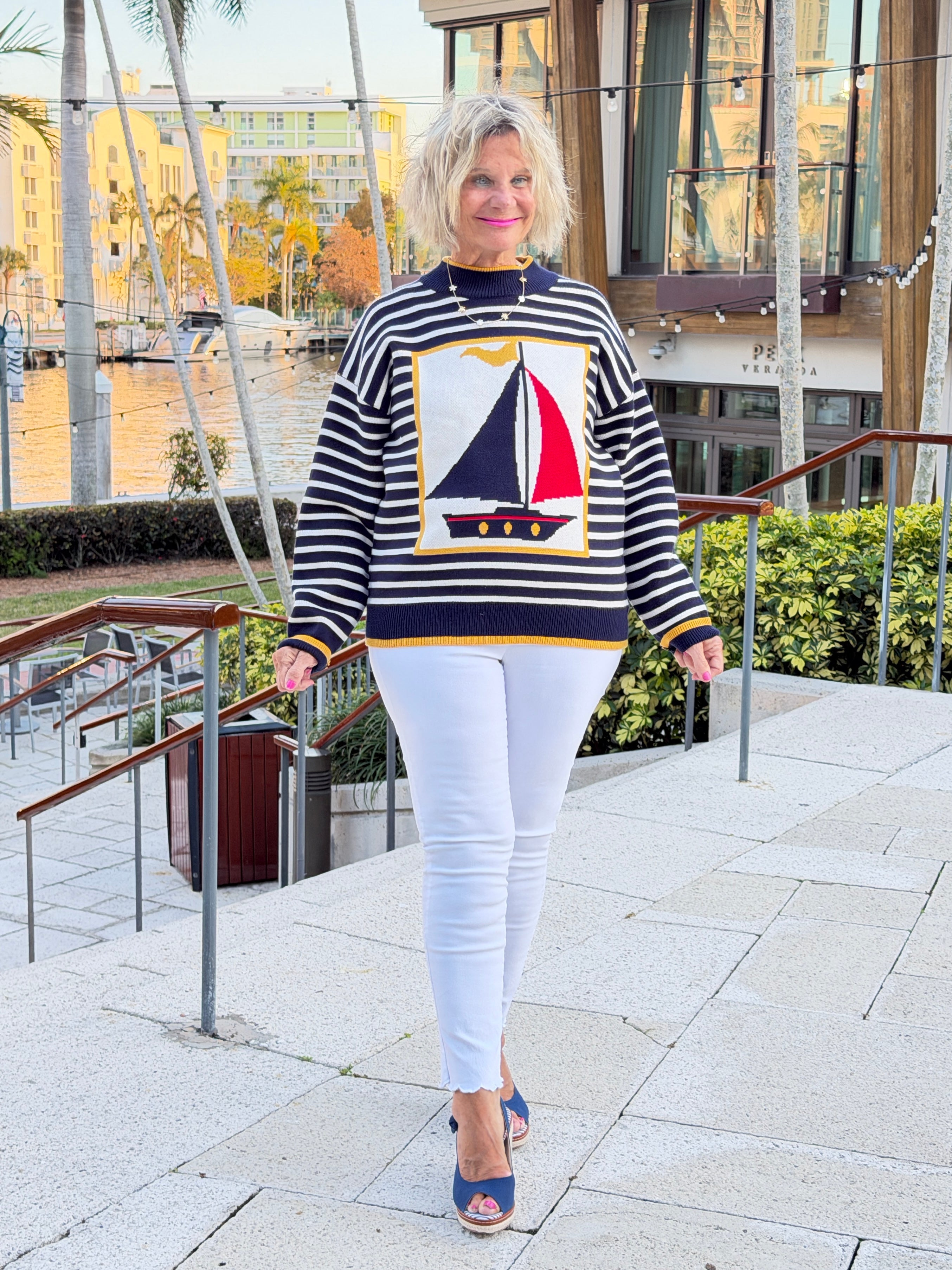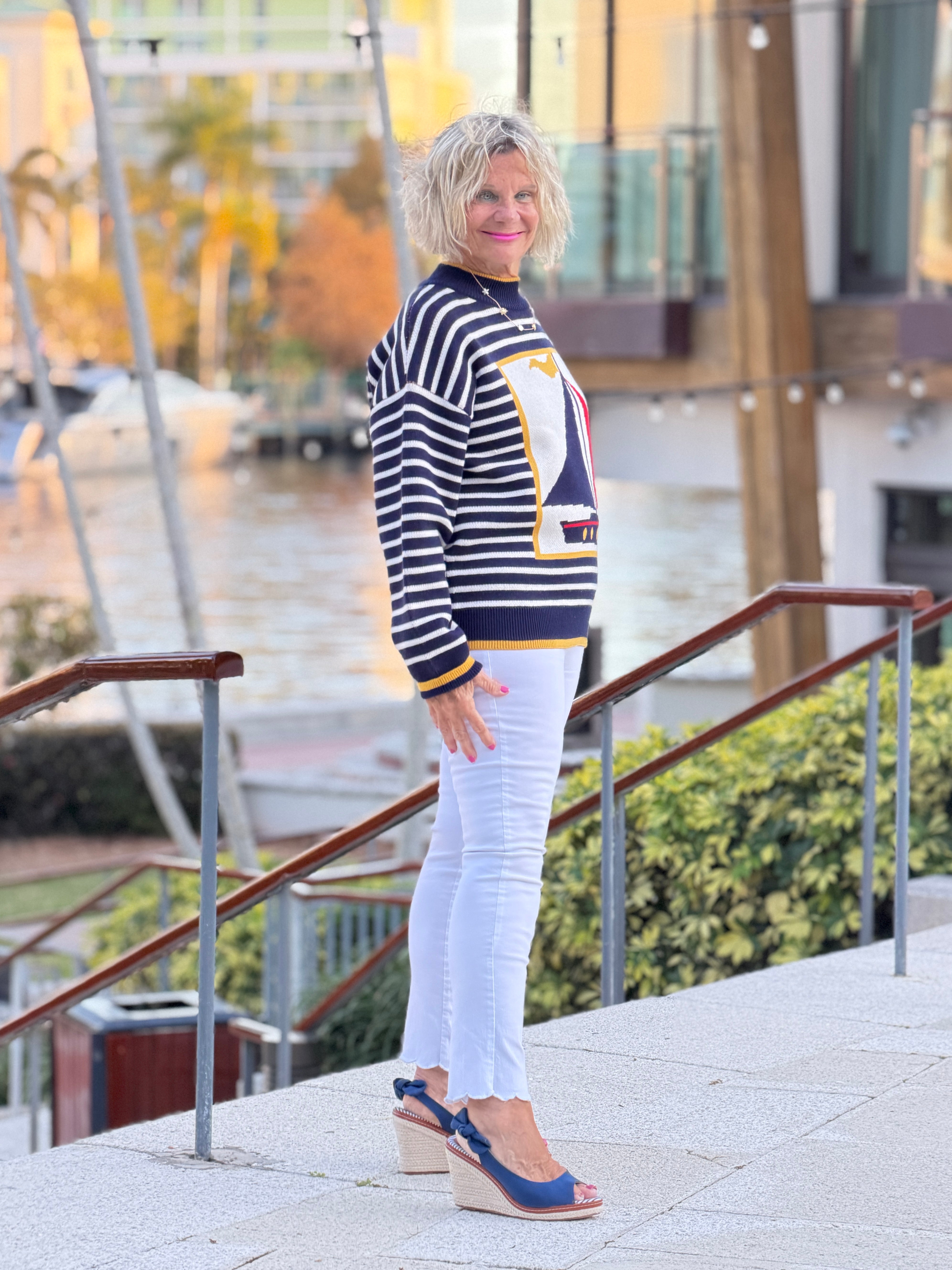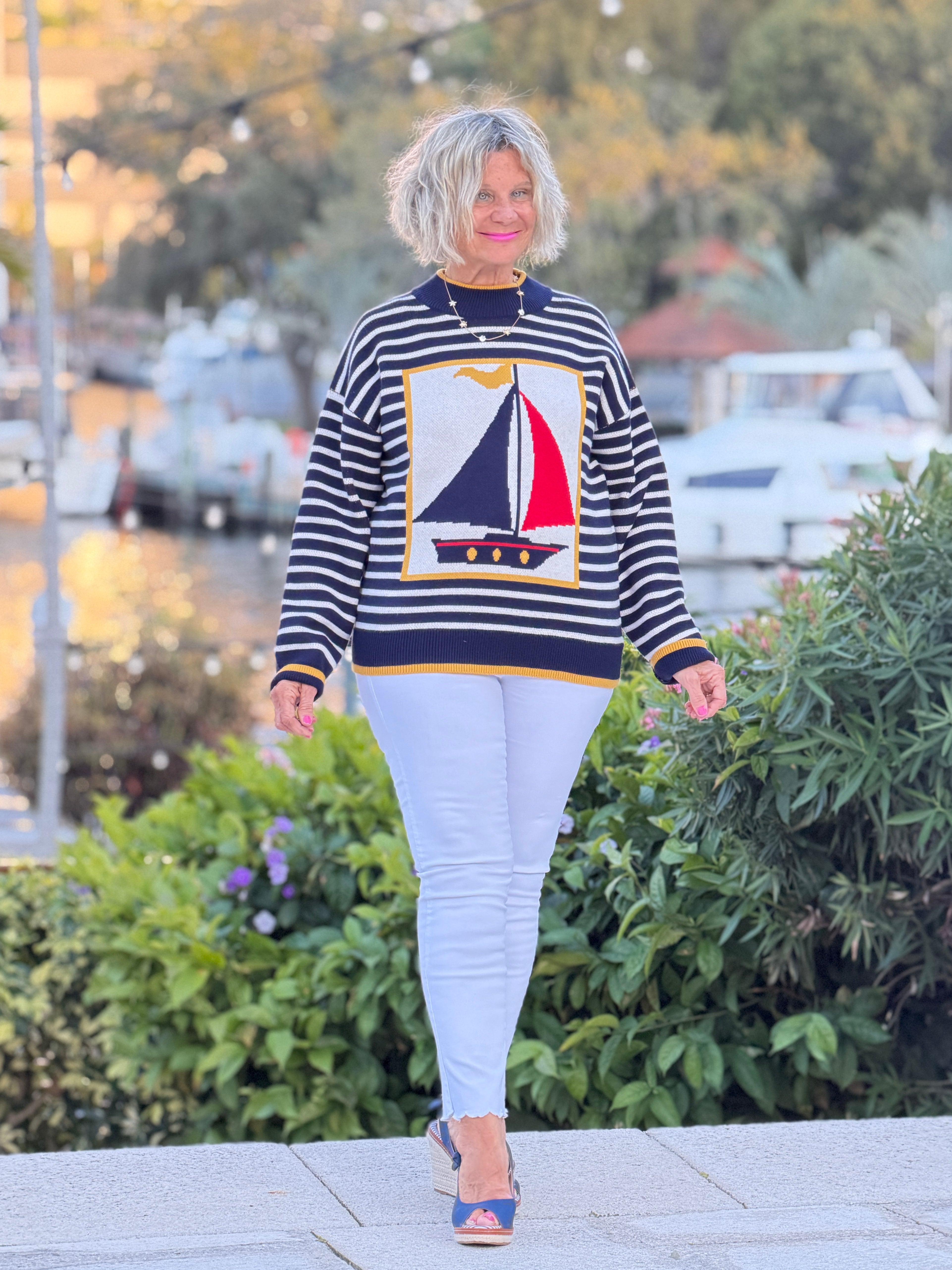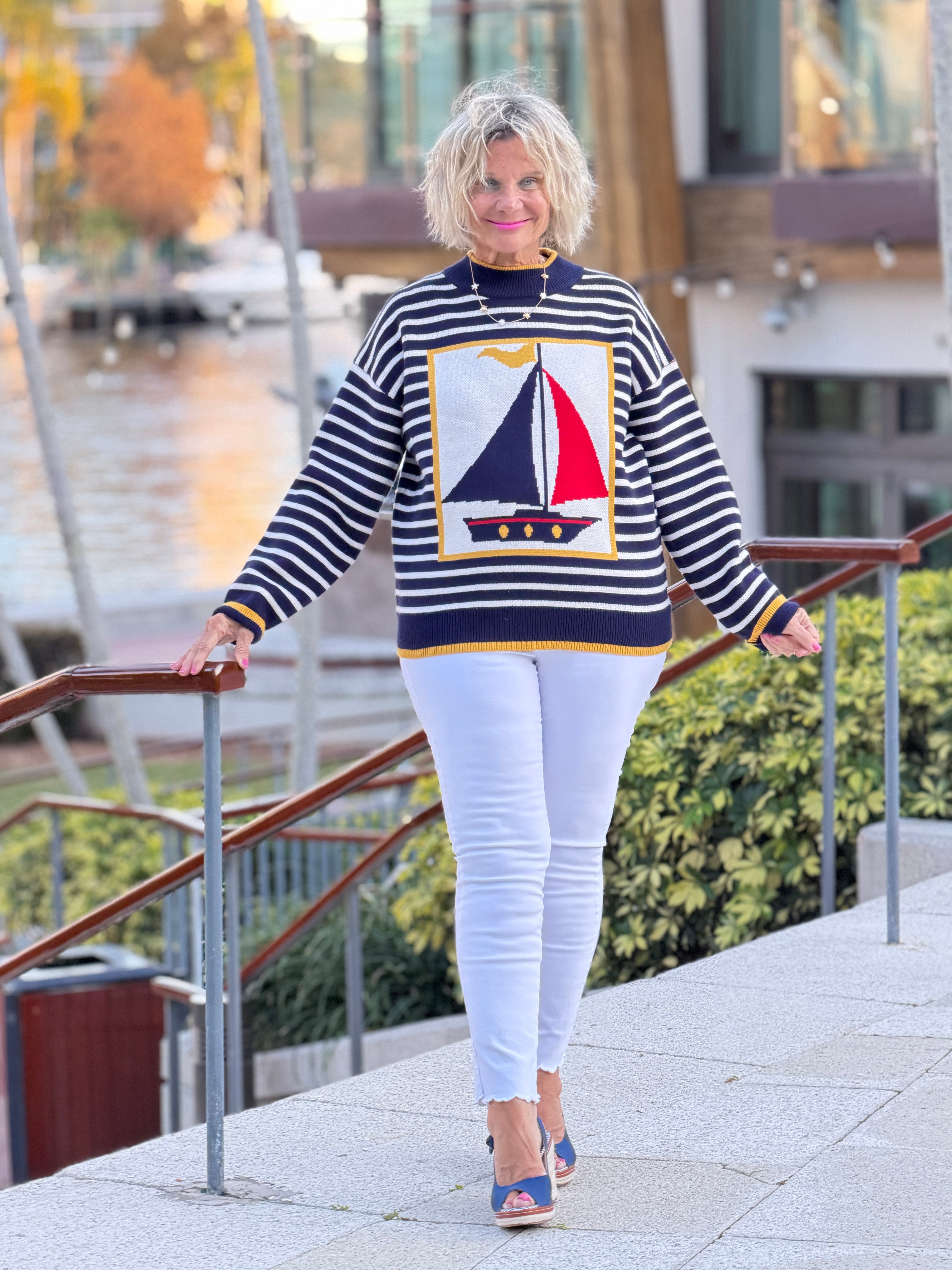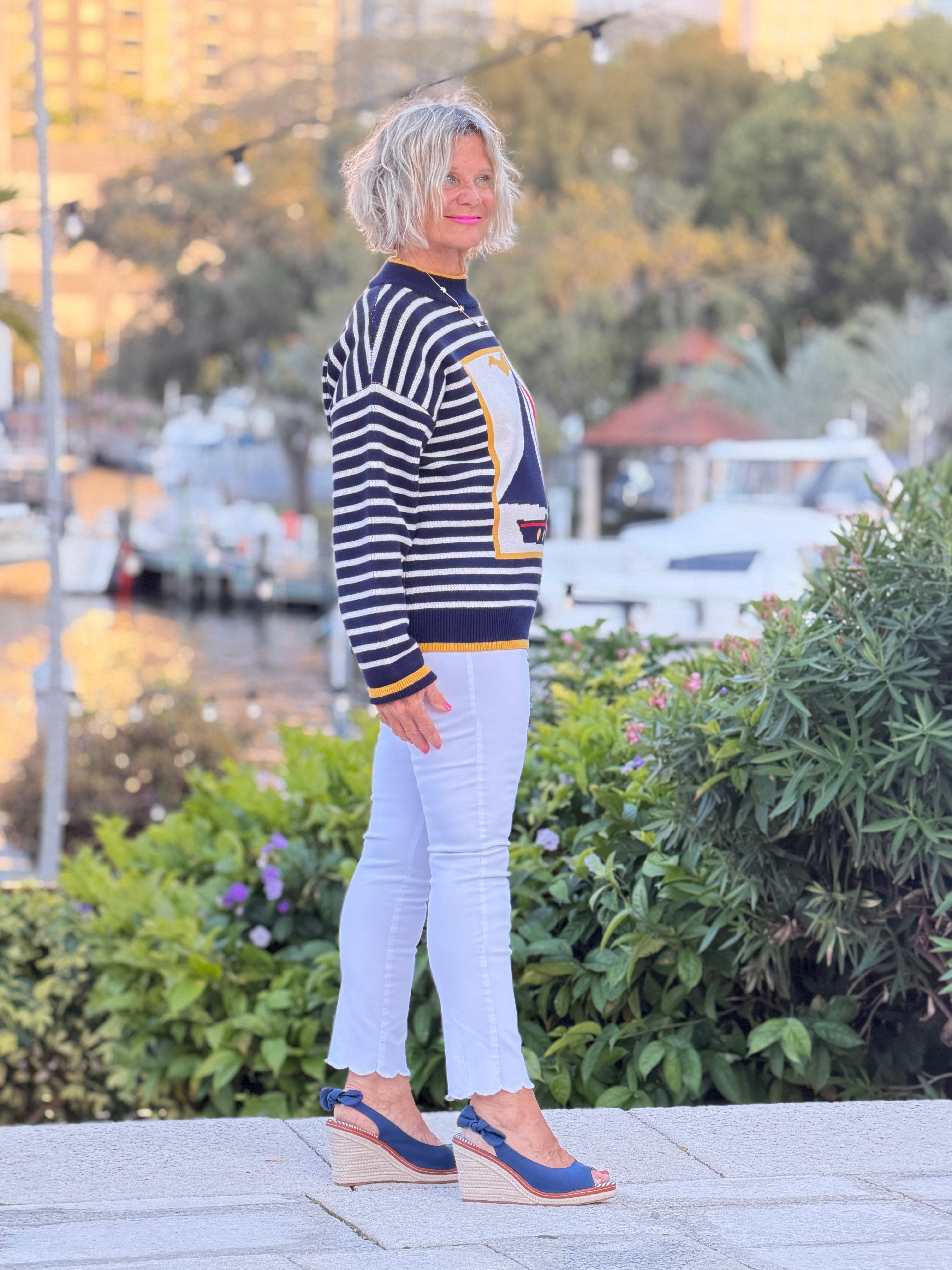 Crewneck Nautical Stripe Jacquard Sweater Top Fabric: 50% Viscose 26% Polyester 24% Nylon