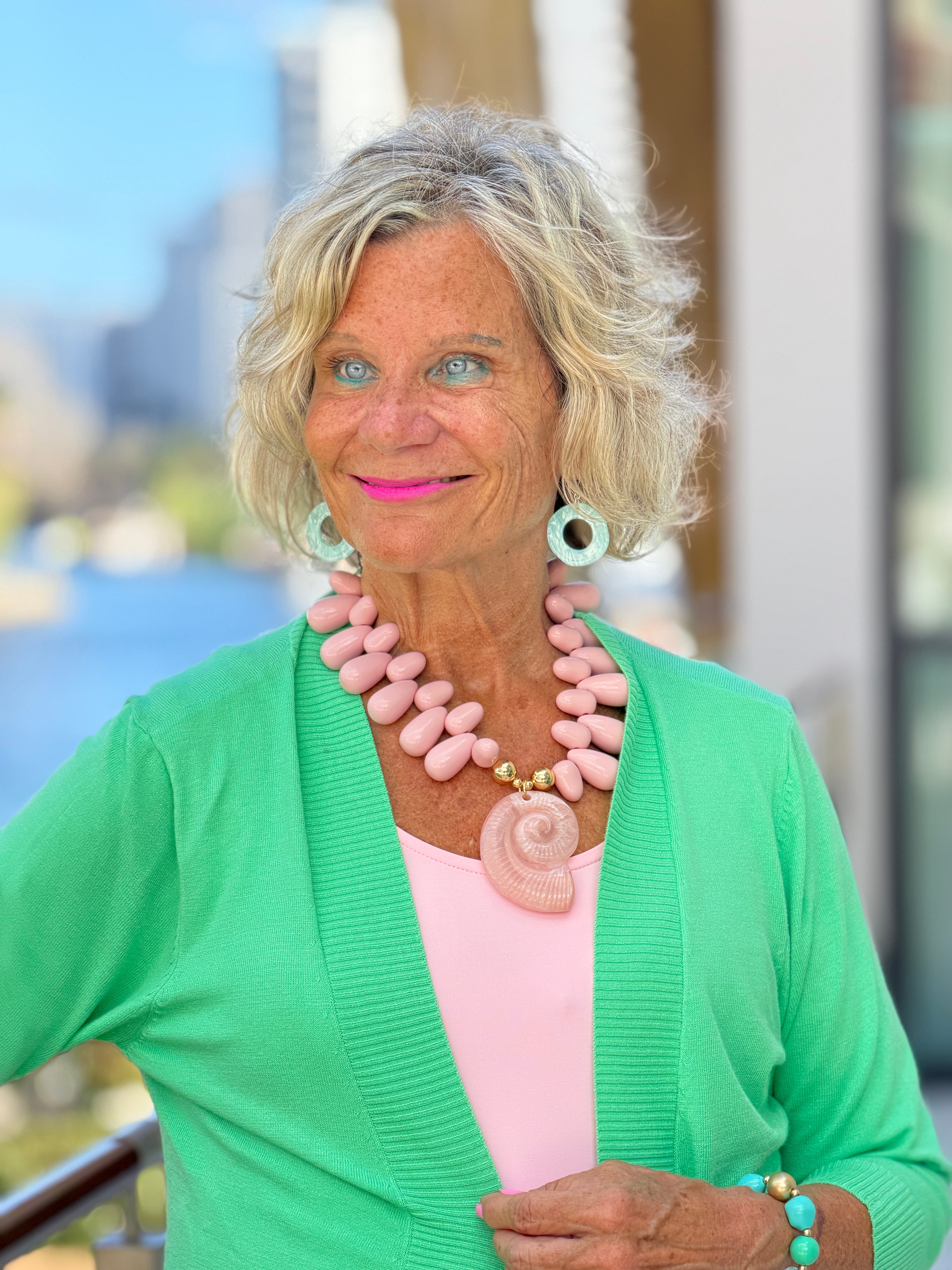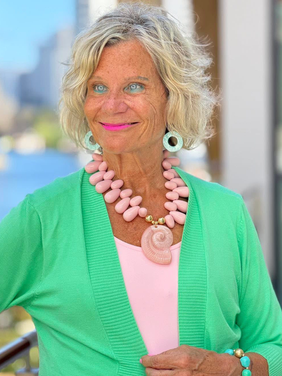 A soft coastal statement necklace featuring smooth blush beads and a beautiful shell pendant centerpiece. This feminine seaside piece adds the perfect pop of beach-inspired elegance to any outfit.