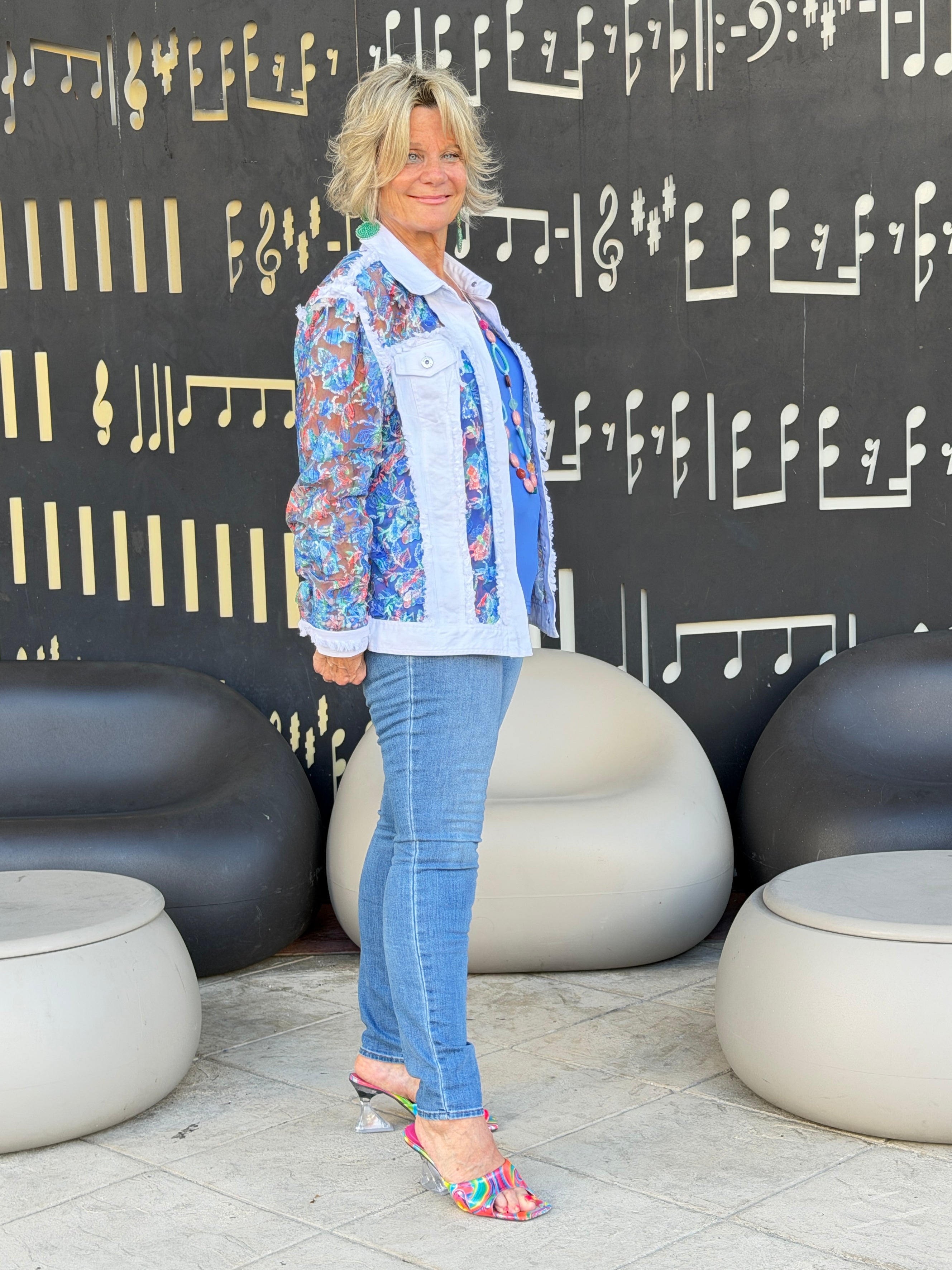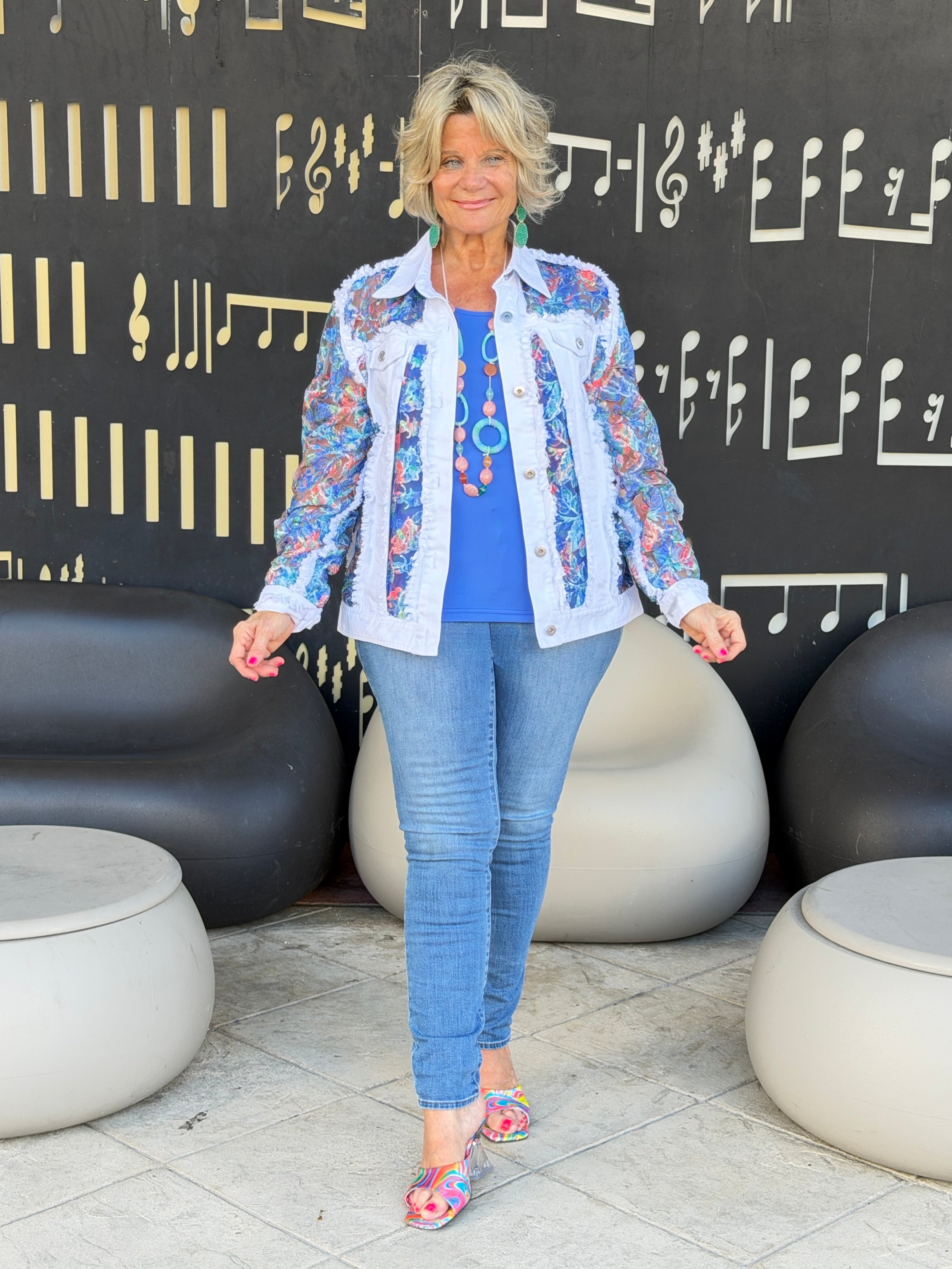 This stunning statement jacket is a must have for 2026! Get ready to collect compliments wherever your wear this artfully designed piece. Delicate floral insets mix with a traditional denim jacket.