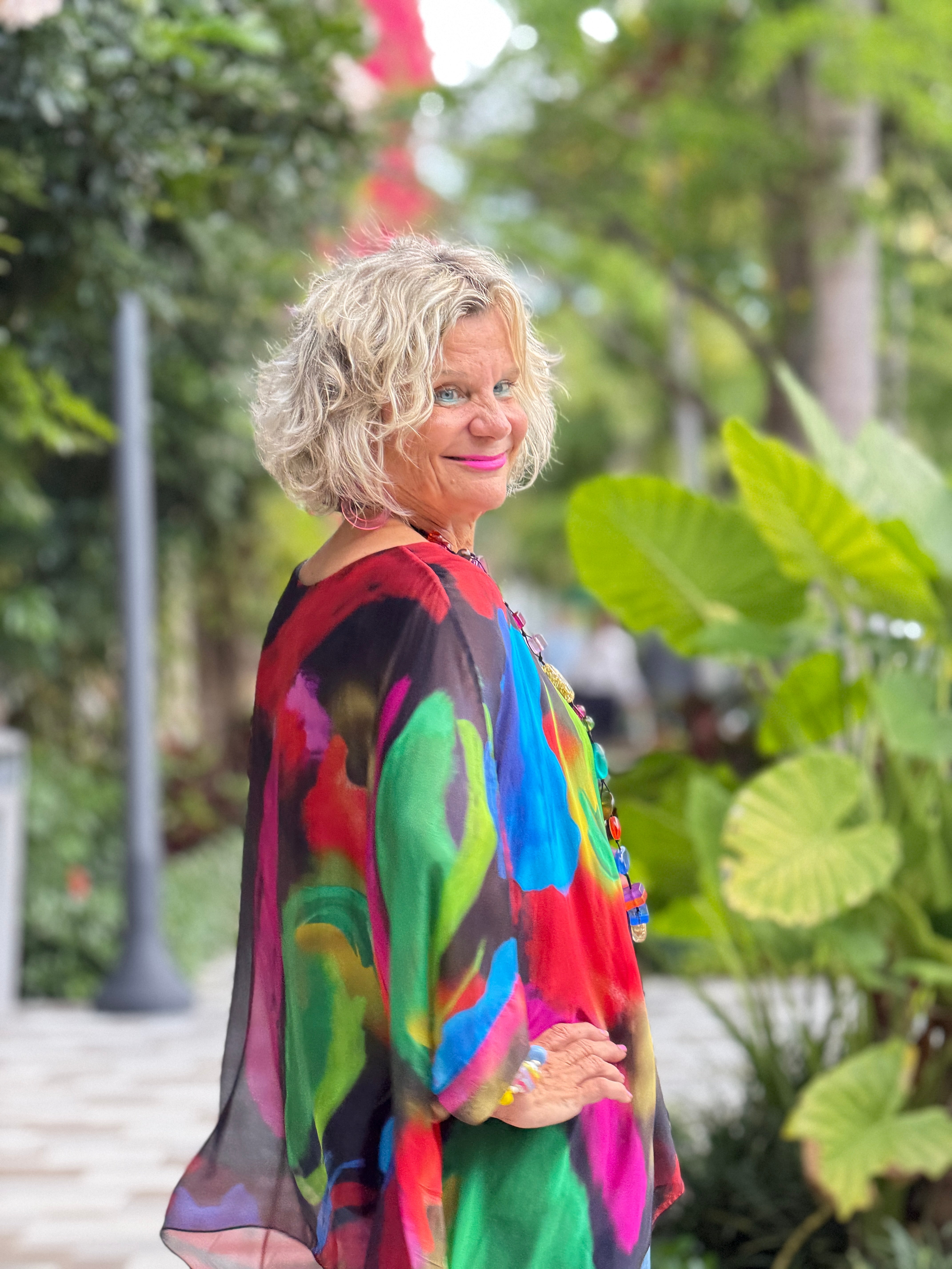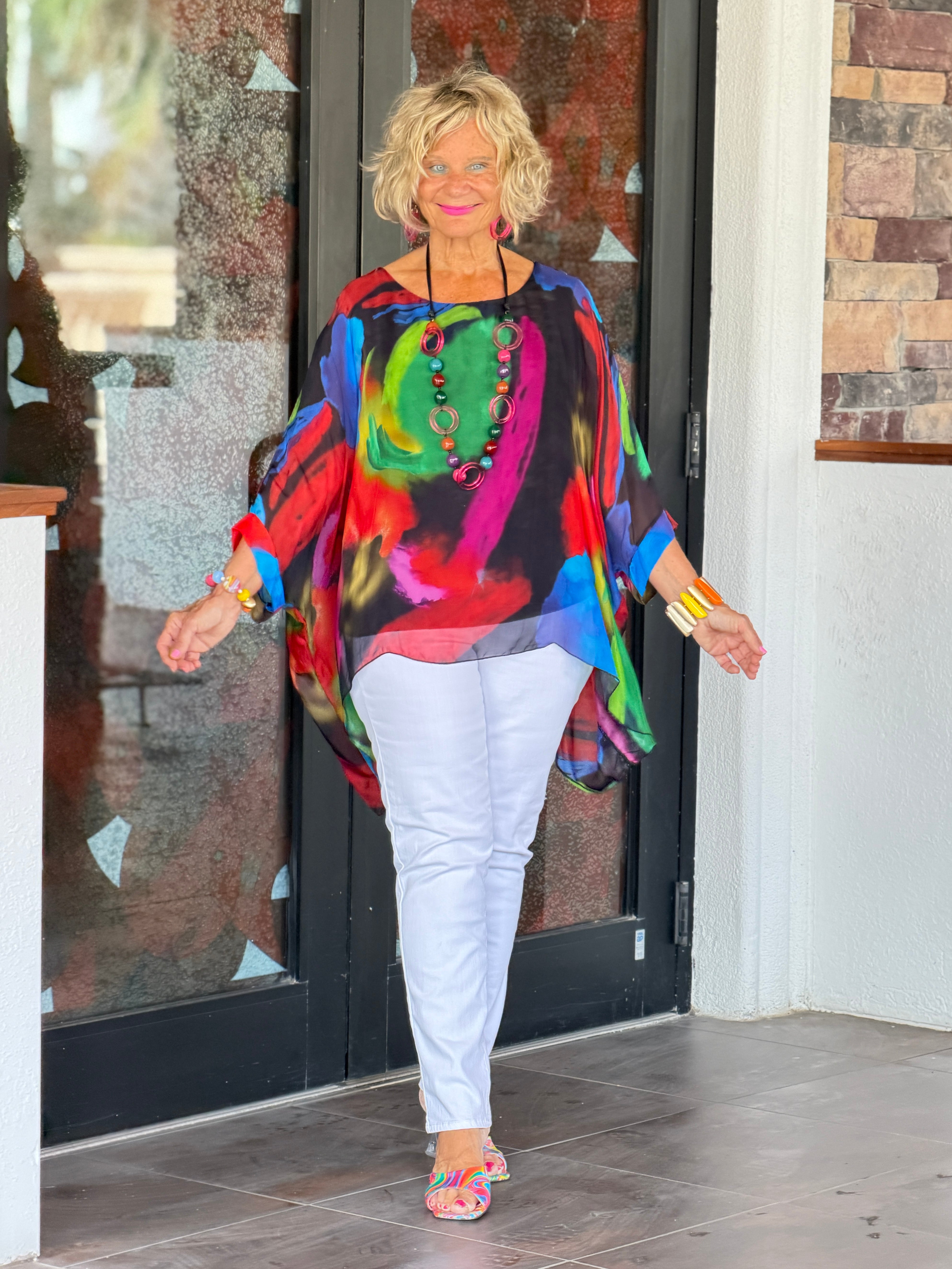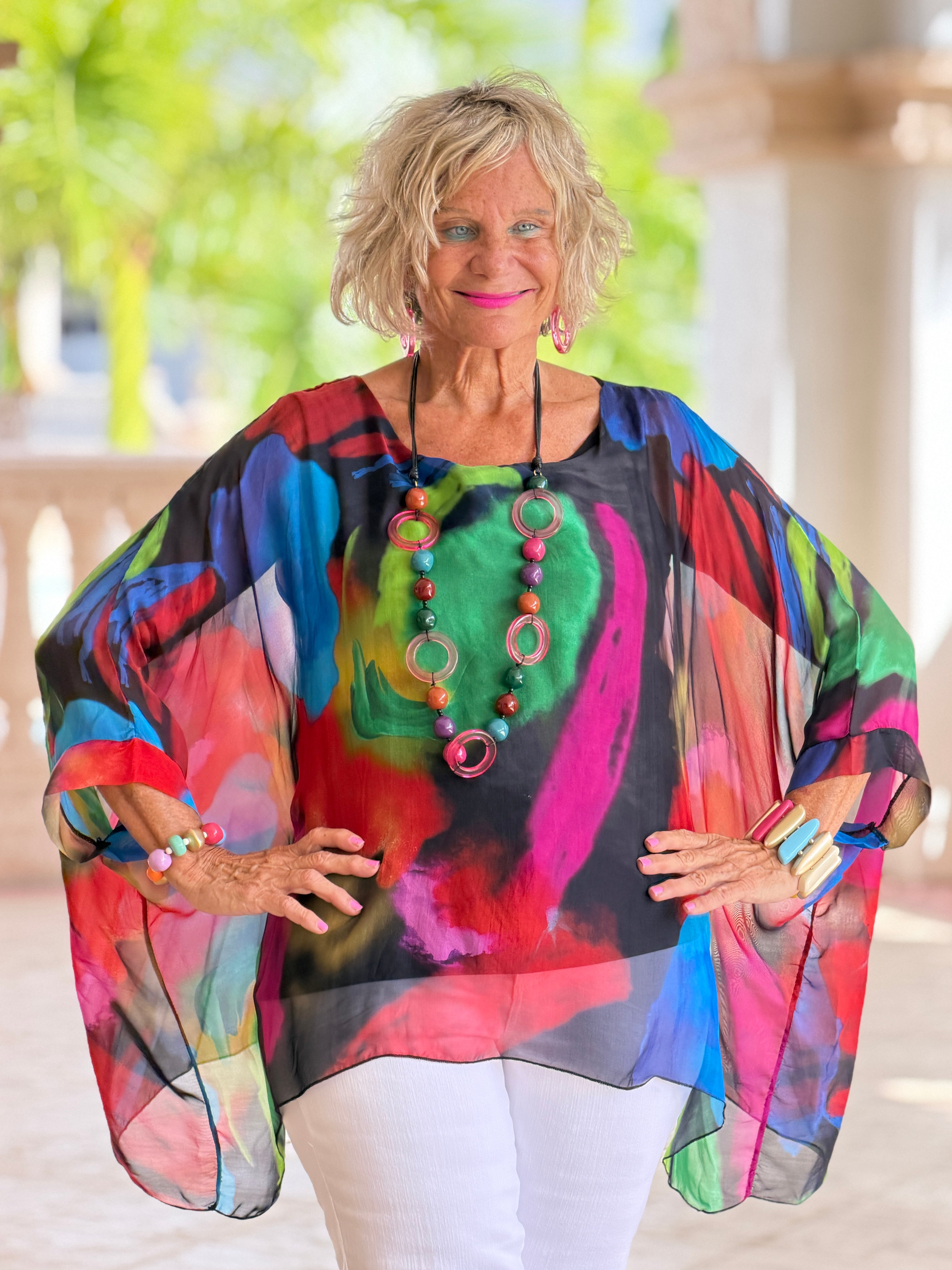 Our best-selling Sofia Kaftan in a show stopping Sunrise print!  A Bright color palette adds some sizzle to hot summer days and nights!  A simple white pant makes these prints pop, but don’t hesitate to pair with a color in the print as a solid bottom.  Sheer ¾ sleeves highlight the gorgeous print as well as your shape.  You’ll love the easy Kaftan fit and buttery viscose lining that make this style so popular.  Made in Italy. •