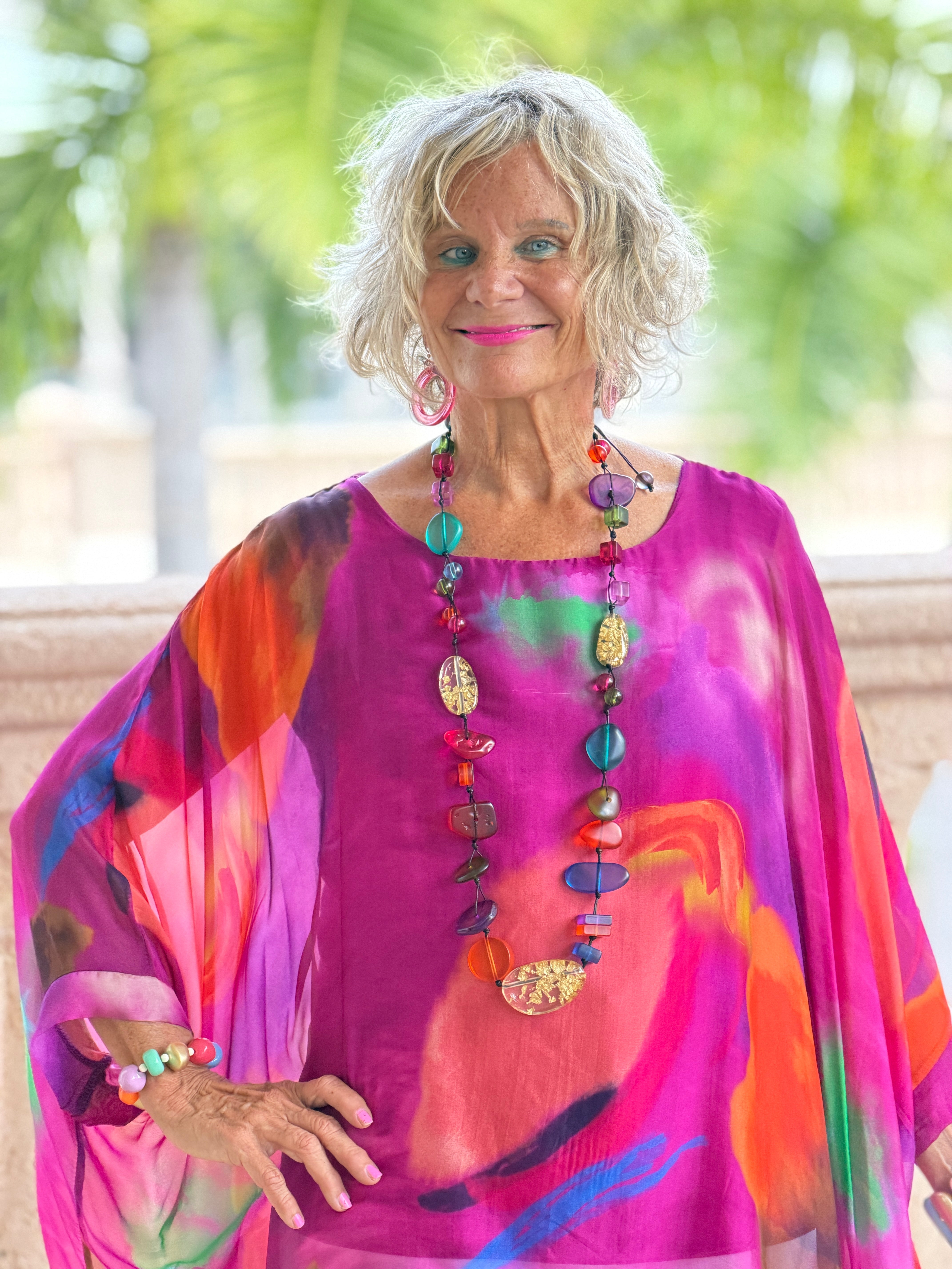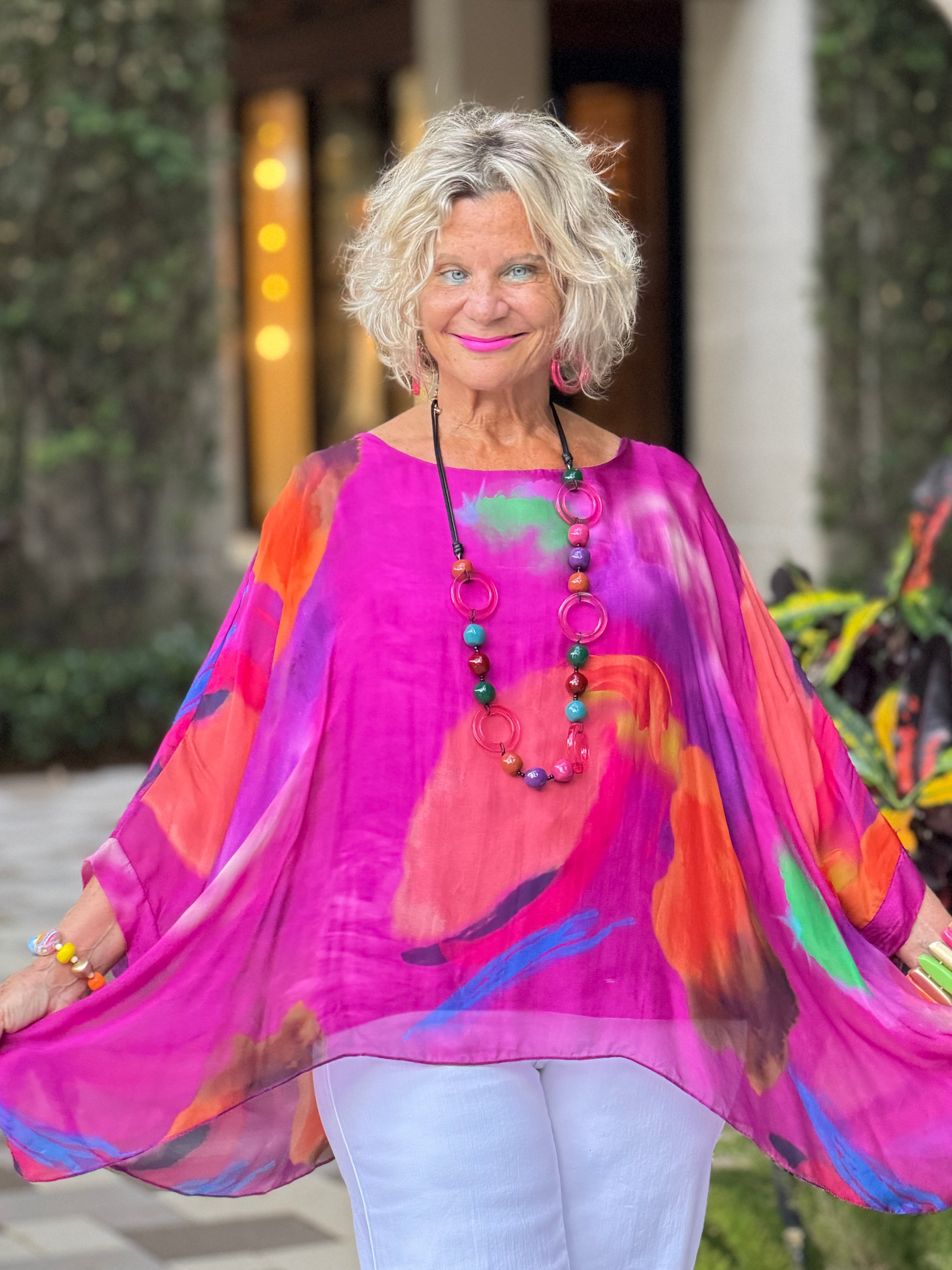 Our best-selling Sofia Kaftan in a show stopping Sunrise print! A Bright color palette adds some sizzle to hot summer days and nights! A simple white pant makes these prints pop, but don’t hesitate to pair with a color in the print as a solid bottom. Sheer ¾ sleeves highlight the gorgeous print as well as your shape. You’ll love the easy Kaftan fit and buttery viscose lining that make this style so popular. Made in Italy. •