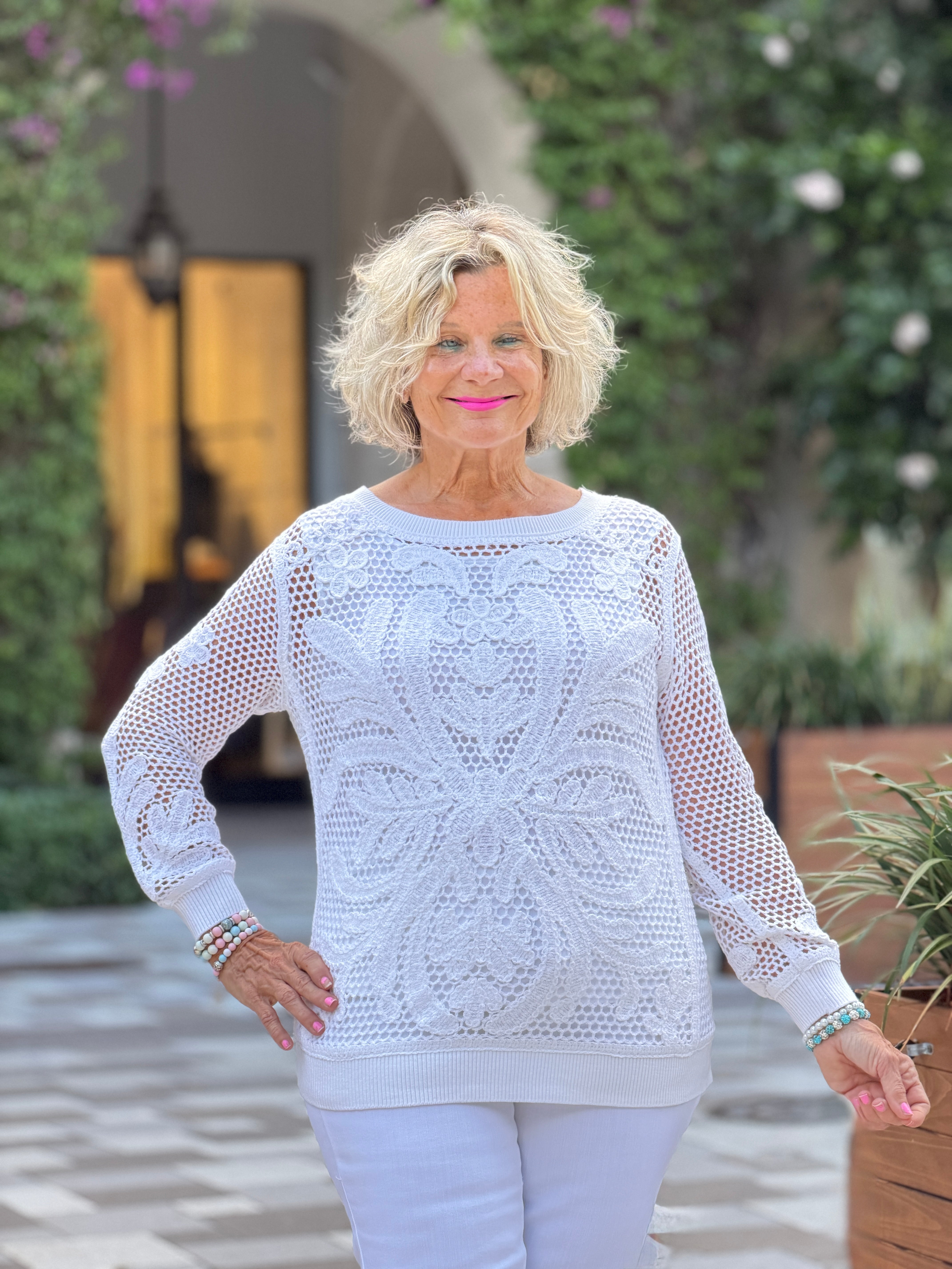 Light and lovely, this open crochet sweater layers a patterned stitch over a built-in tank liner for easy wear. Ribbed trim at the neckline, cuffs, and hem adds structure to the breezy long sleeve silhouette.