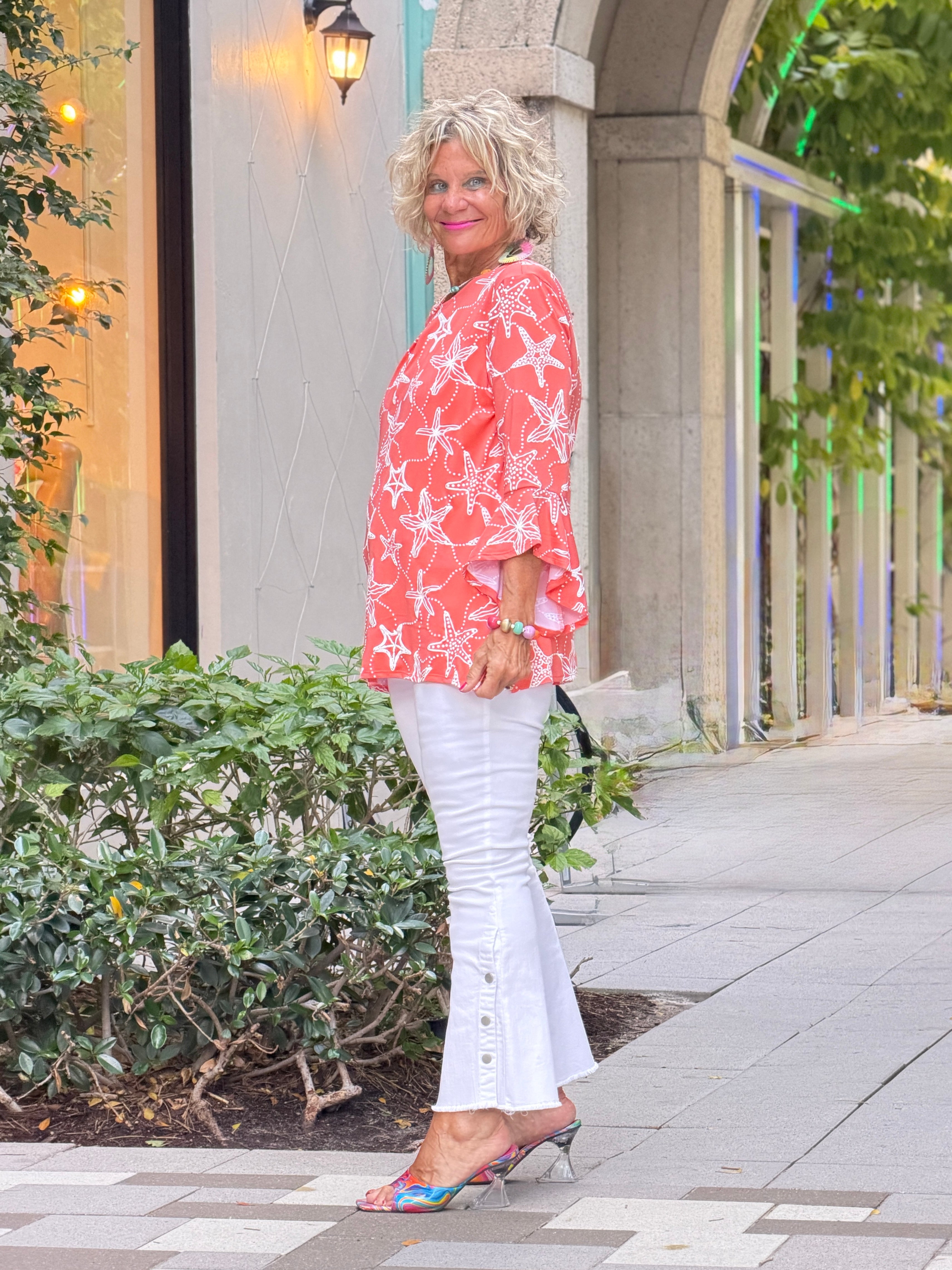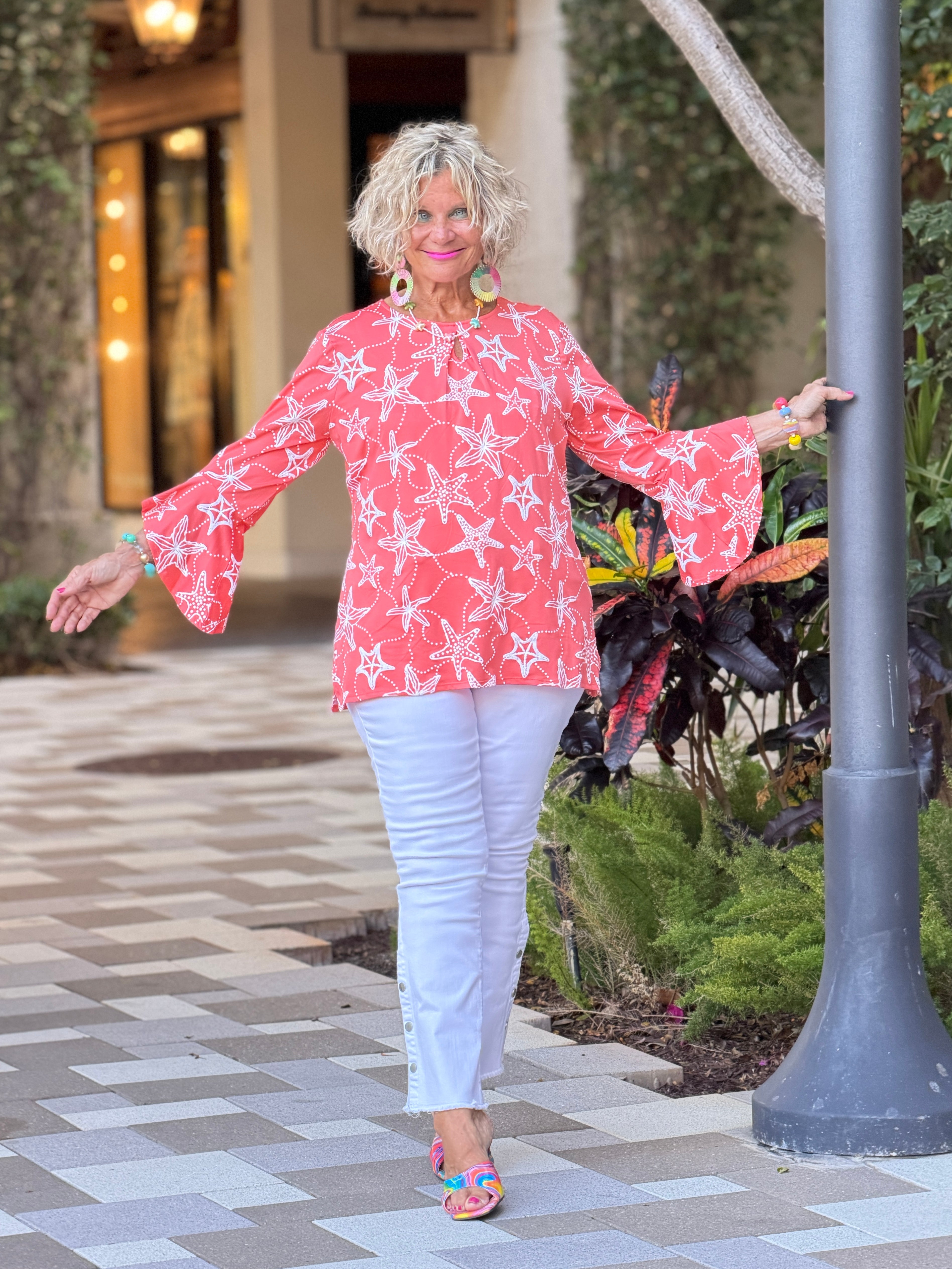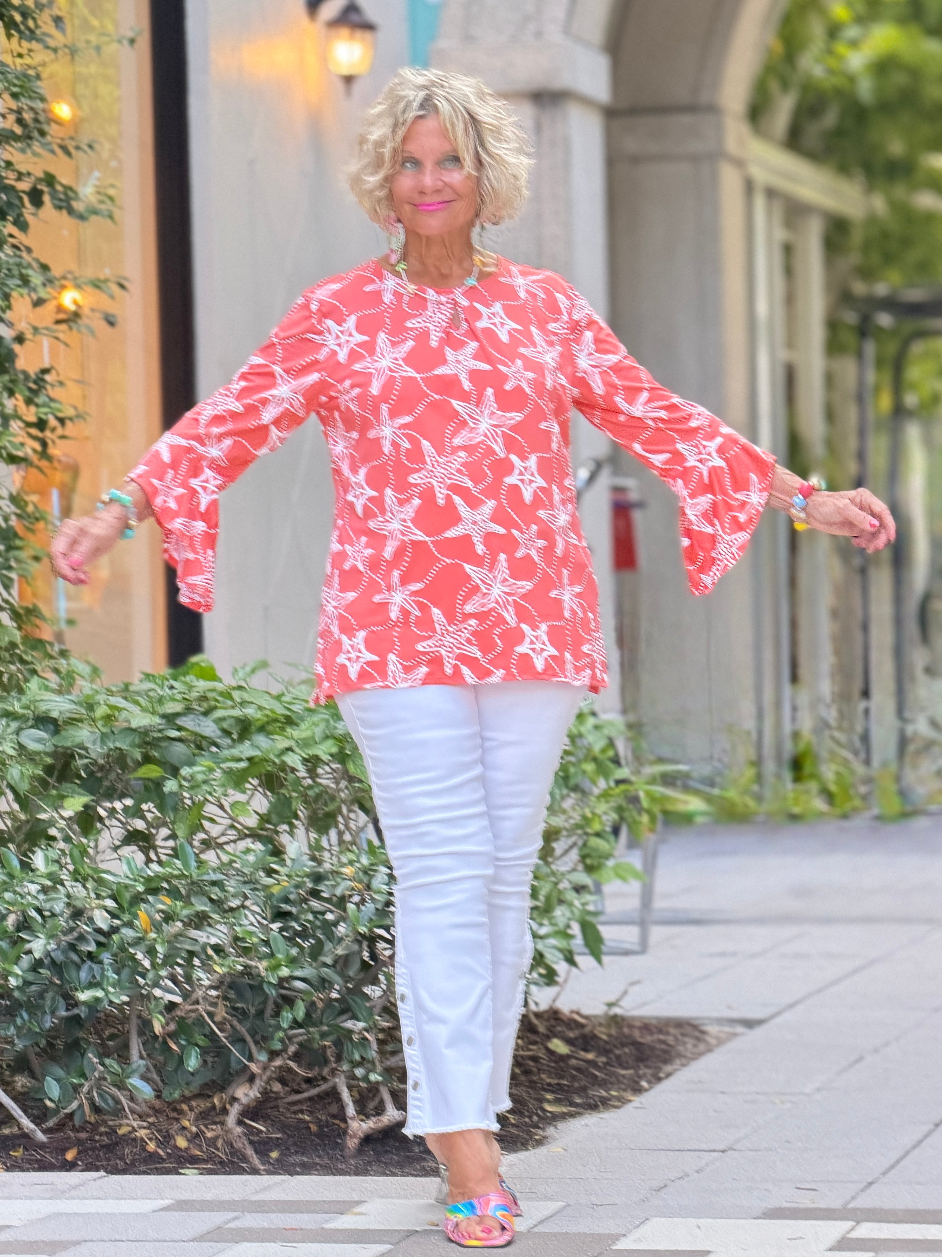 Playful and textured, this starfish puff print knit top brings a fresh take on coastal-inspired style. The keyhole neckline adds a feminine touch, while flutter sleeves create soft movement through the arms. Raised puff print details give the design dimension you can see and feel. A fun, easy top that pairs beautifully with denim or pull-on pants.