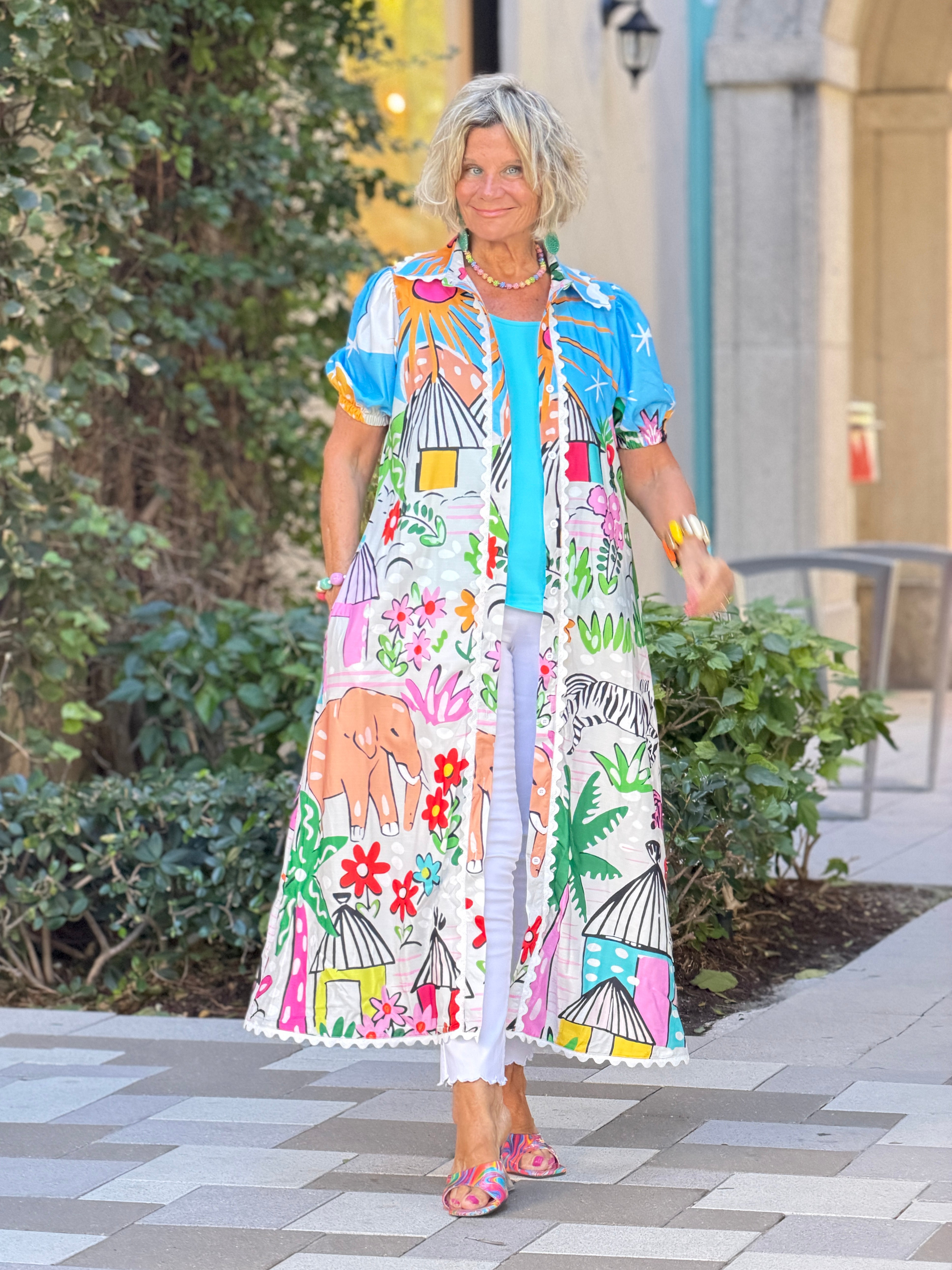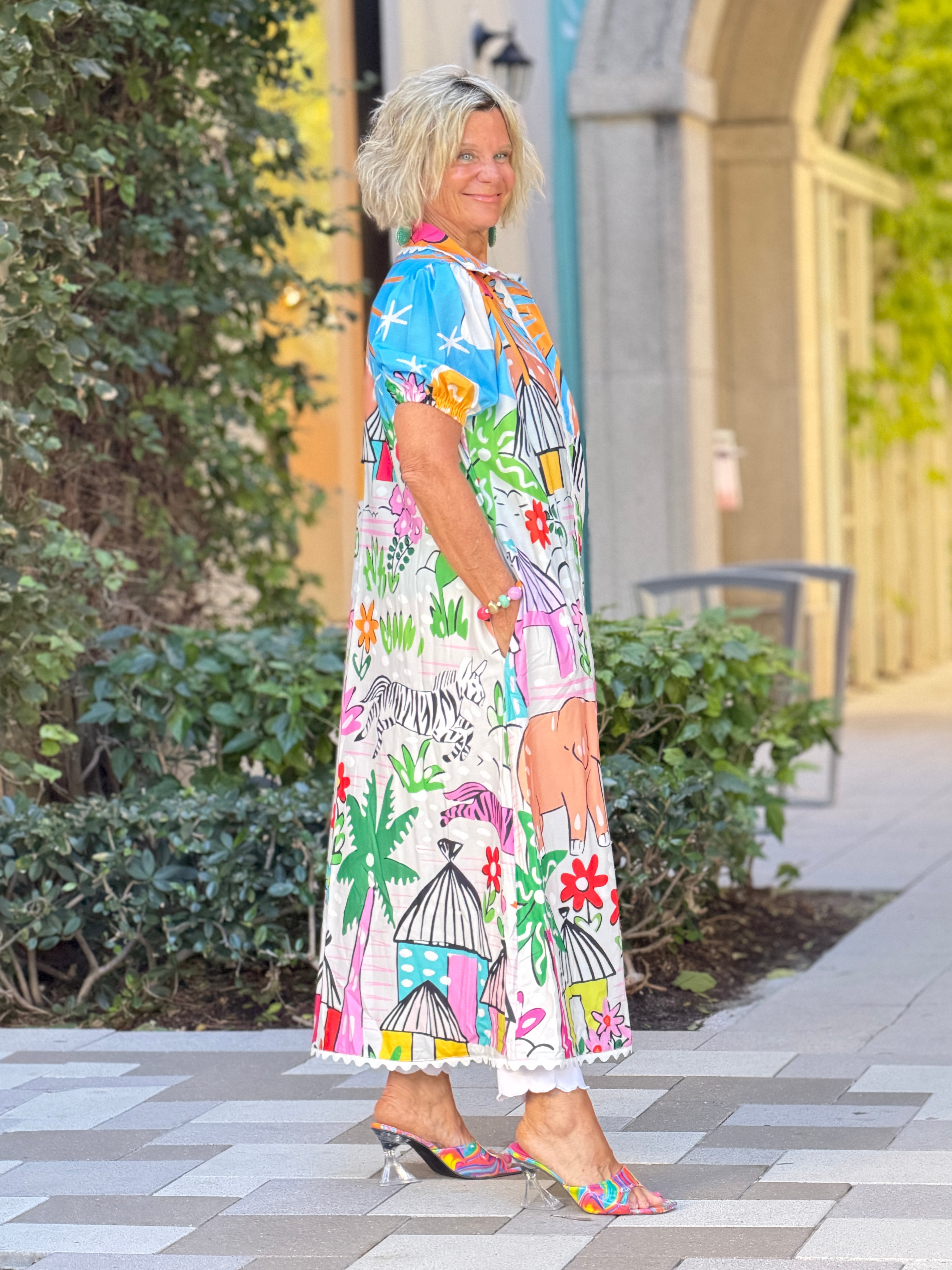 Maxi dress with button front and playful graphic prints throughout. Features short sleeves and side pockets. Ideal for relaxed summer statements. Cathy is wearing a medium, she thinks it runs on the roomy size.