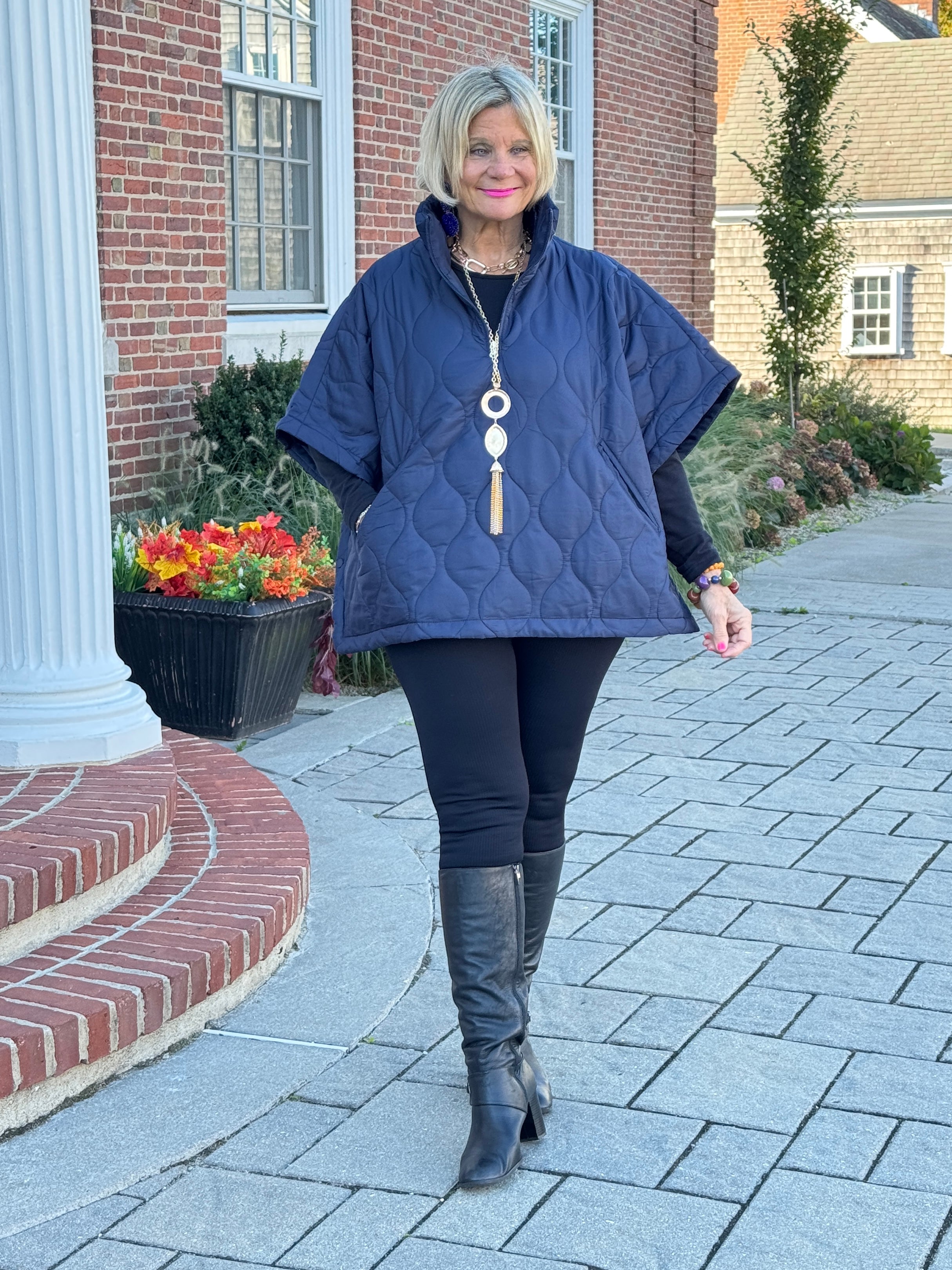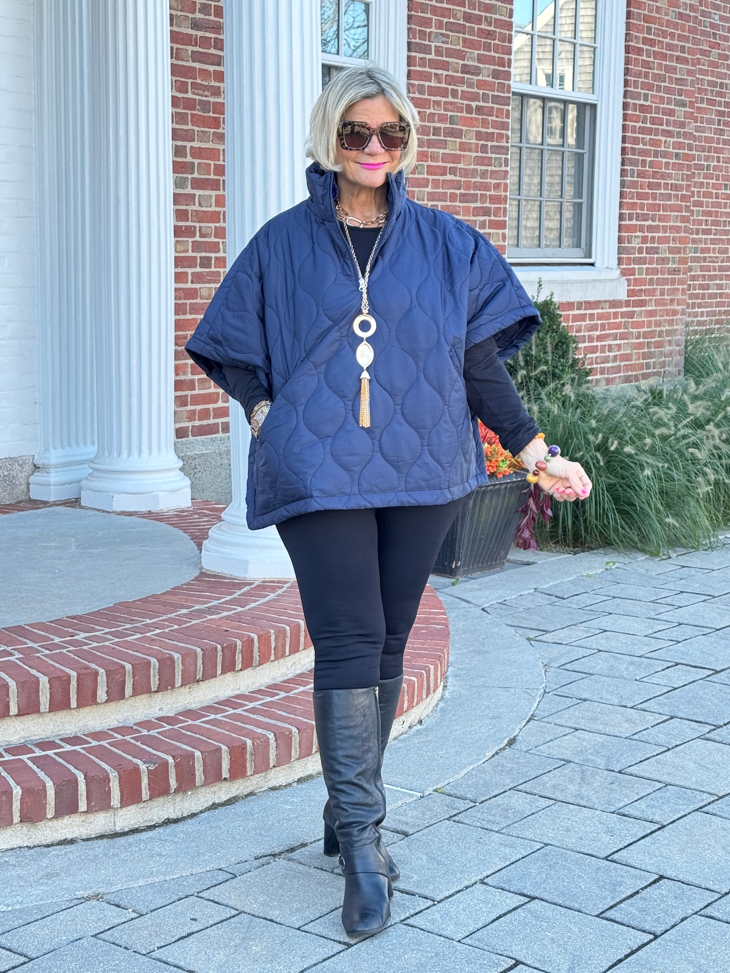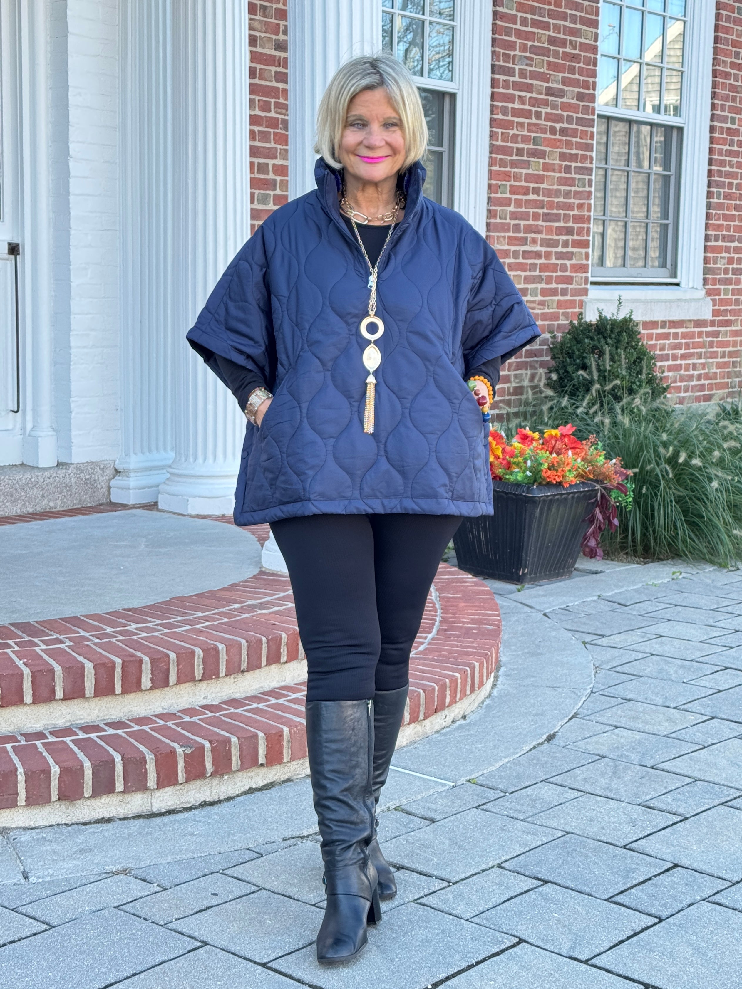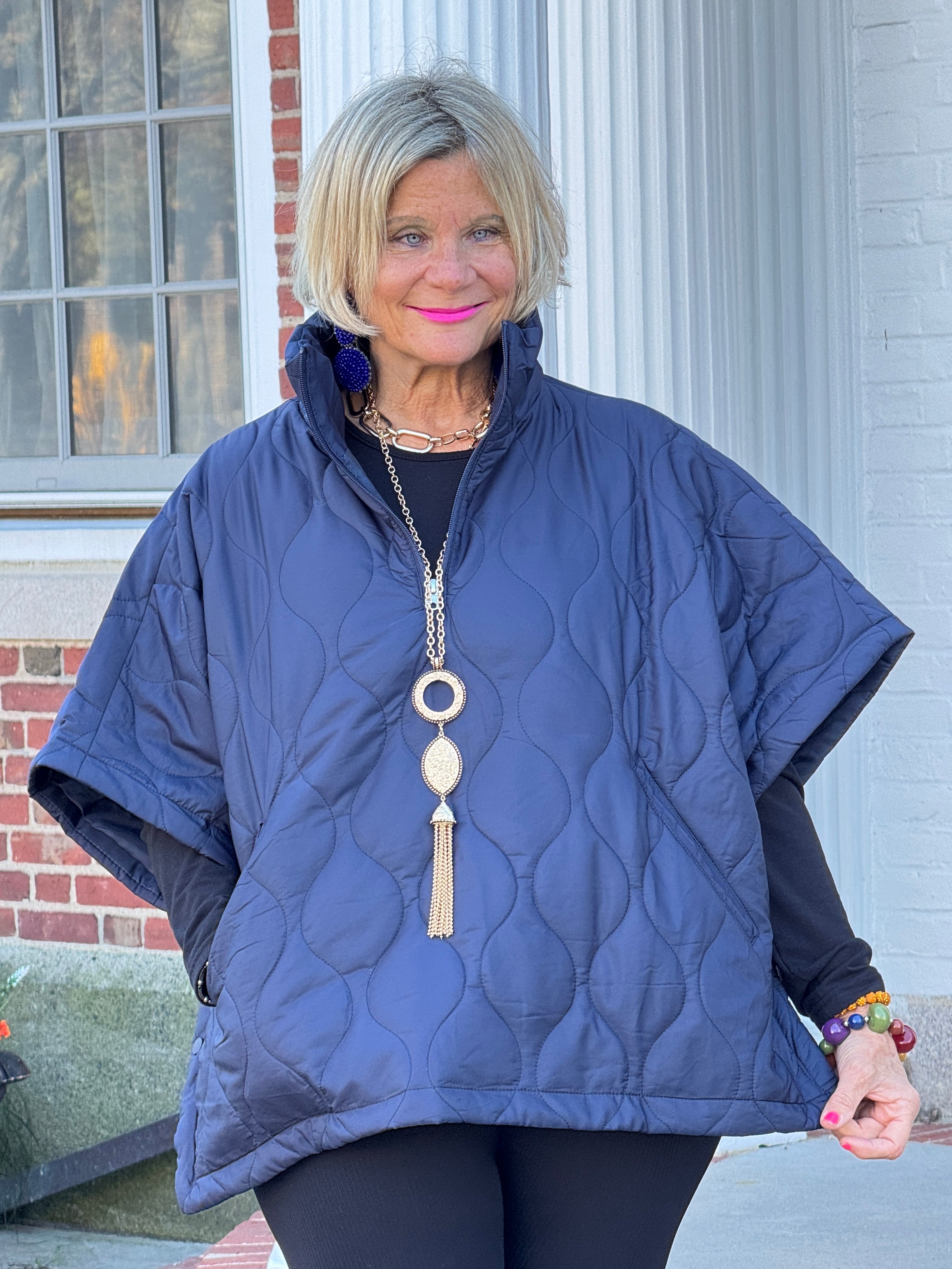 Quilted Short Sleeves Puffer Pullover Poncho Navy