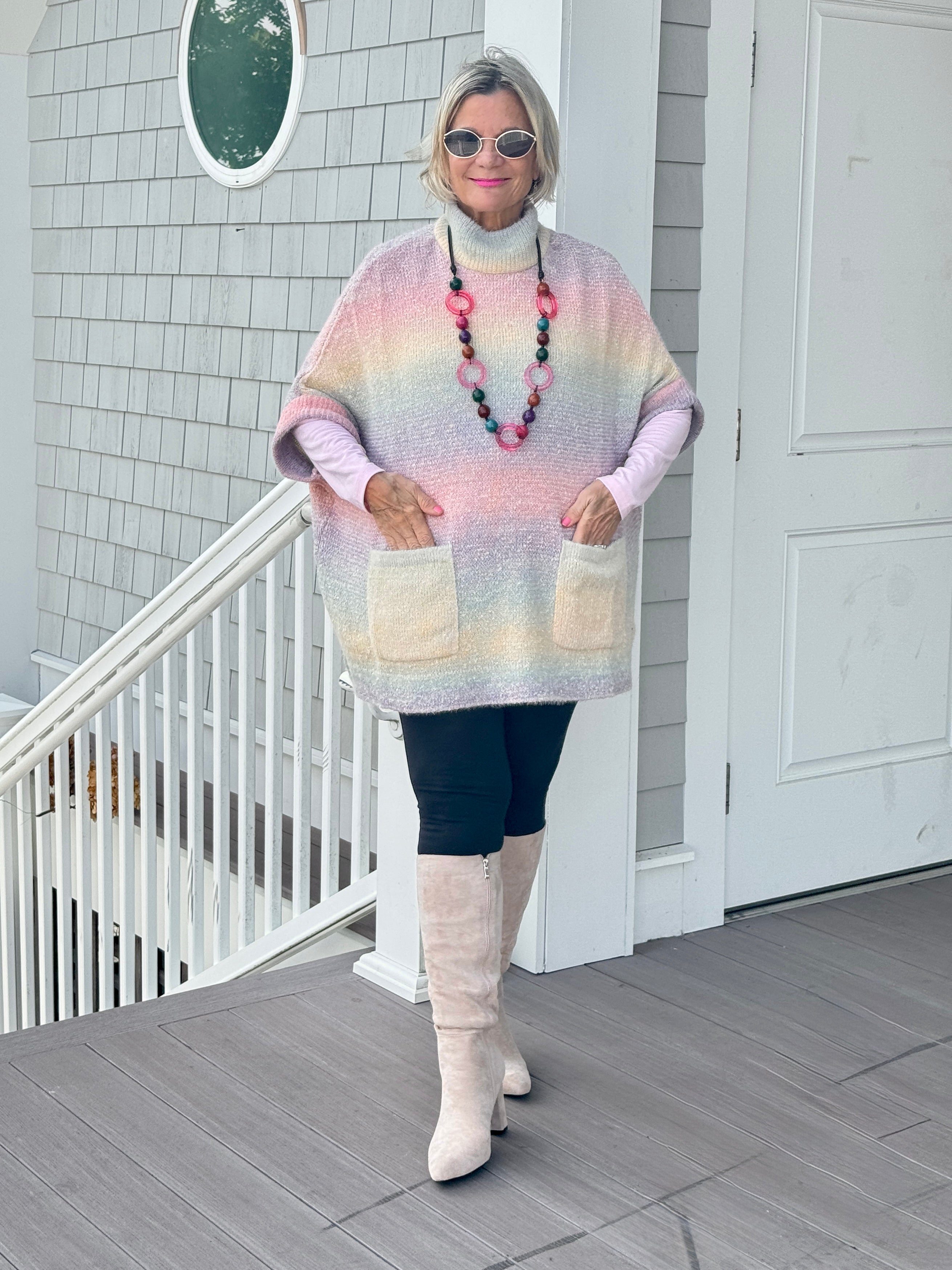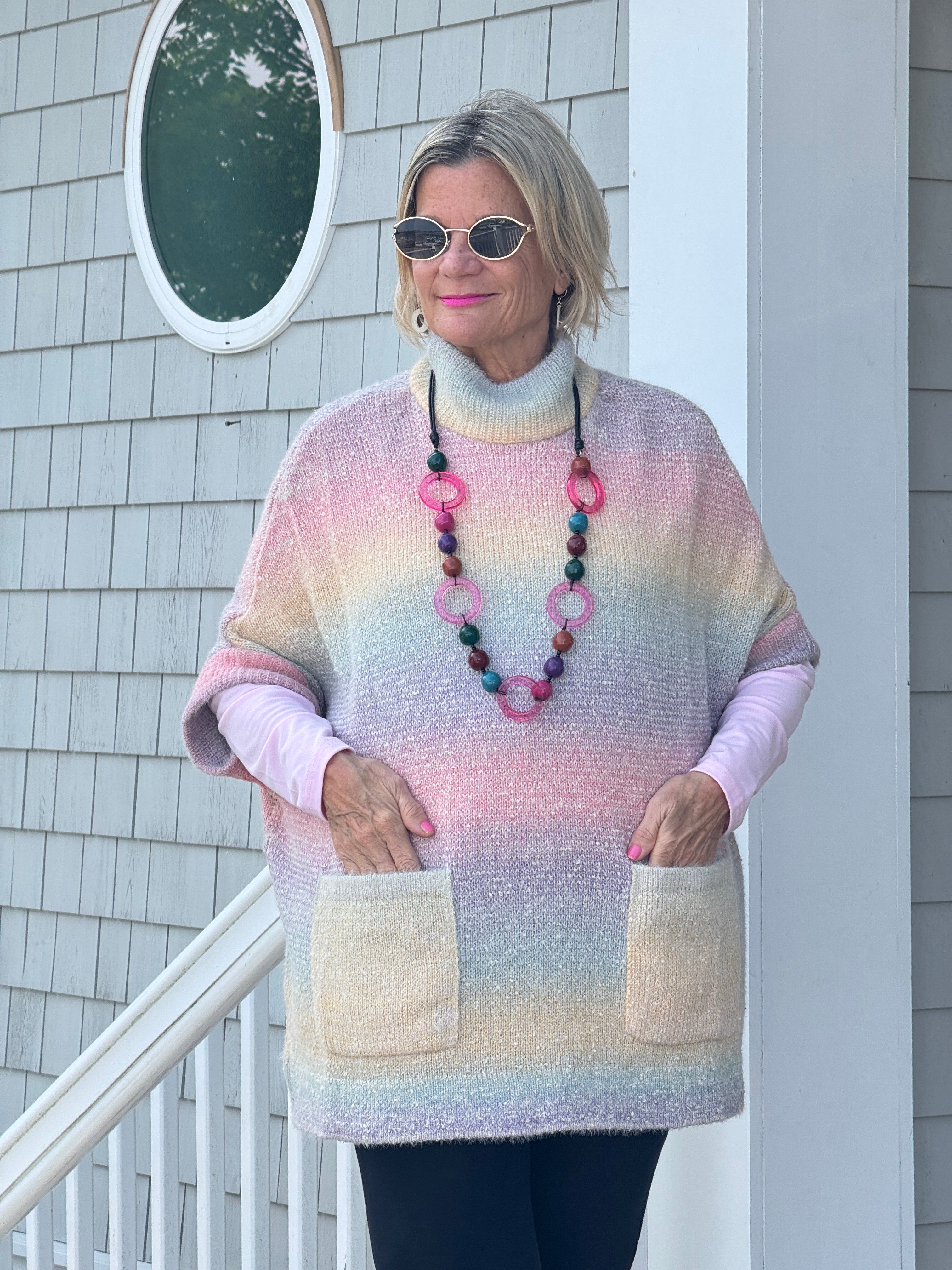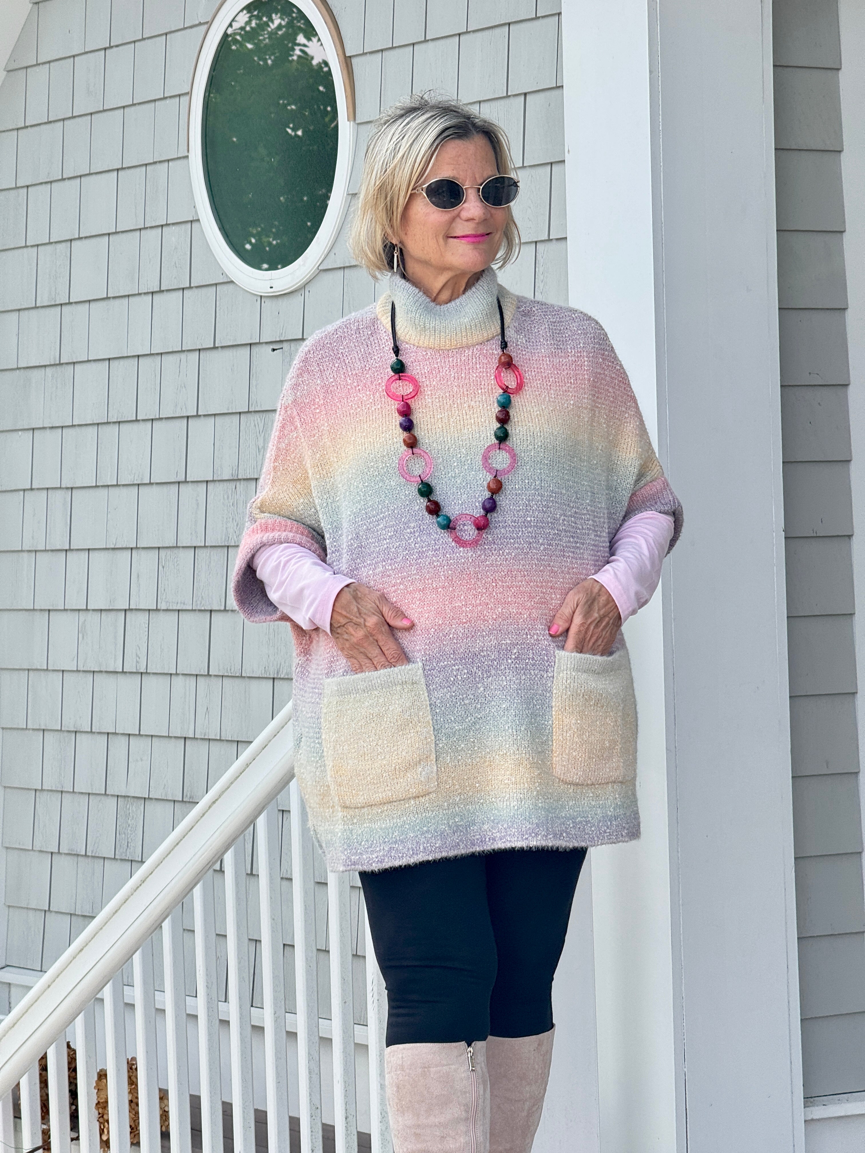 • Embrace effortless style with this pastel gradient poncho sweater featuring a relaxed fit, soft textured knit, and convenient front pockets. Perfect for layering and adding warmth to any casual outfit while maintaining a chic, laid-back look for everyday wear or lounging in com