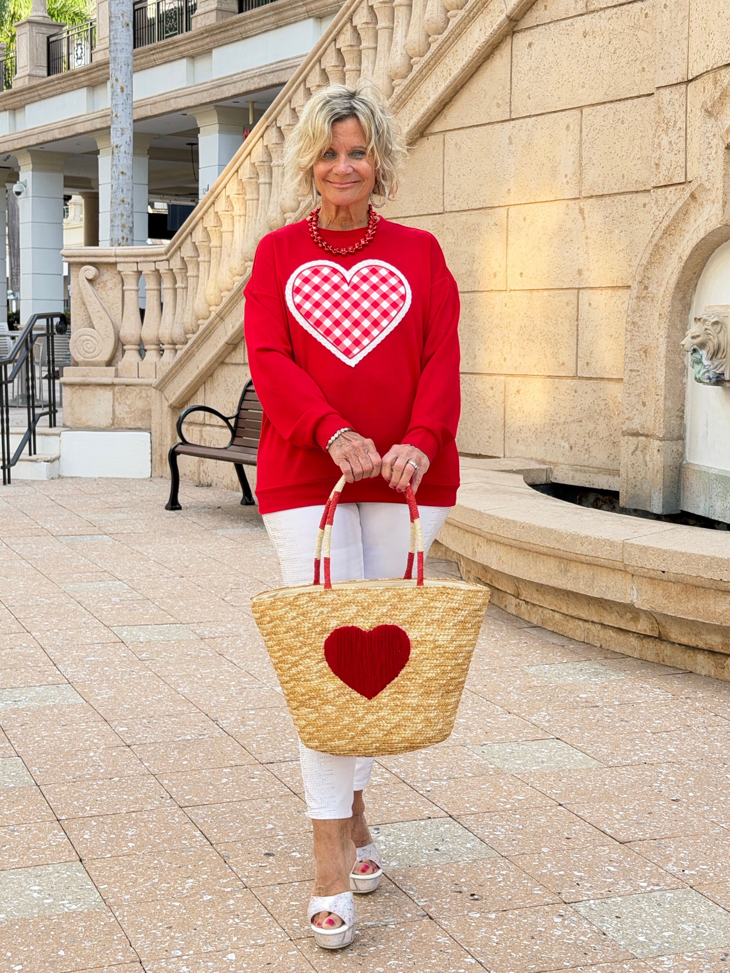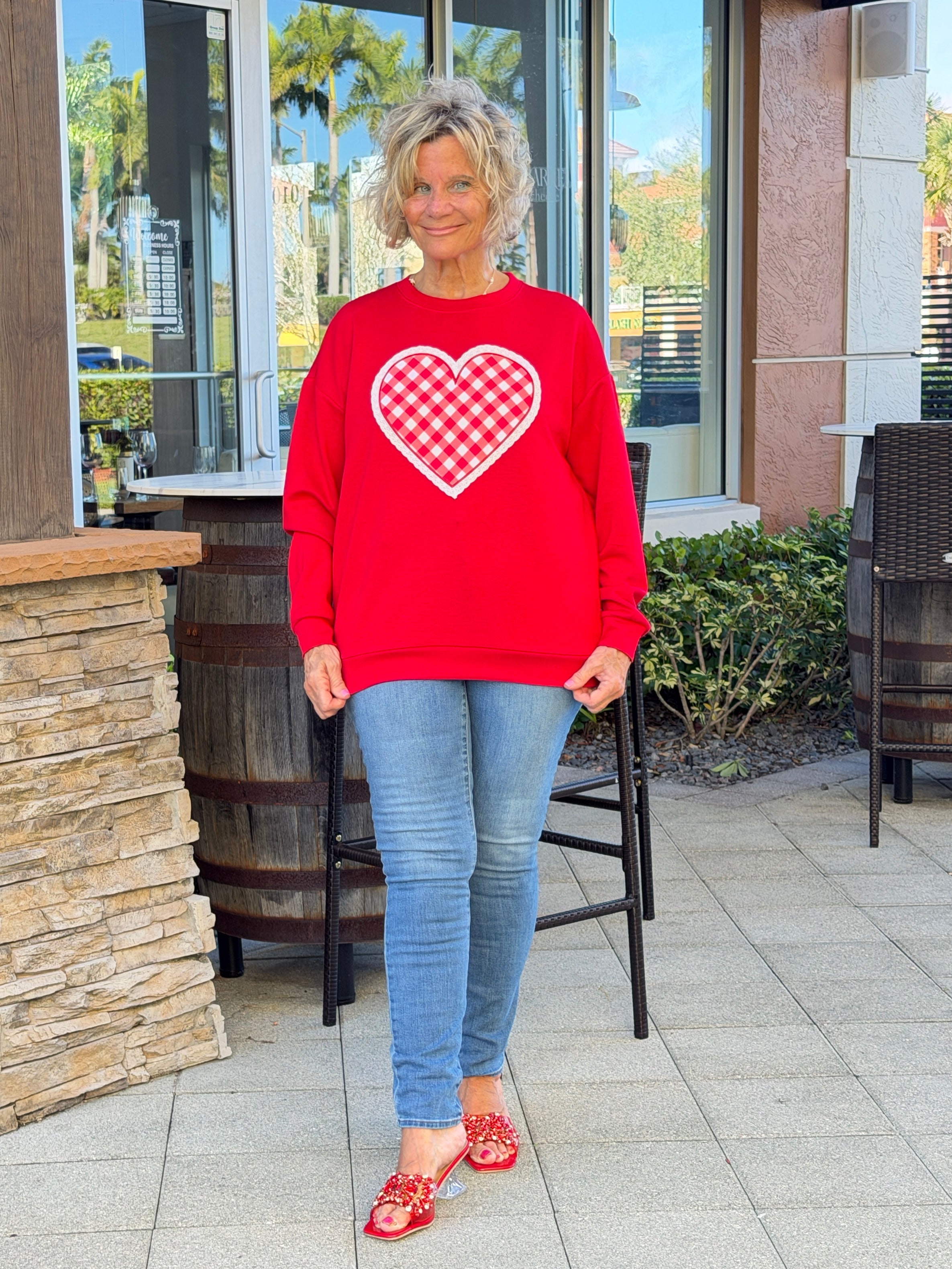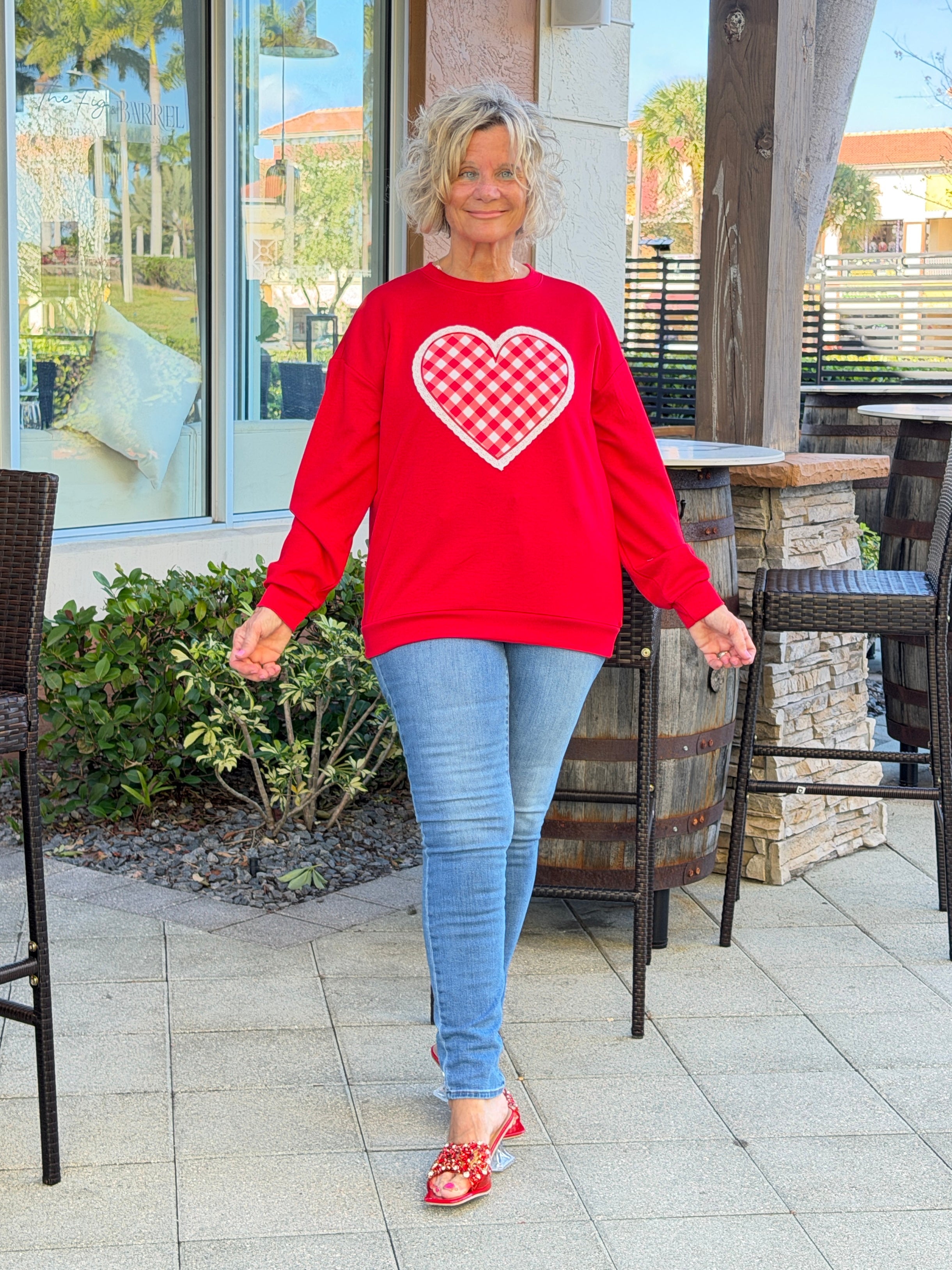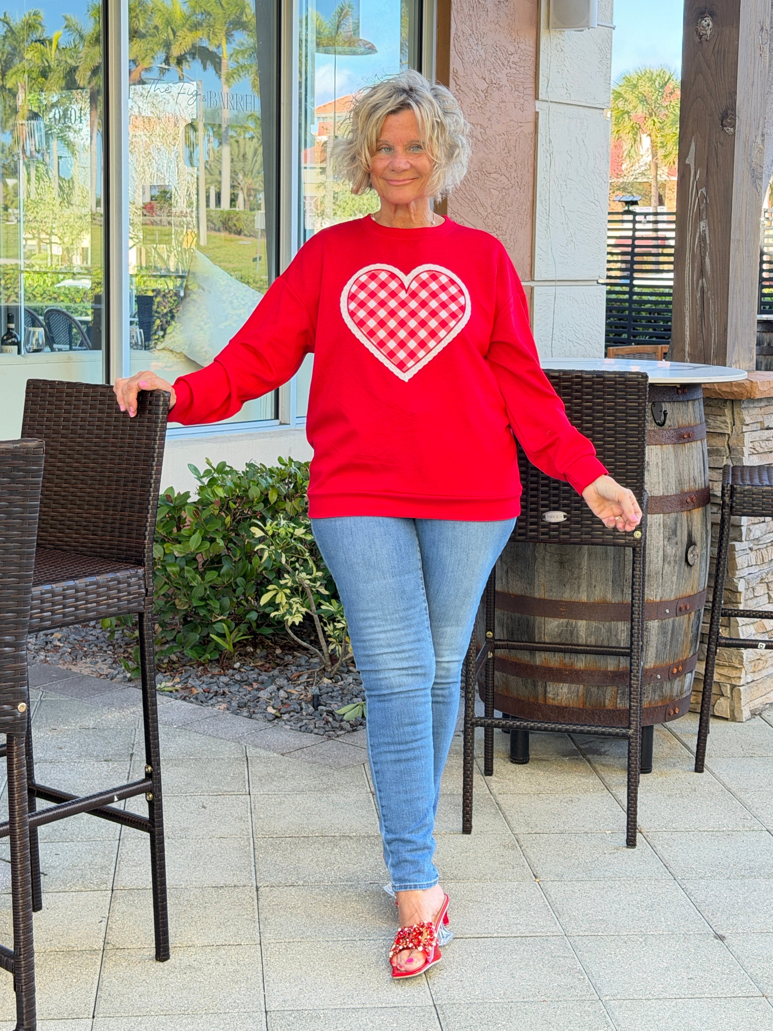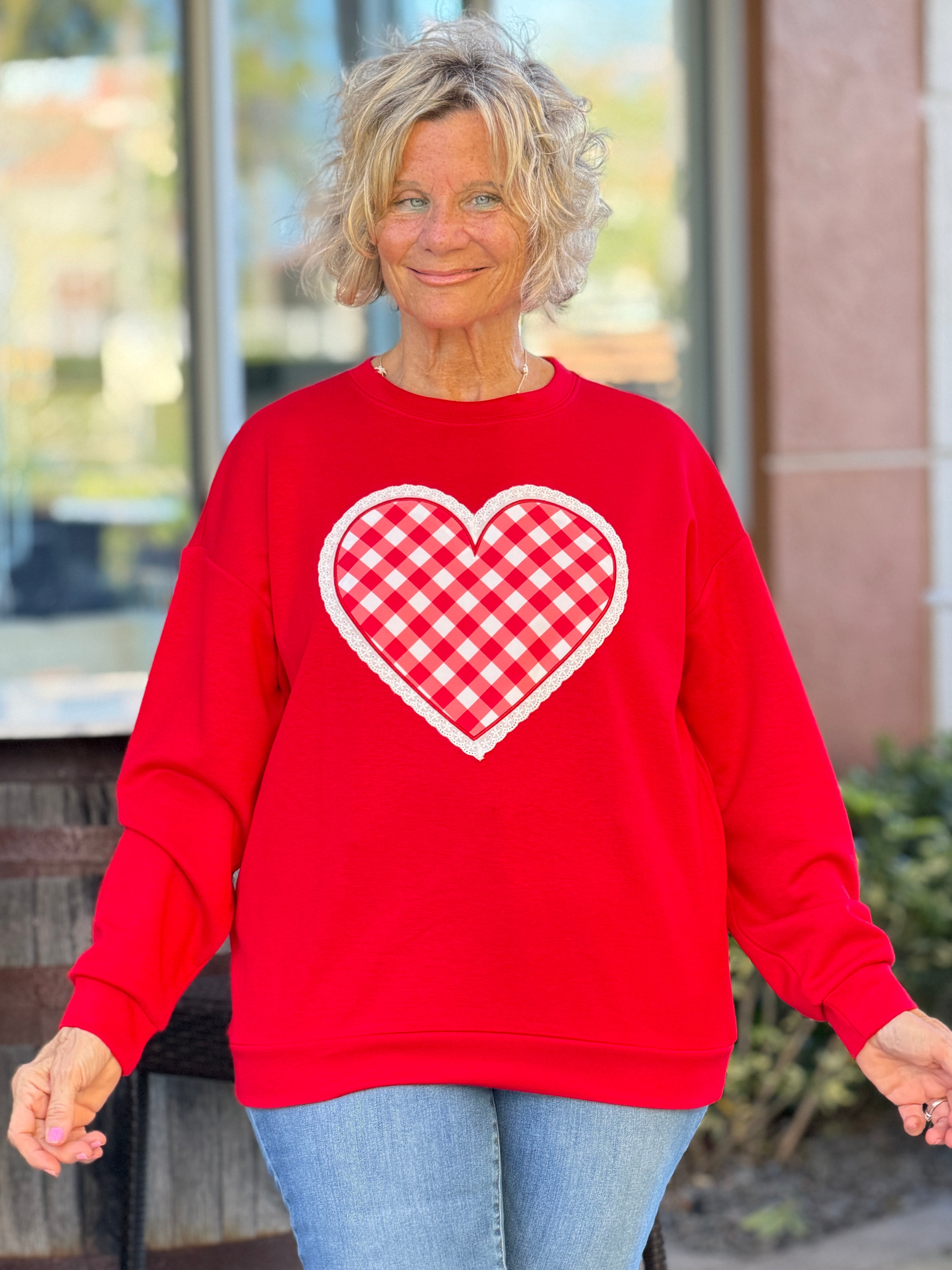 Get ready to turn heads with our Gingham Heart Luxe Pullover! Made with luxurious material and featuring a red canvas adorned with a large gingham heart patch, this pullover is both sweet and stylish for the Valentine's Day Season!