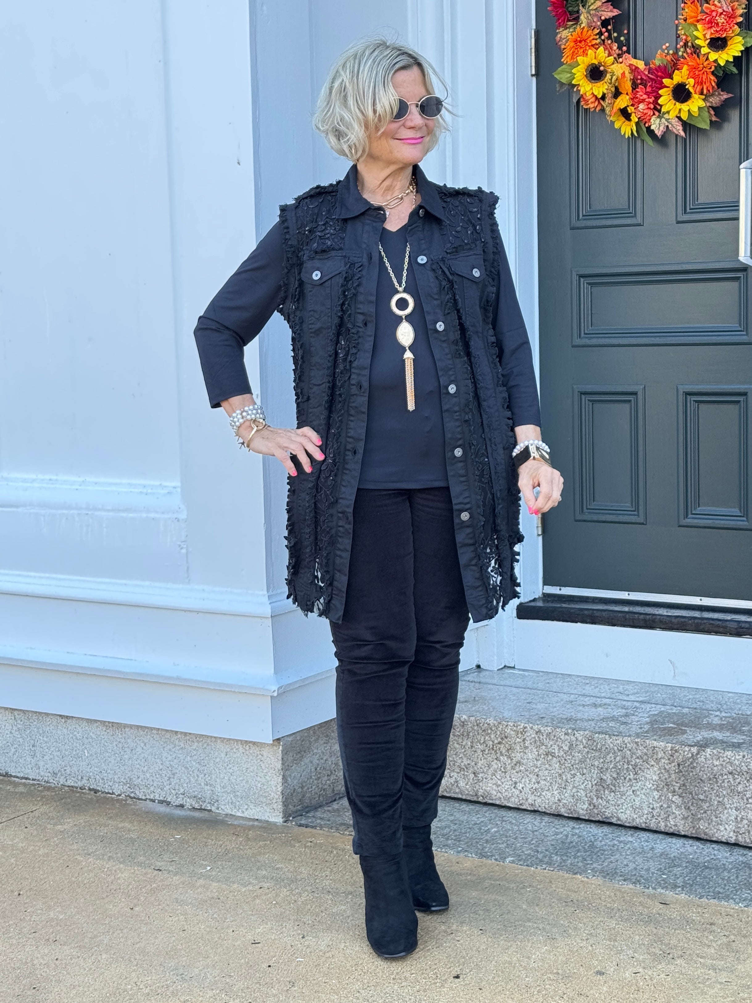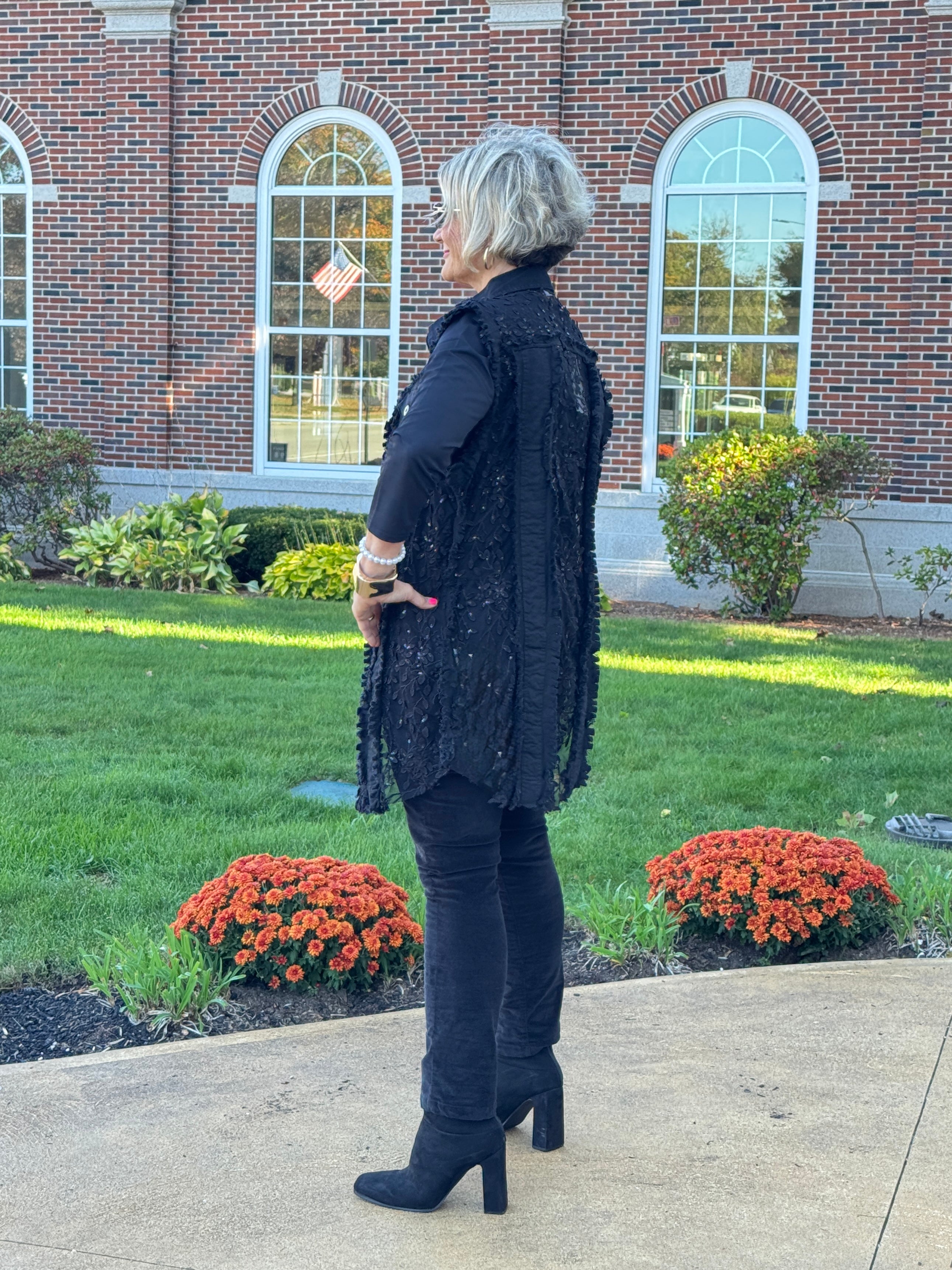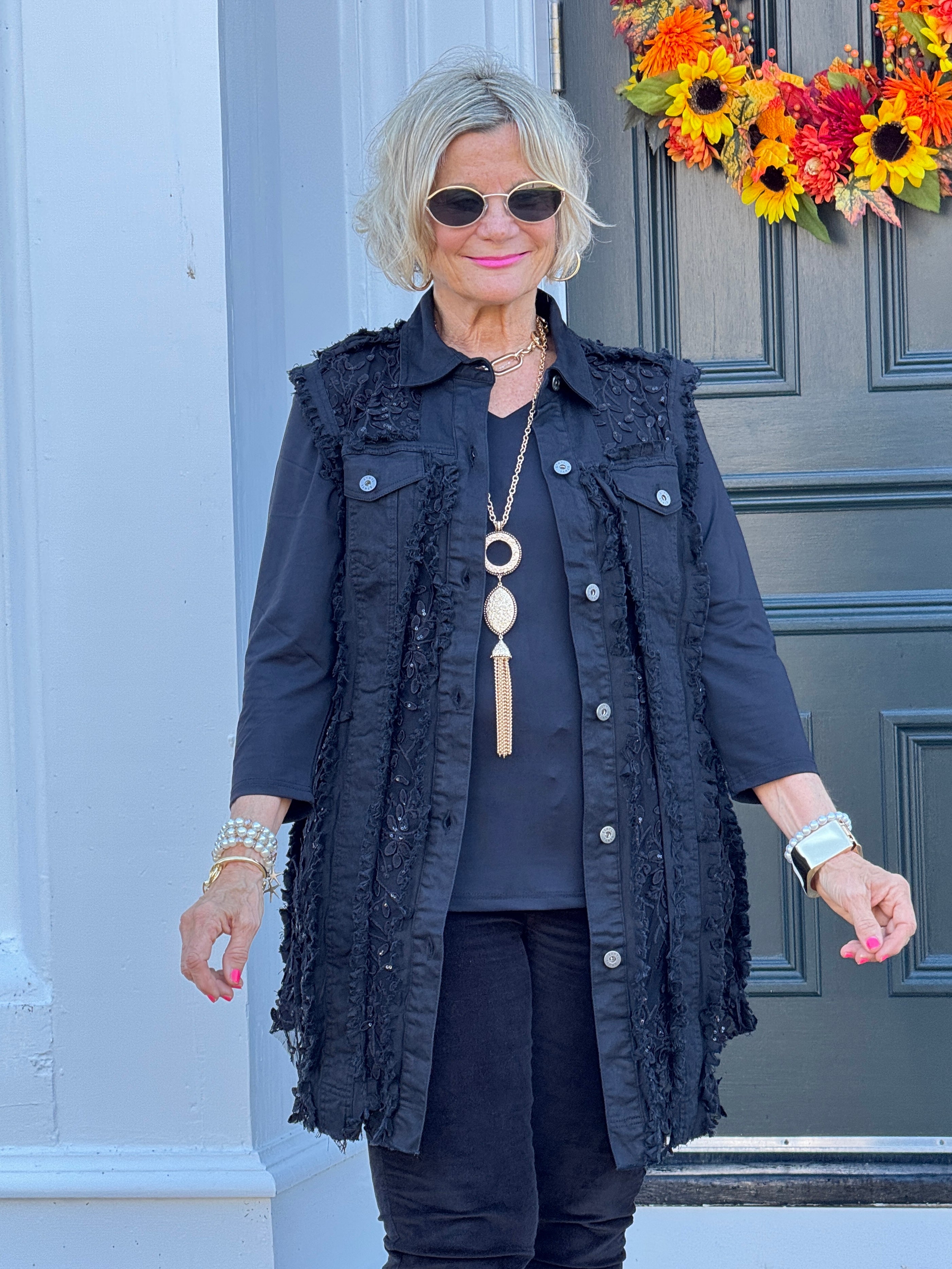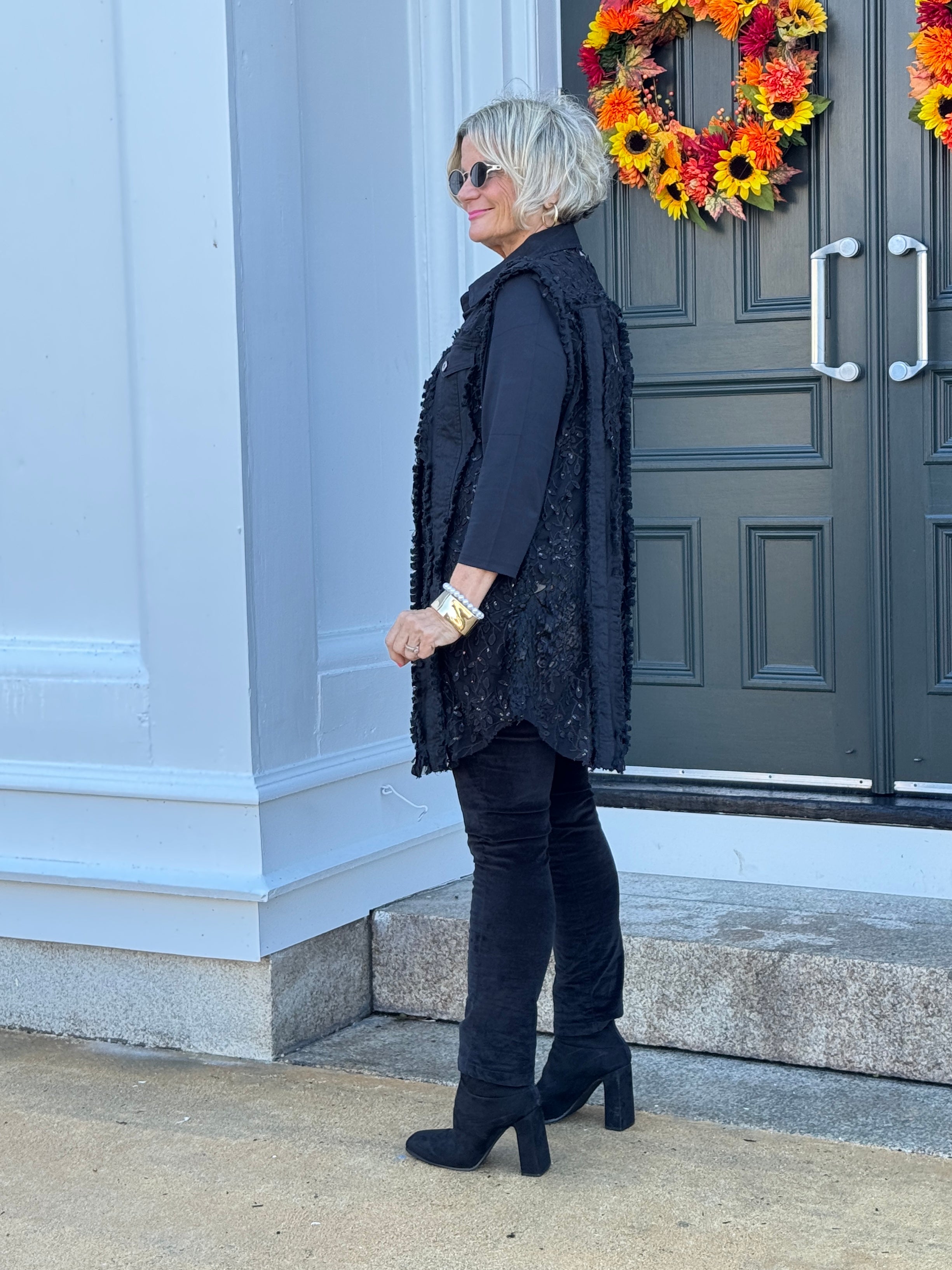 This vest boasts a graceful fusion of elements. A longer silhouette adorned with delicate, blooming flowers exudes elegance. Sheer insets lend an air of subtle allure, while dark denim accents anchor the design with a touch of rustic charm. The result is a harmonious blend of femininity and edge, perfect for versatile, stylish ensembles.