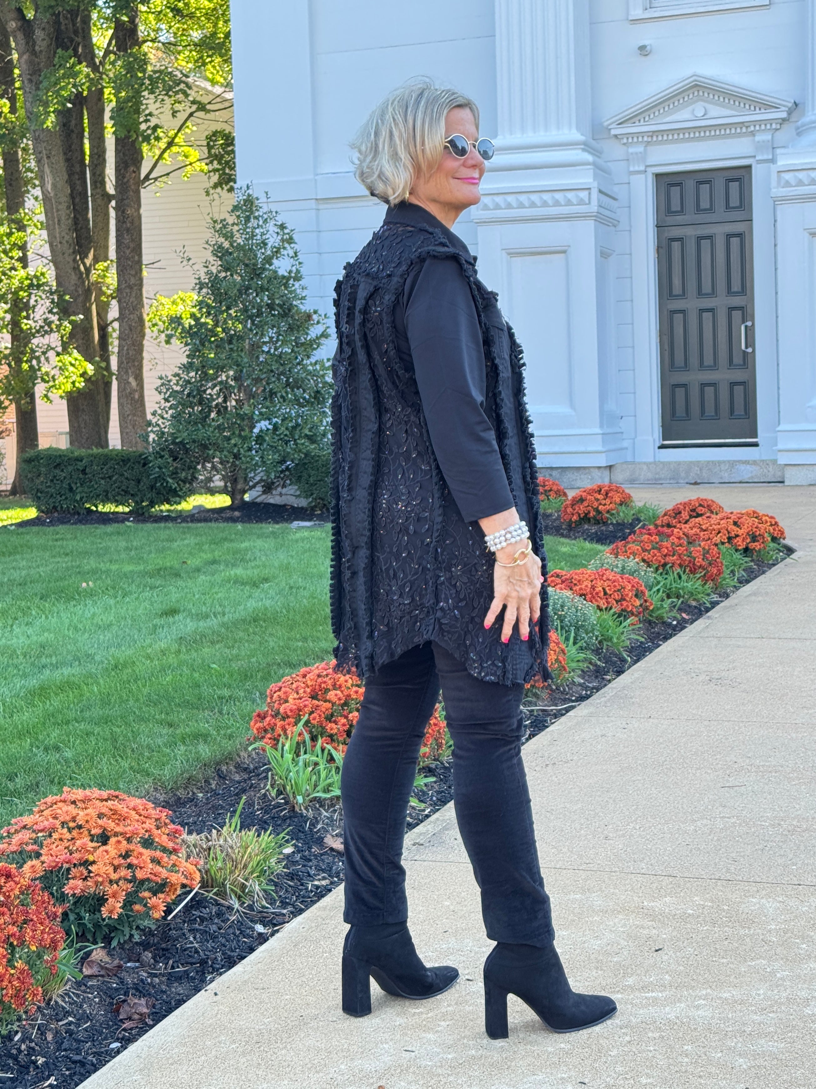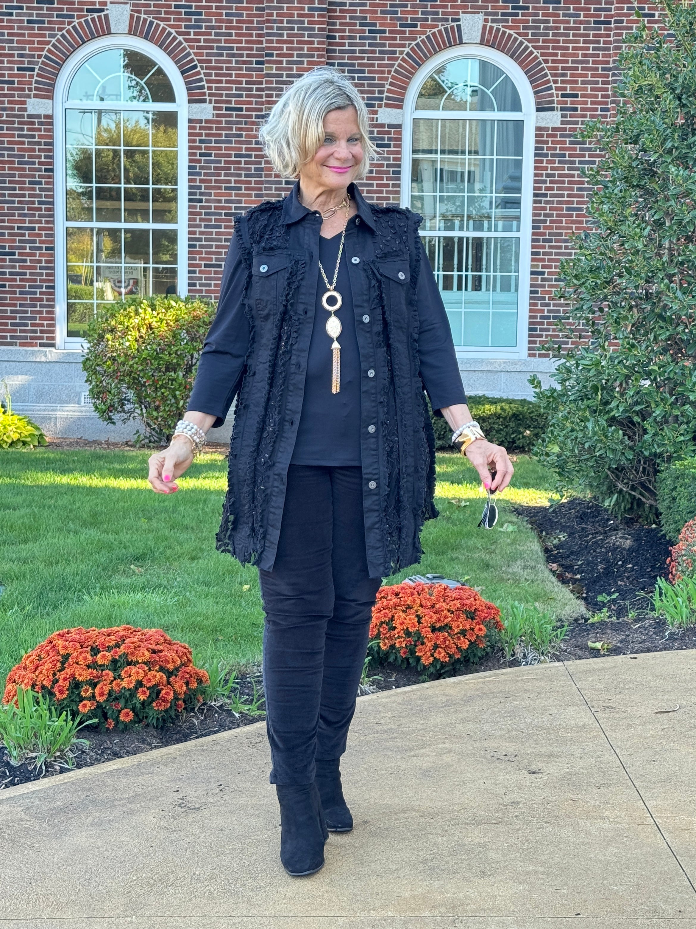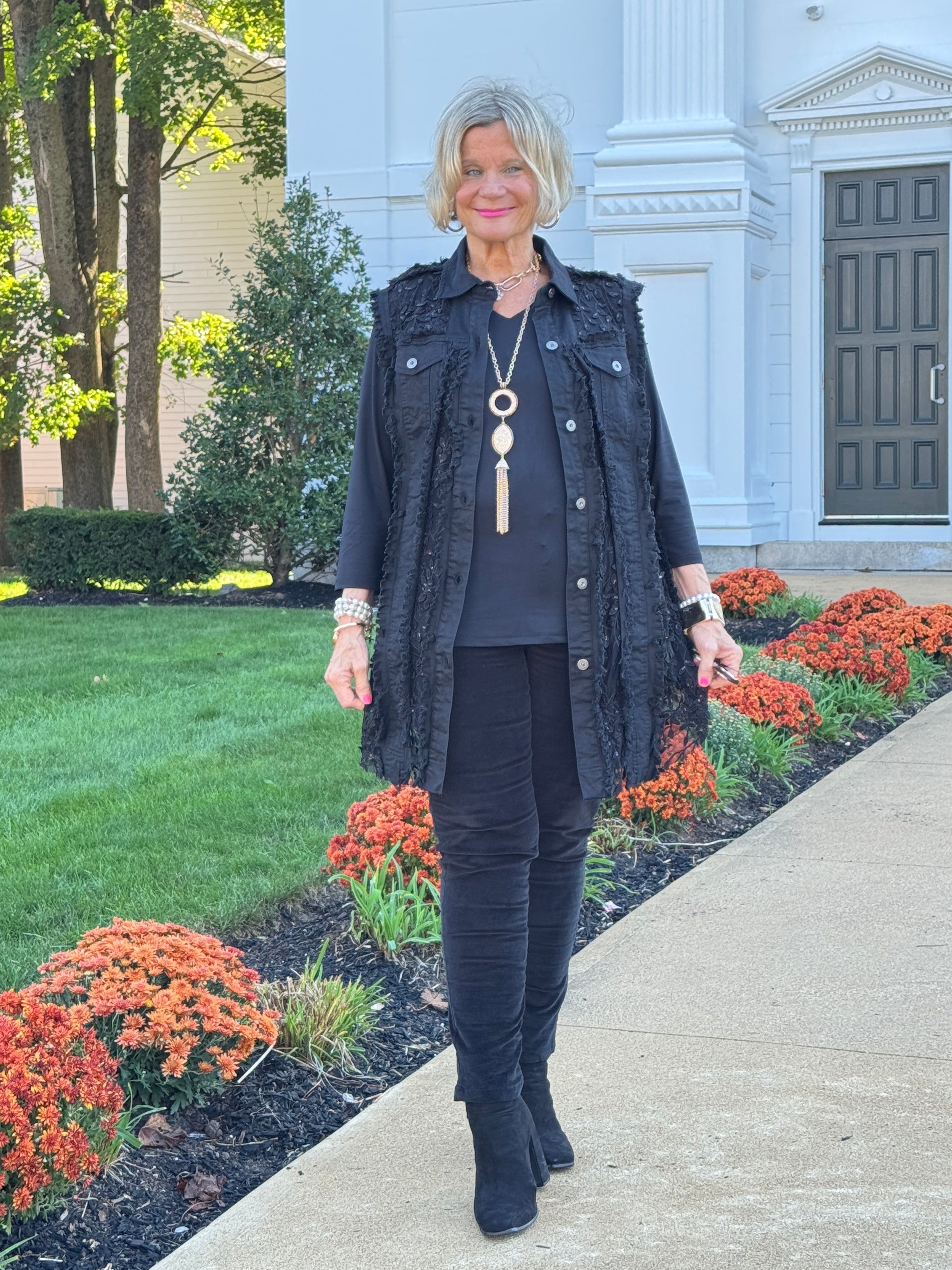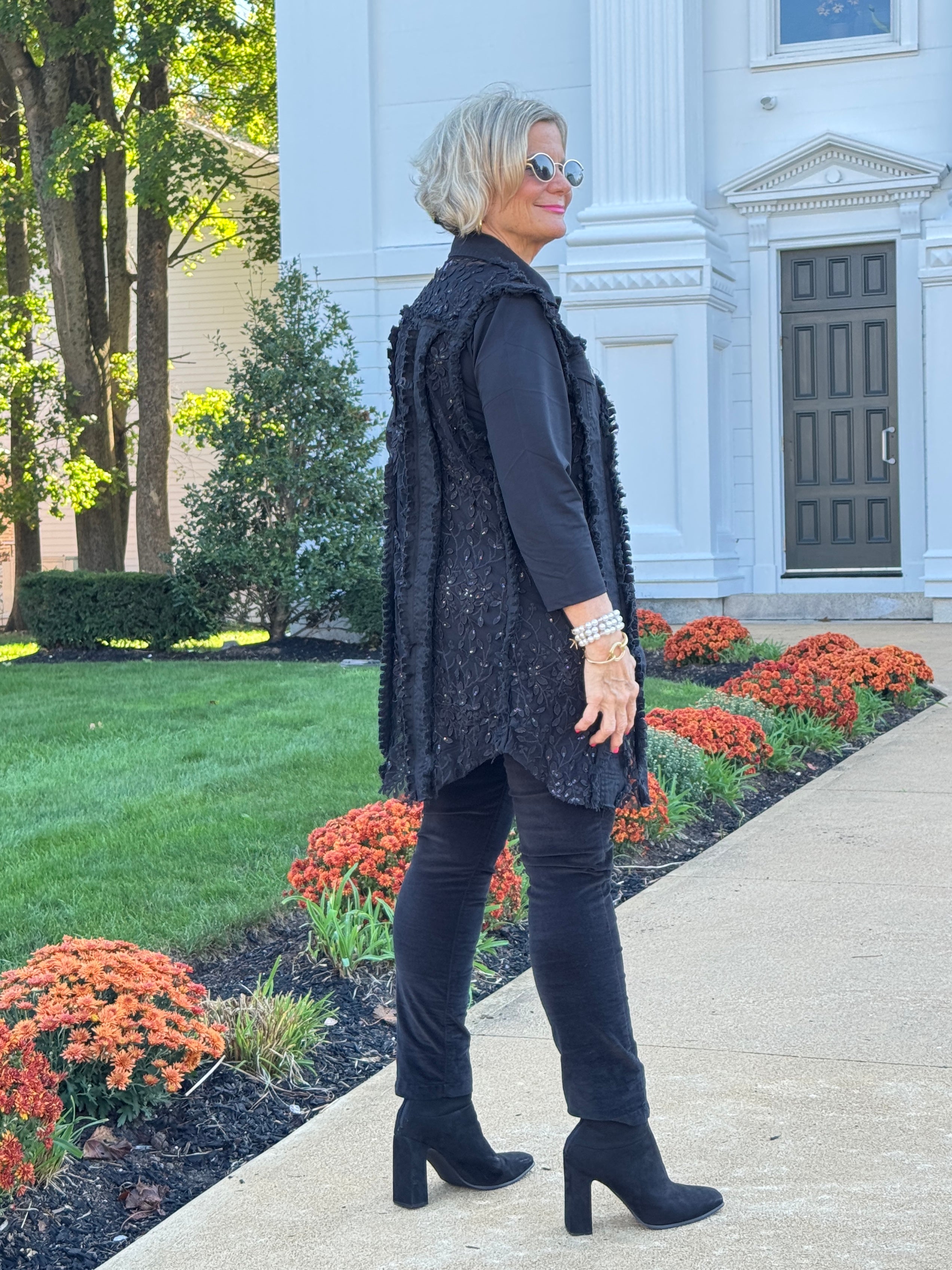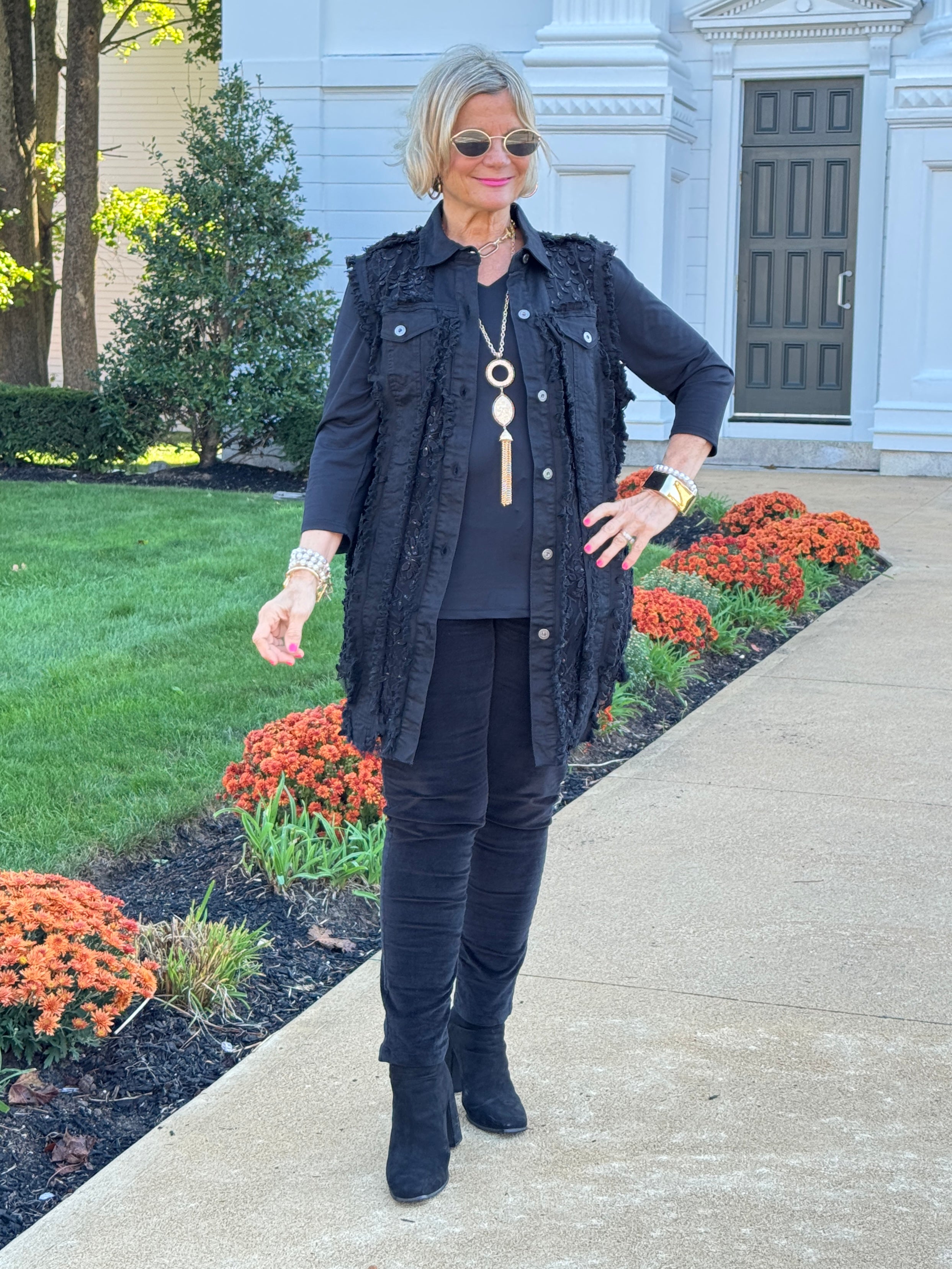 This vest boasts a graceful fusion of elements. A longer silhouette adorned with delicate, blooming flowers exudes elegance. Sheer insets lend an air of subtle allure, while dark denim accents anchor the design with a touch of rustic charm. The result is a harmonious blend of femininity and edge, perfect for versatile, stylish ensembles.