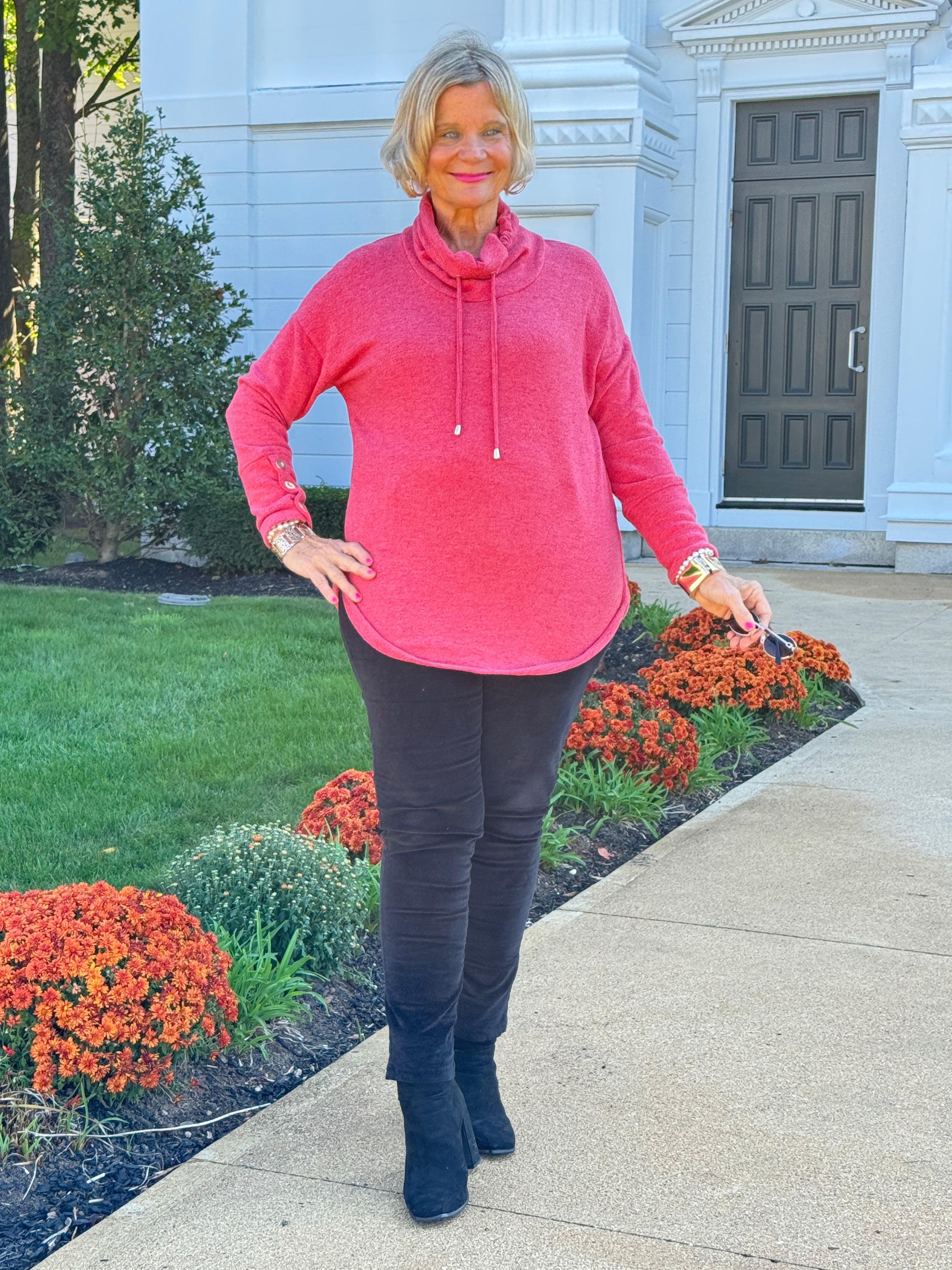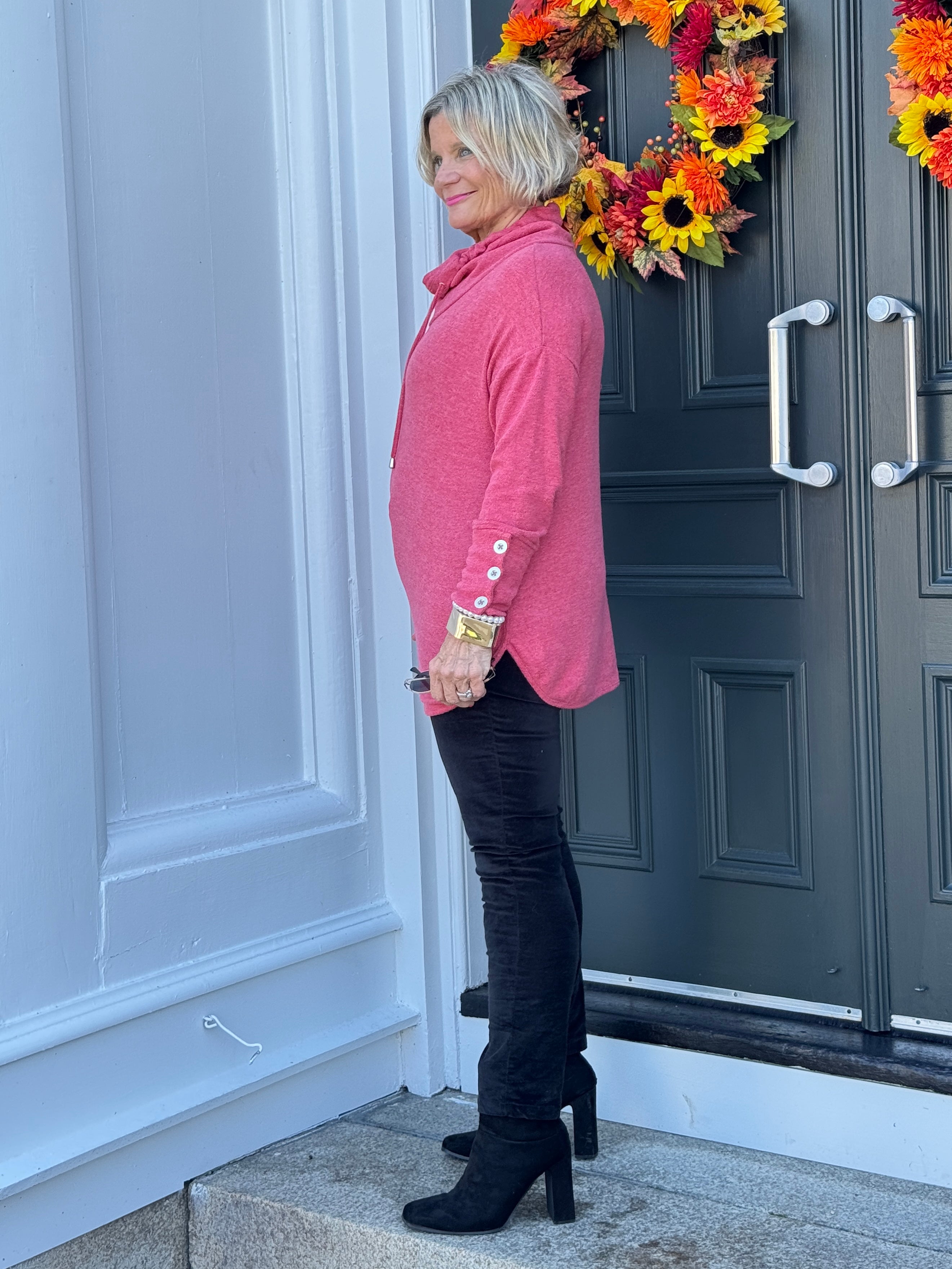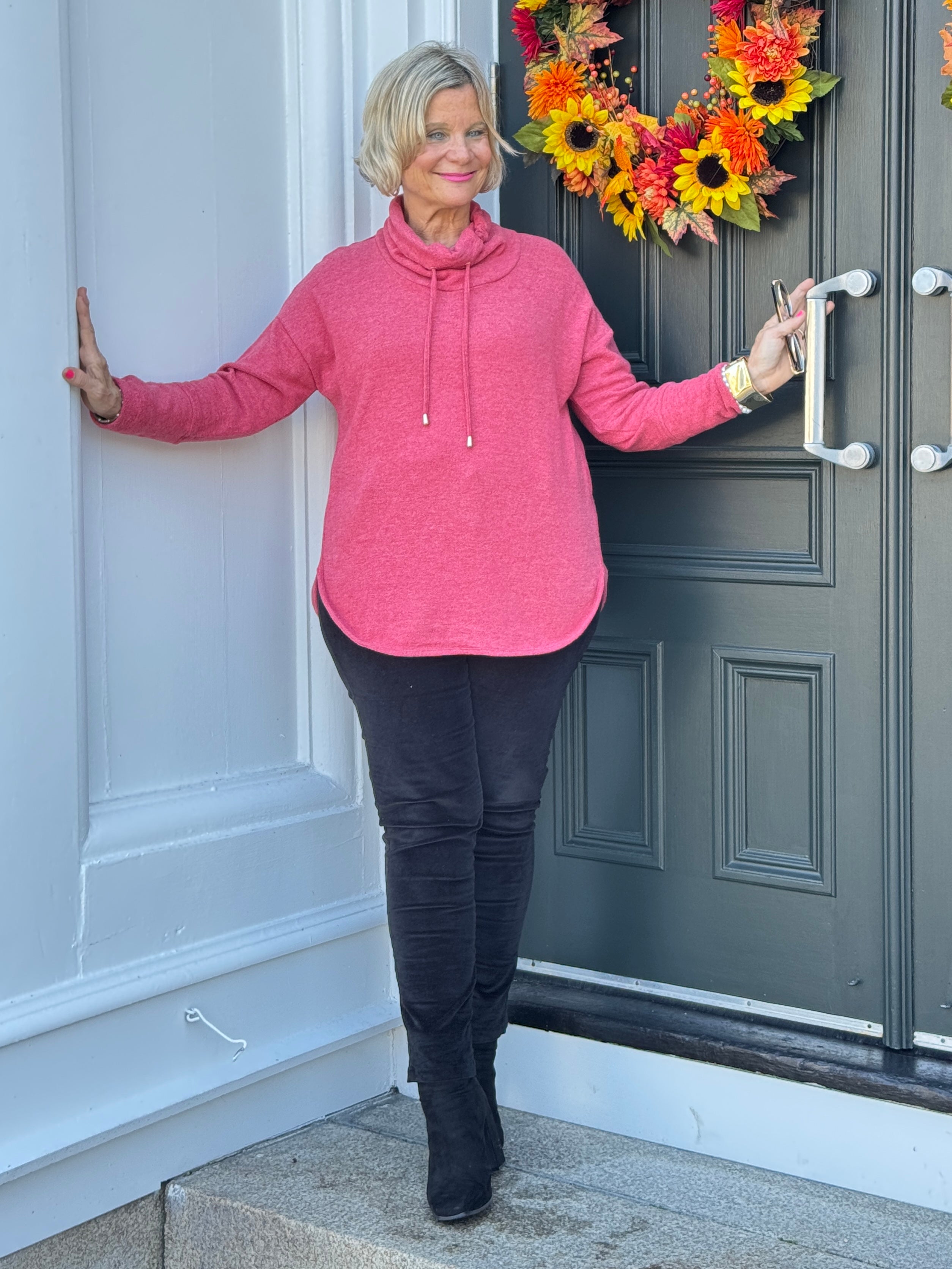 Women's Cowl Neck Cozy Hatchi Drawstring Top CHERRY