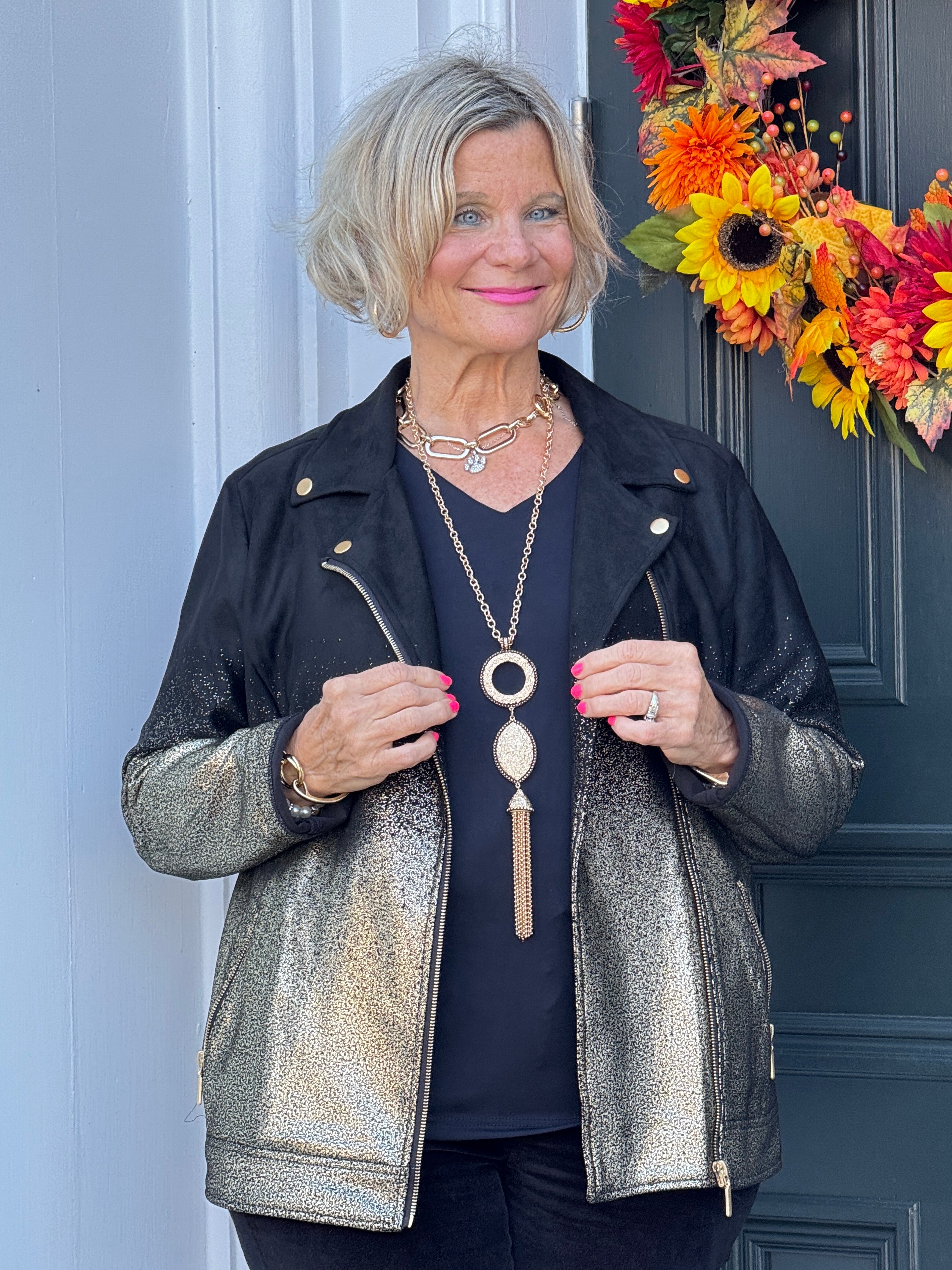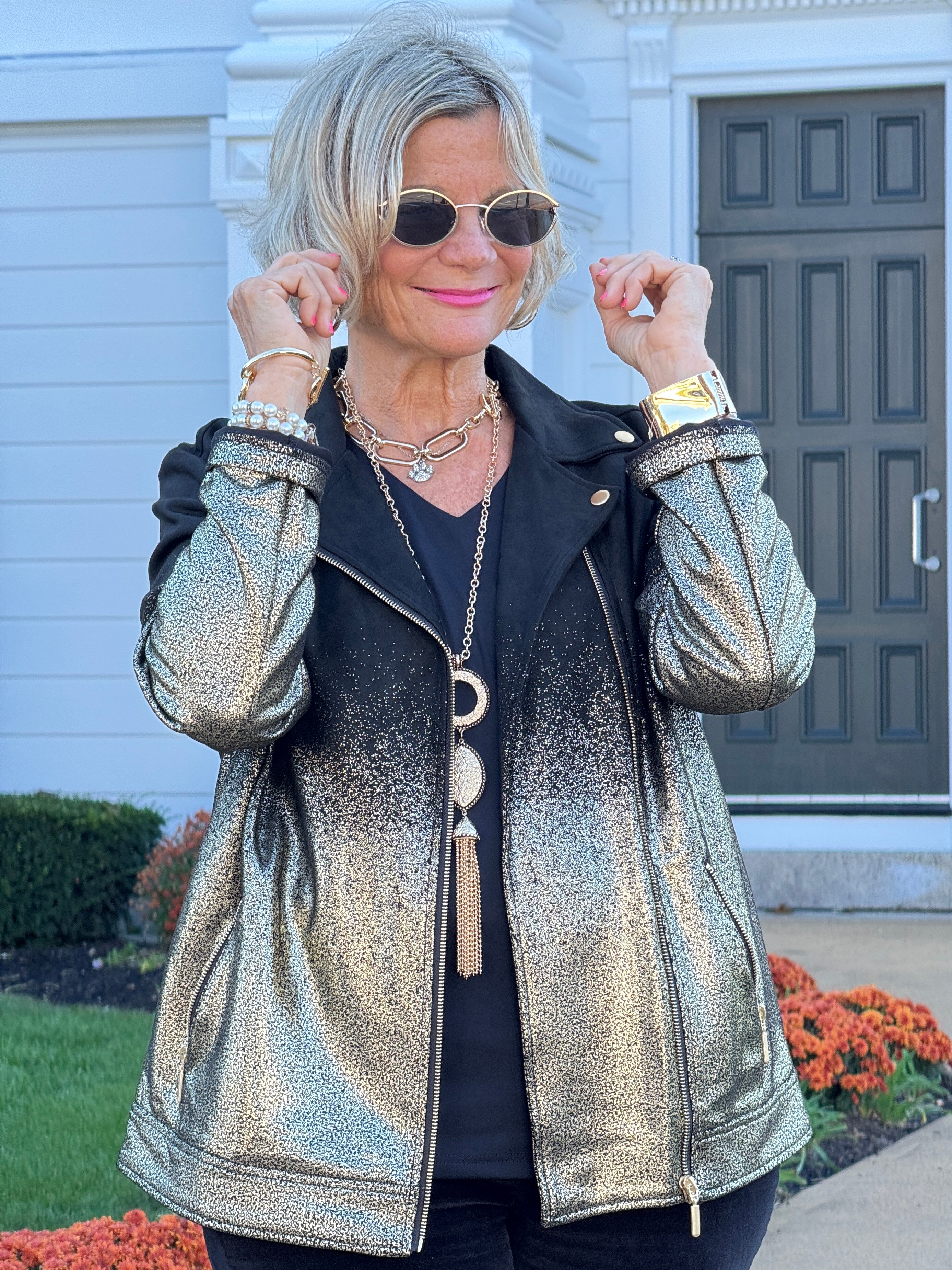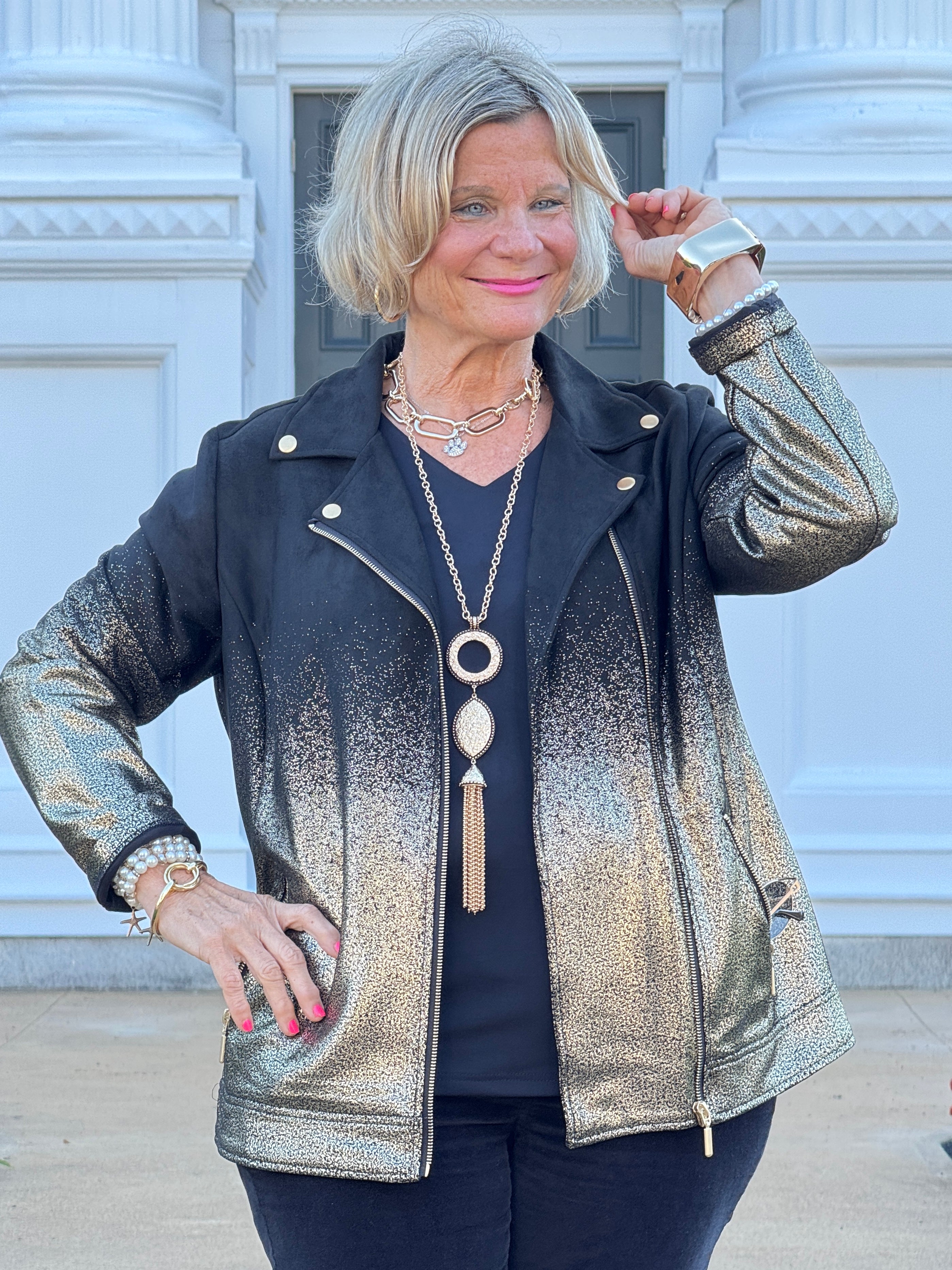 Make an entrance in this zip-front moto jacket, crafted from faux vegan suede with a gold ombre metallic sheen. Its sleek silhouette, zip pockets and long sleeves give it undeniable flair.