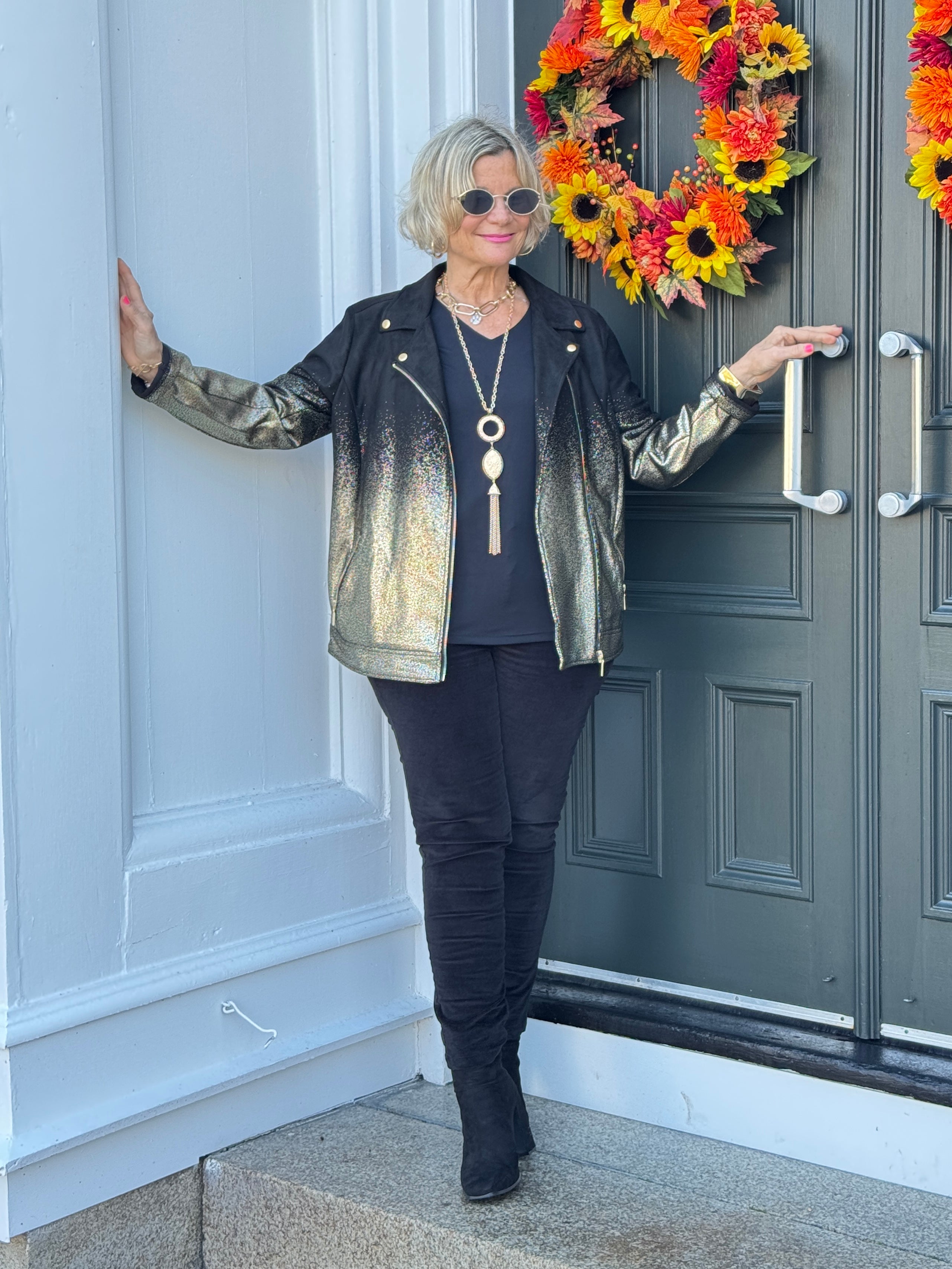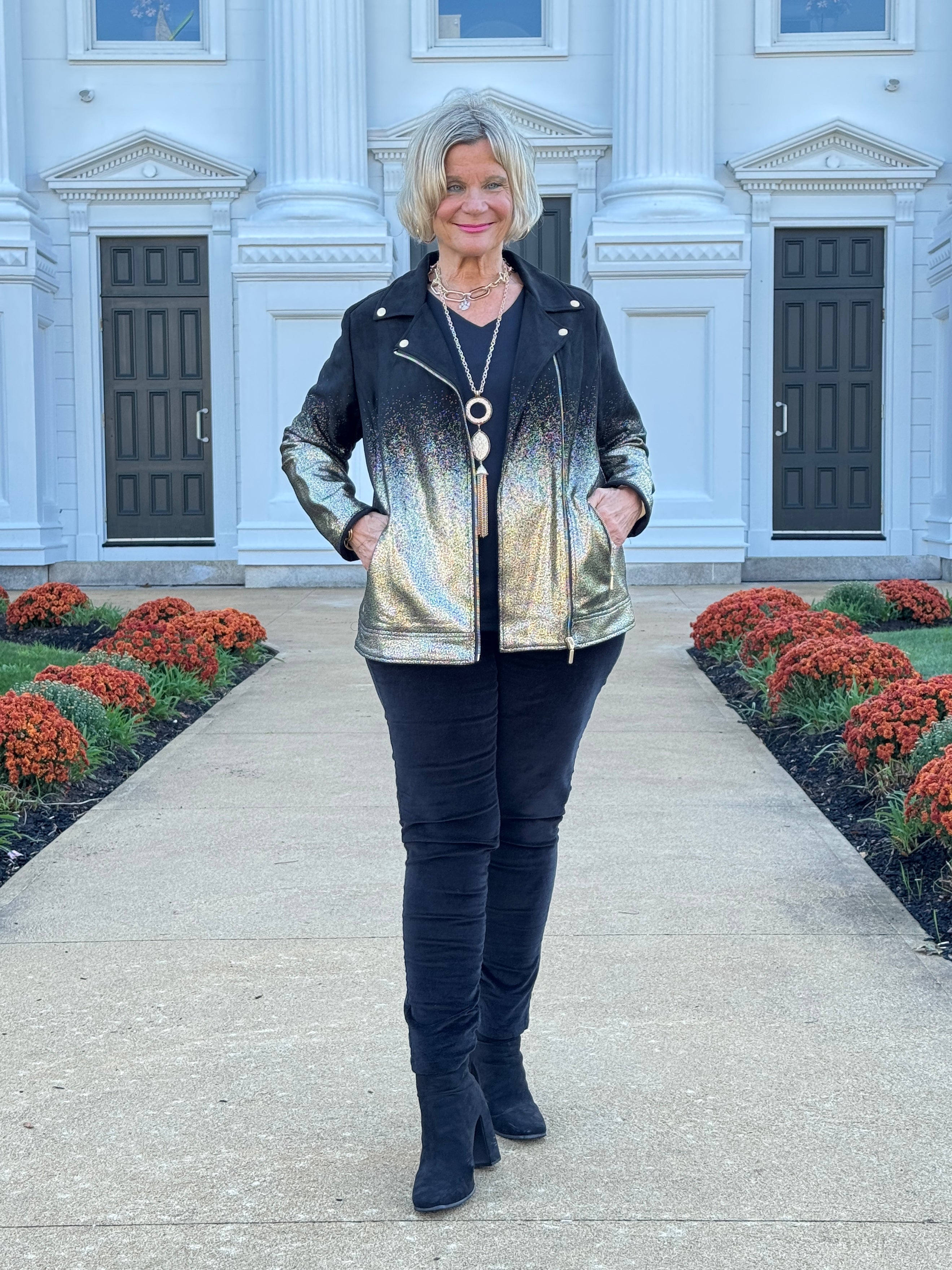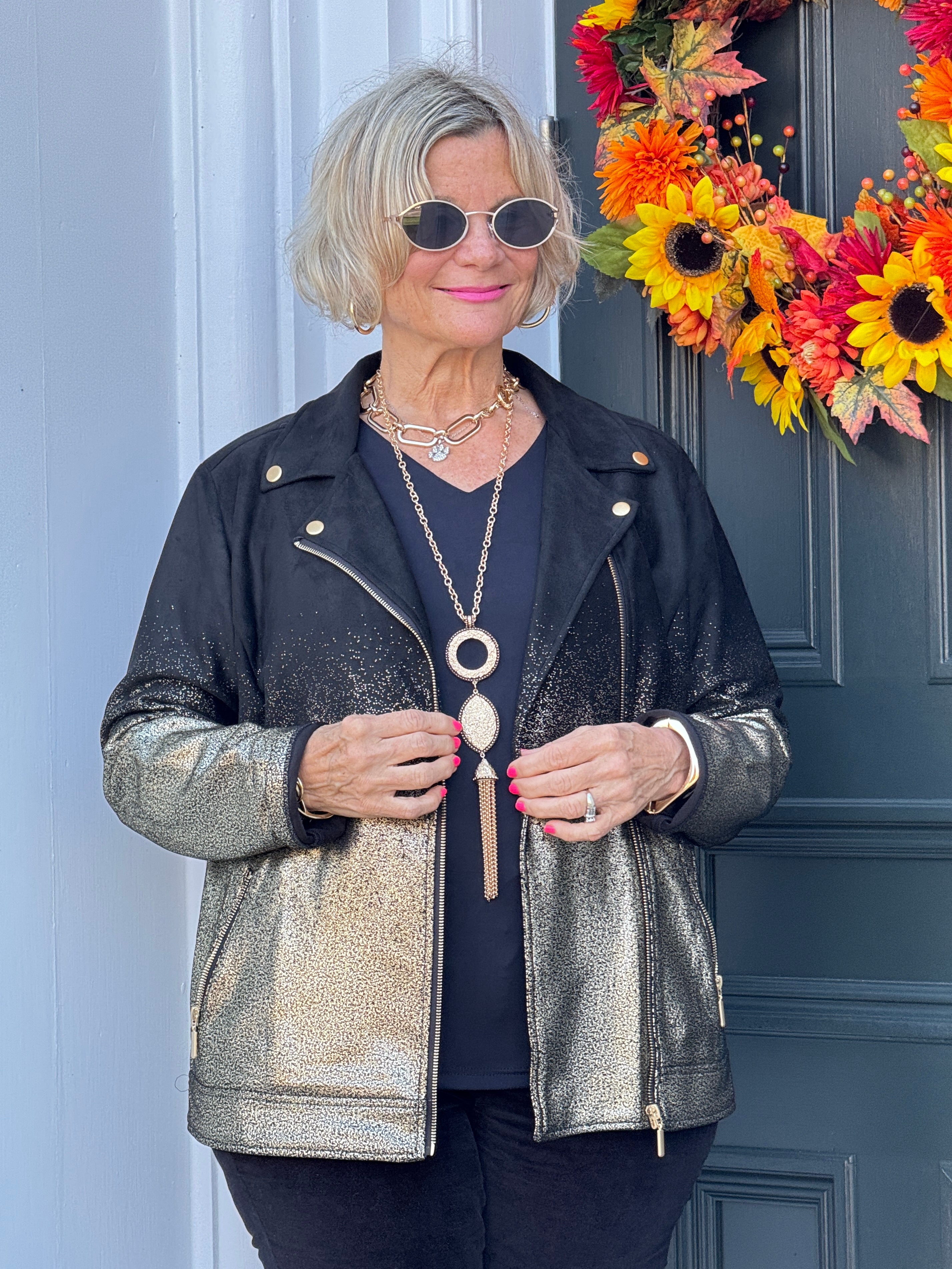 Make an entrance in this zip-front moto jacket, crafted from faux vegan suede with a gold ombre metallic sheen. Its sleek silhouette, zip pockets and long sleeves give it undeniable flair.