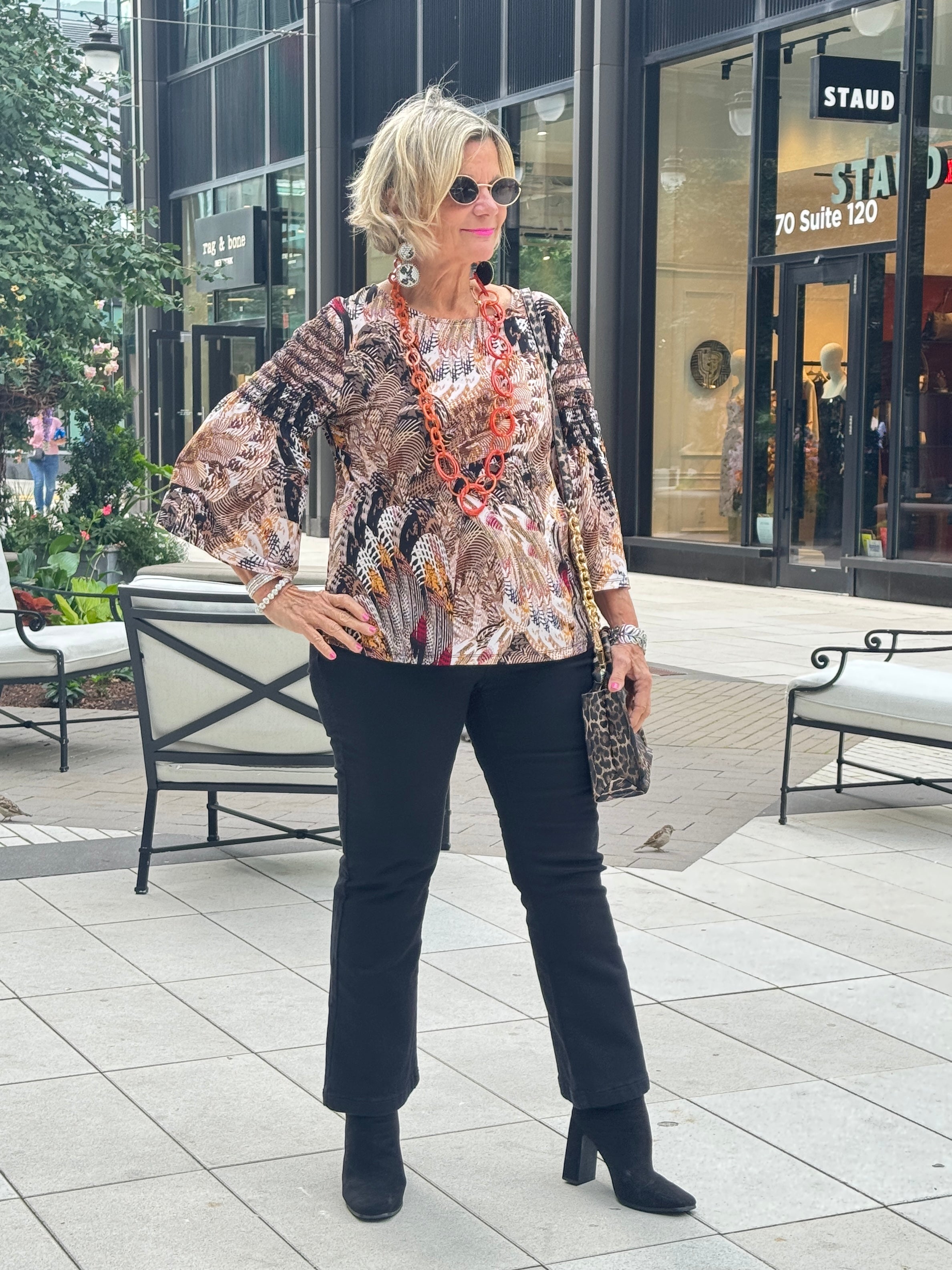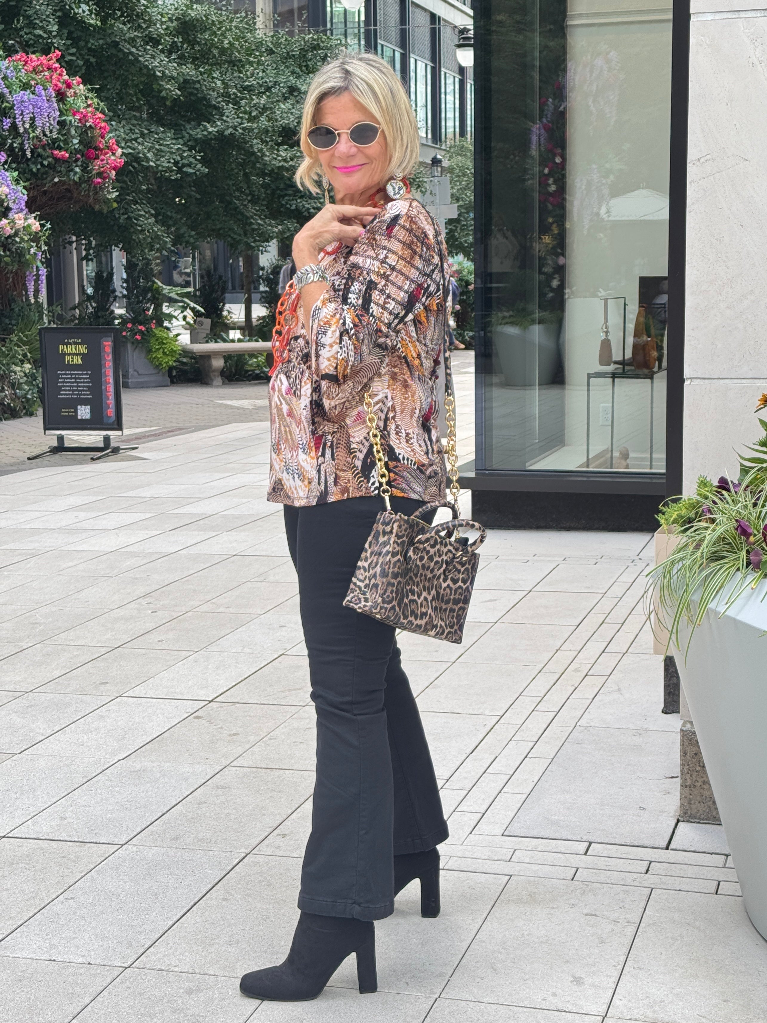 Elevate your wardrobe with this Leopard Fashion Top, designed for a chic silhouette and comfortable fit. Featuring a tasteful, fancy sleeve detail, it pairs effortlessly with leggings or flare jeans for versatile styling options. Crafted to complement a medium size at 5'6", this top offers a flattering fit that balances bold patterns with refined elegance—perfect for making a statement while maintaining everyday wearability.