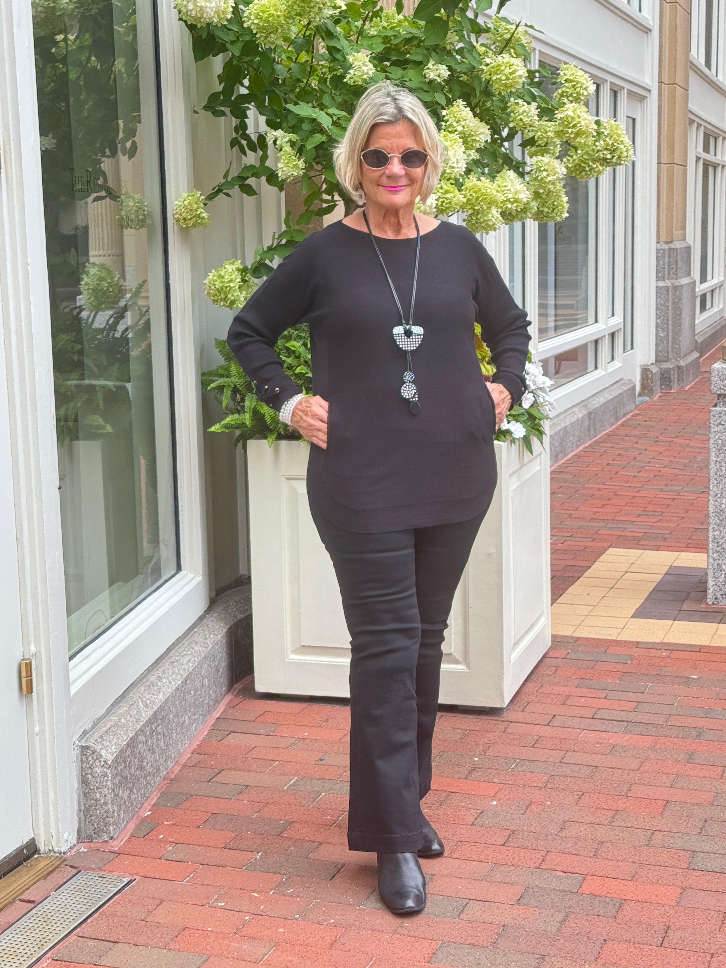Our exclusive Peche fabric makes this velvet soft sweater a must have for the season. Slightly longer body, flattering neckline and of course pockets... whats not to love? Also note the detail crochet tied sleeves.