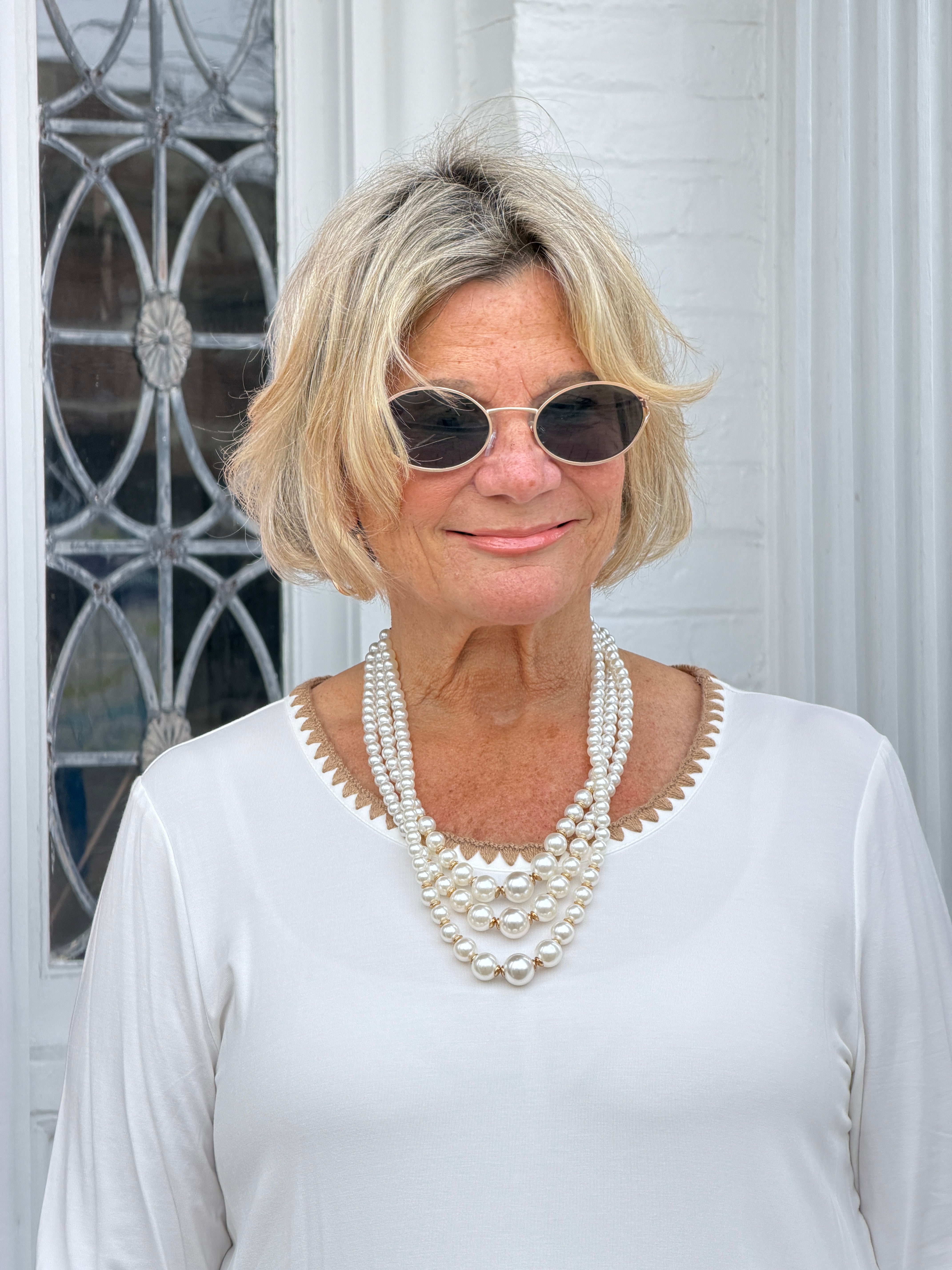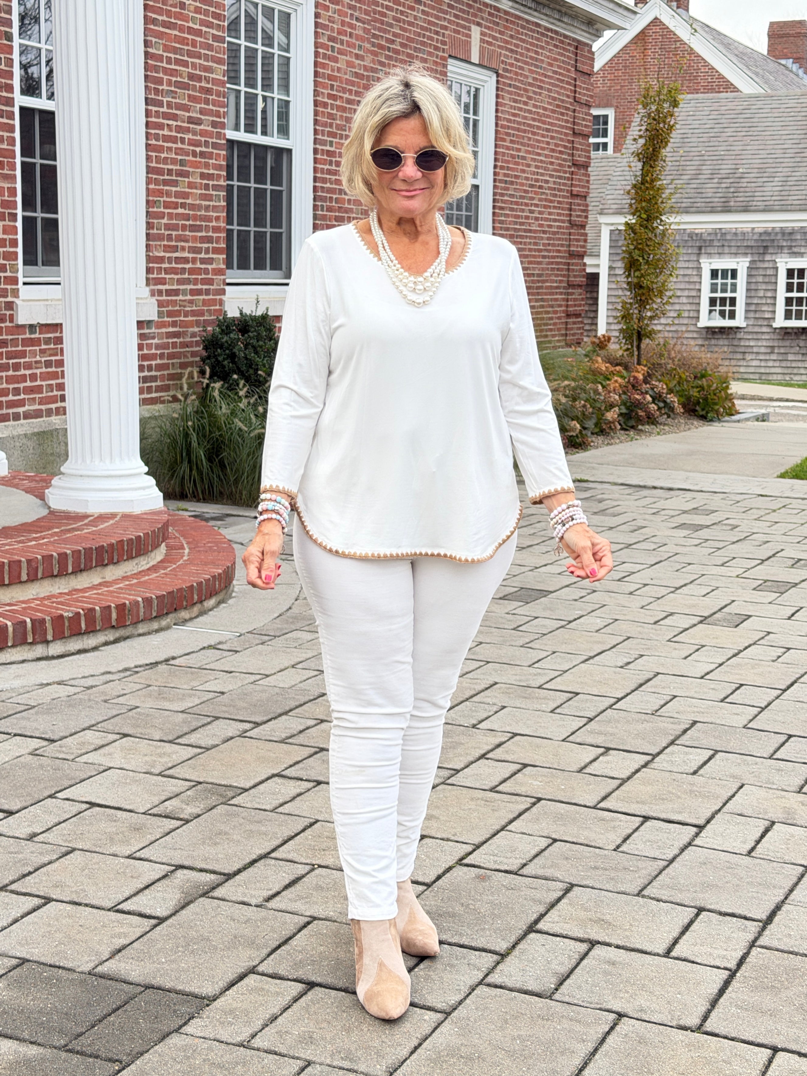 This soft jersey knit top is finished with contrast embroidery at the rounded hem, 3/4 sleeves, and flattering scoop neckline. It's casual with just the right amount of charm