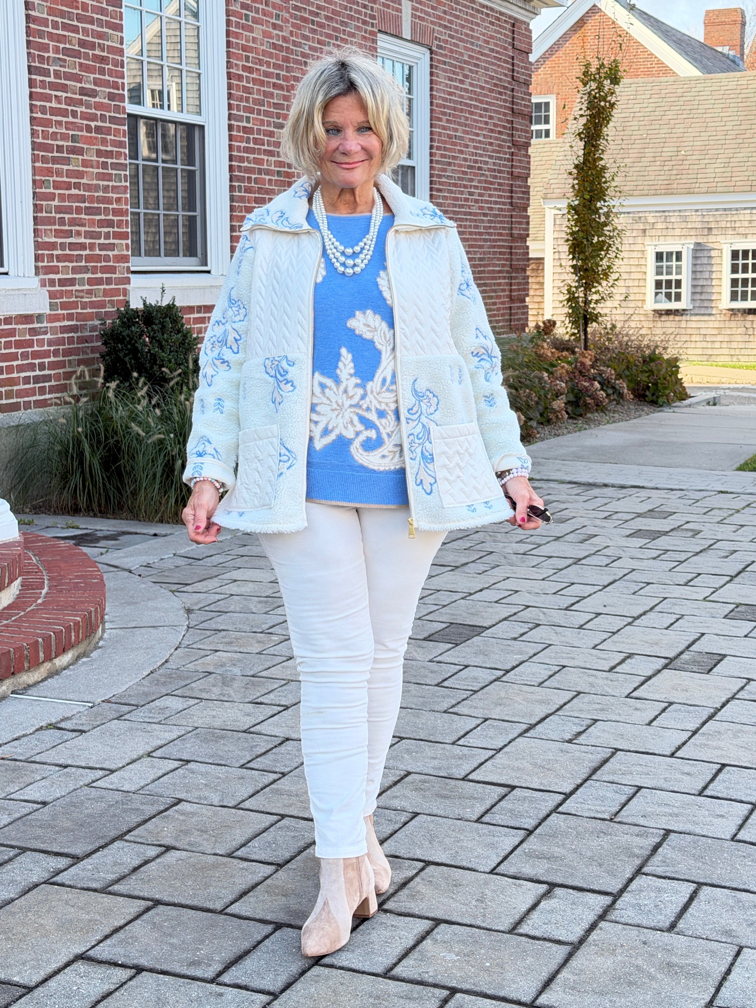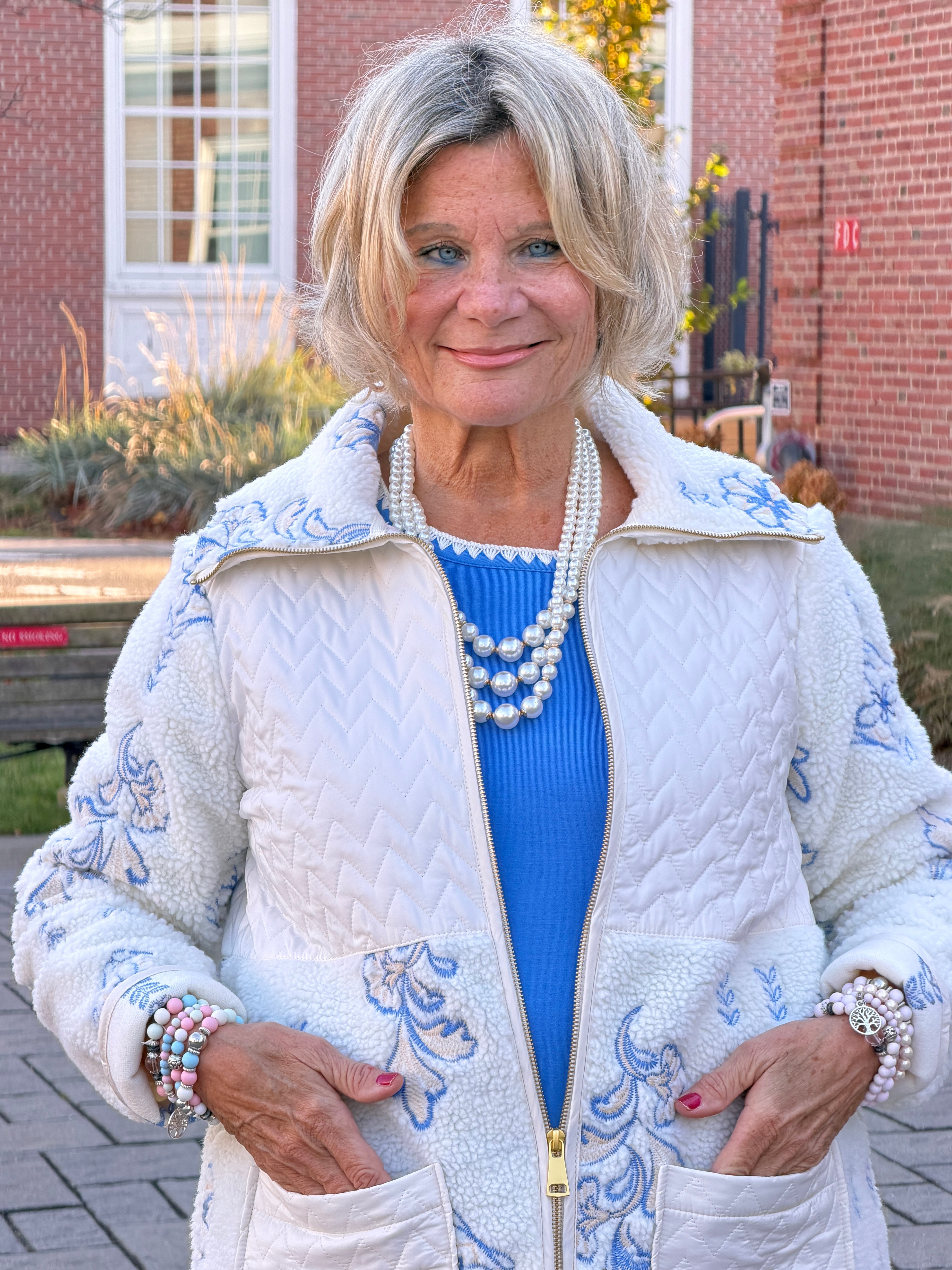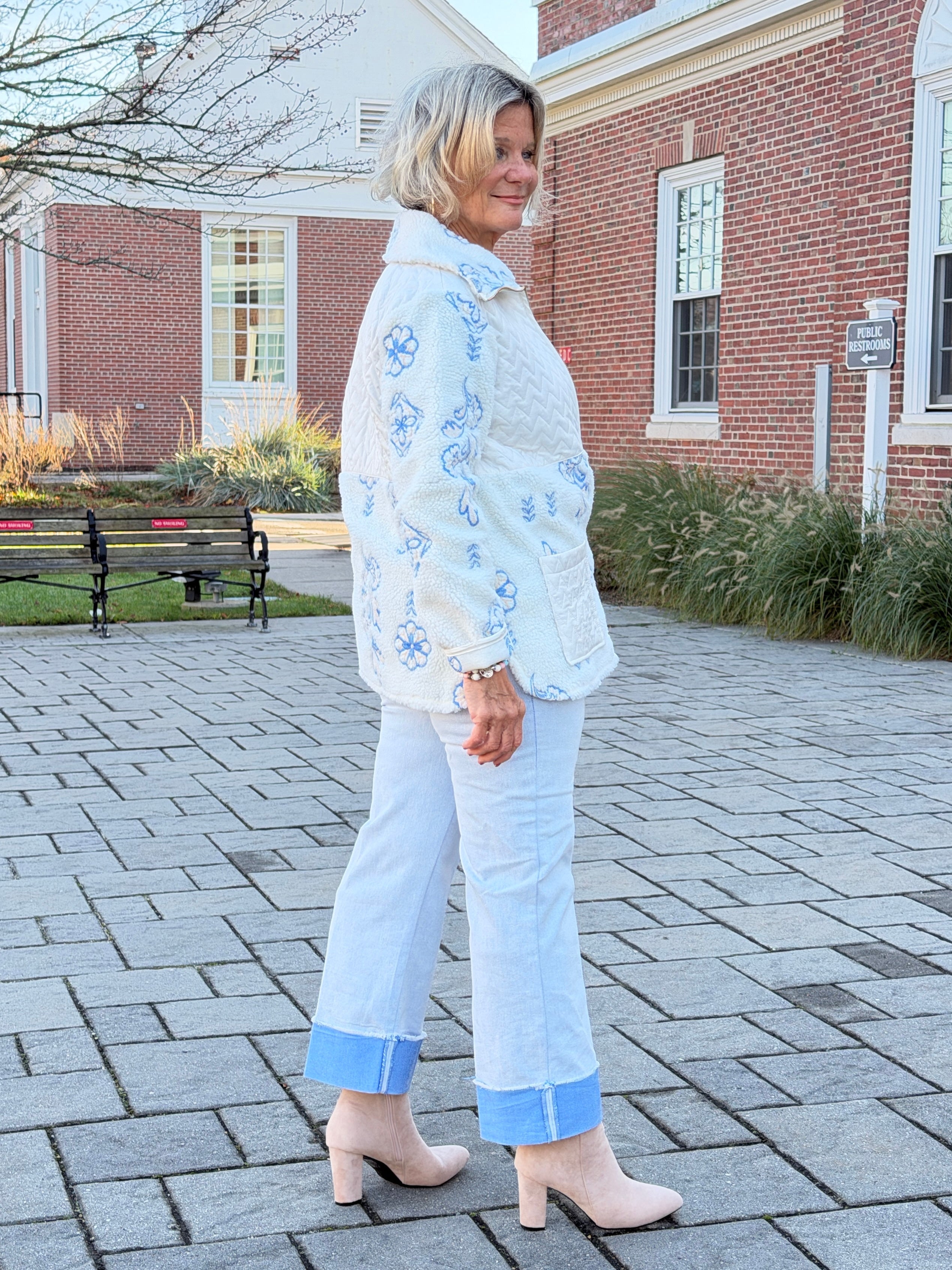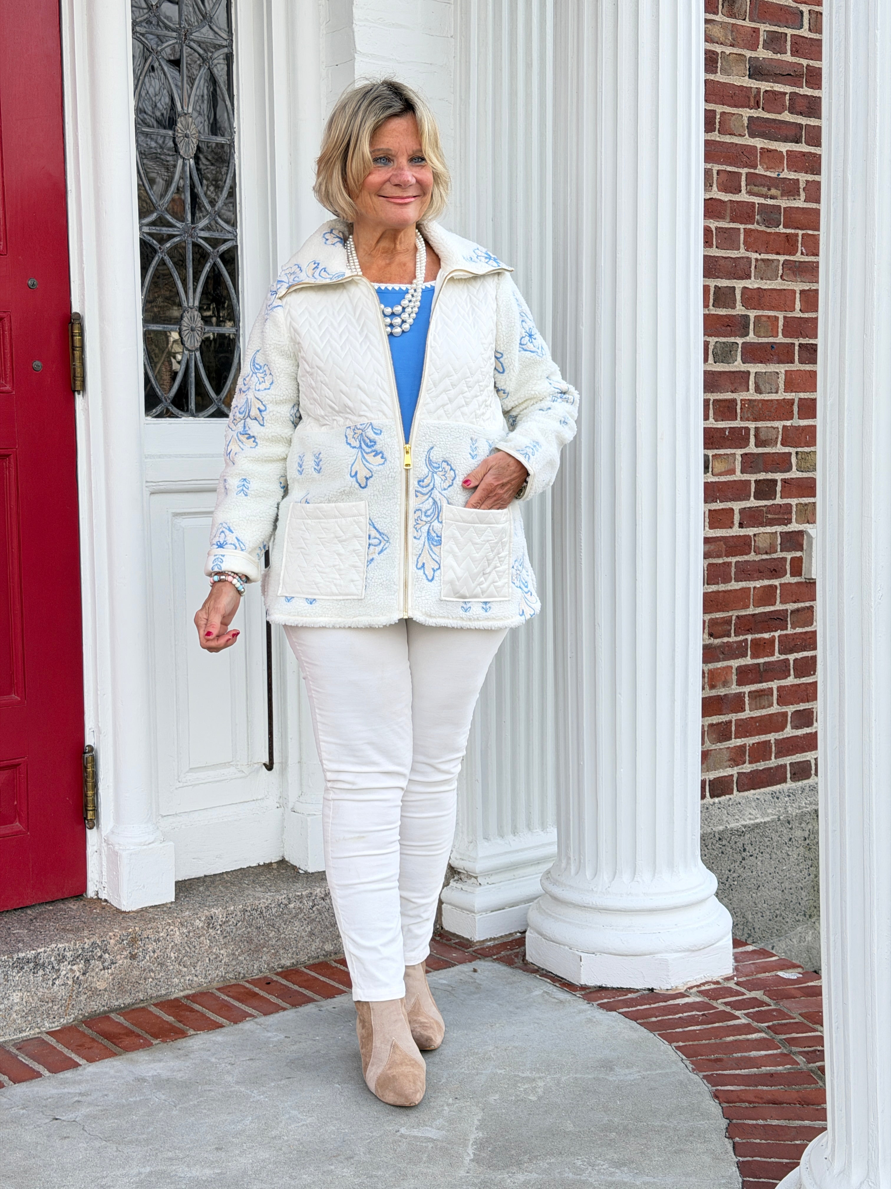 Cozy up in this embroidered shearling jacket, complete with quilted details, a zip front with patch pockets, and warm long sleeves. Stylish texture and toasty comfort in one statement layer