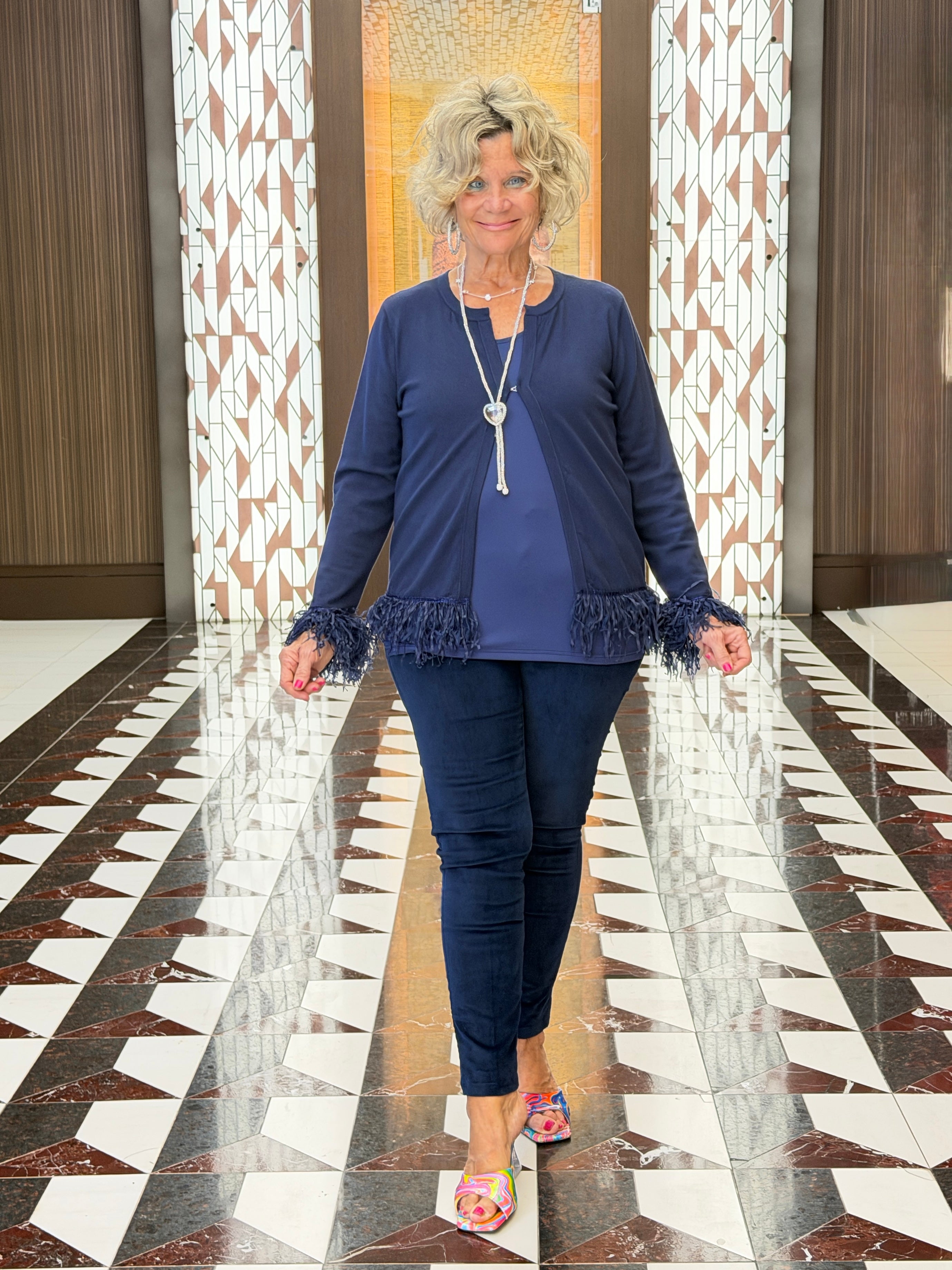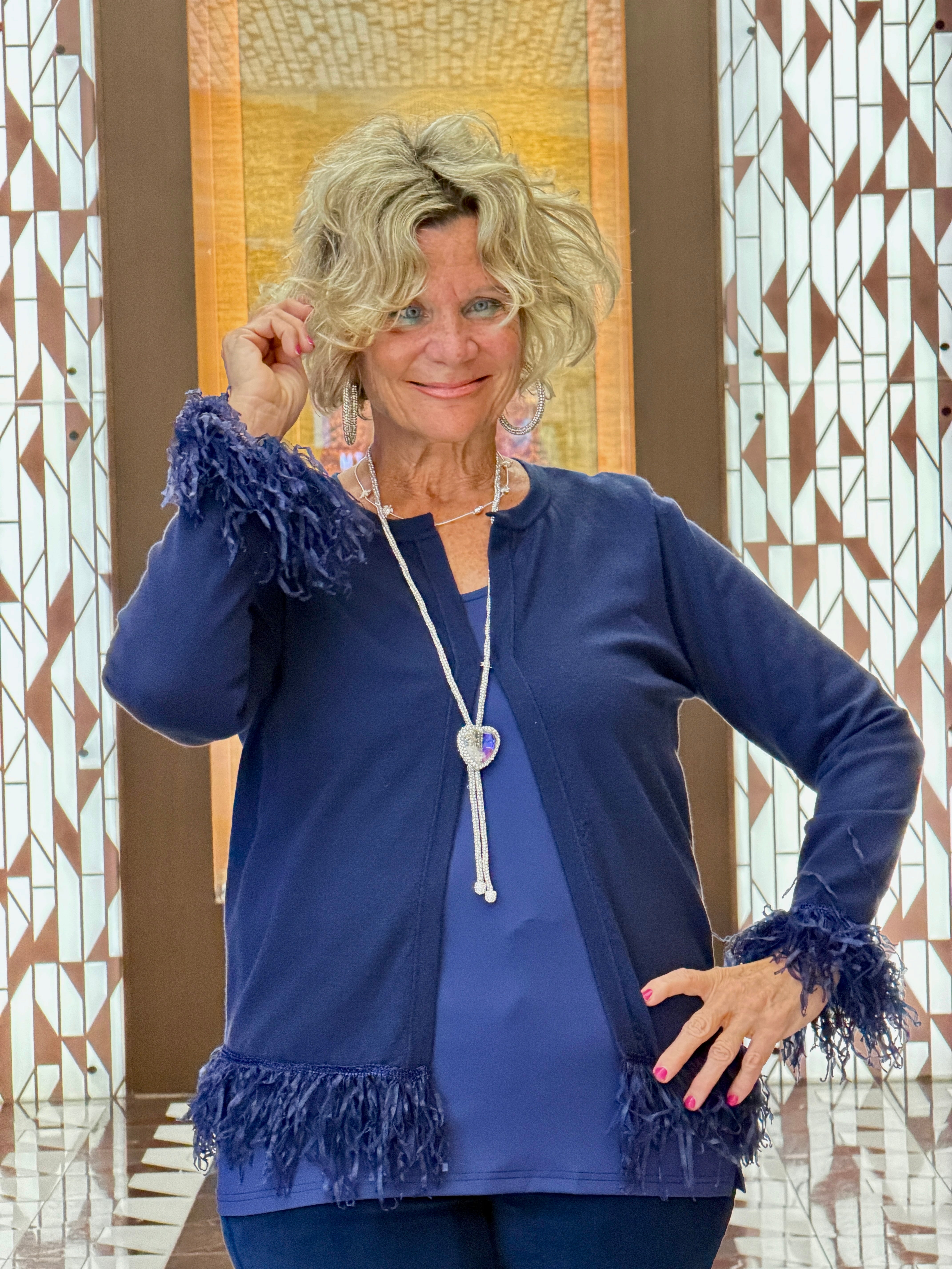 LULU-B NAVY CASHMERE FRINGE FANCY CARDIGAN