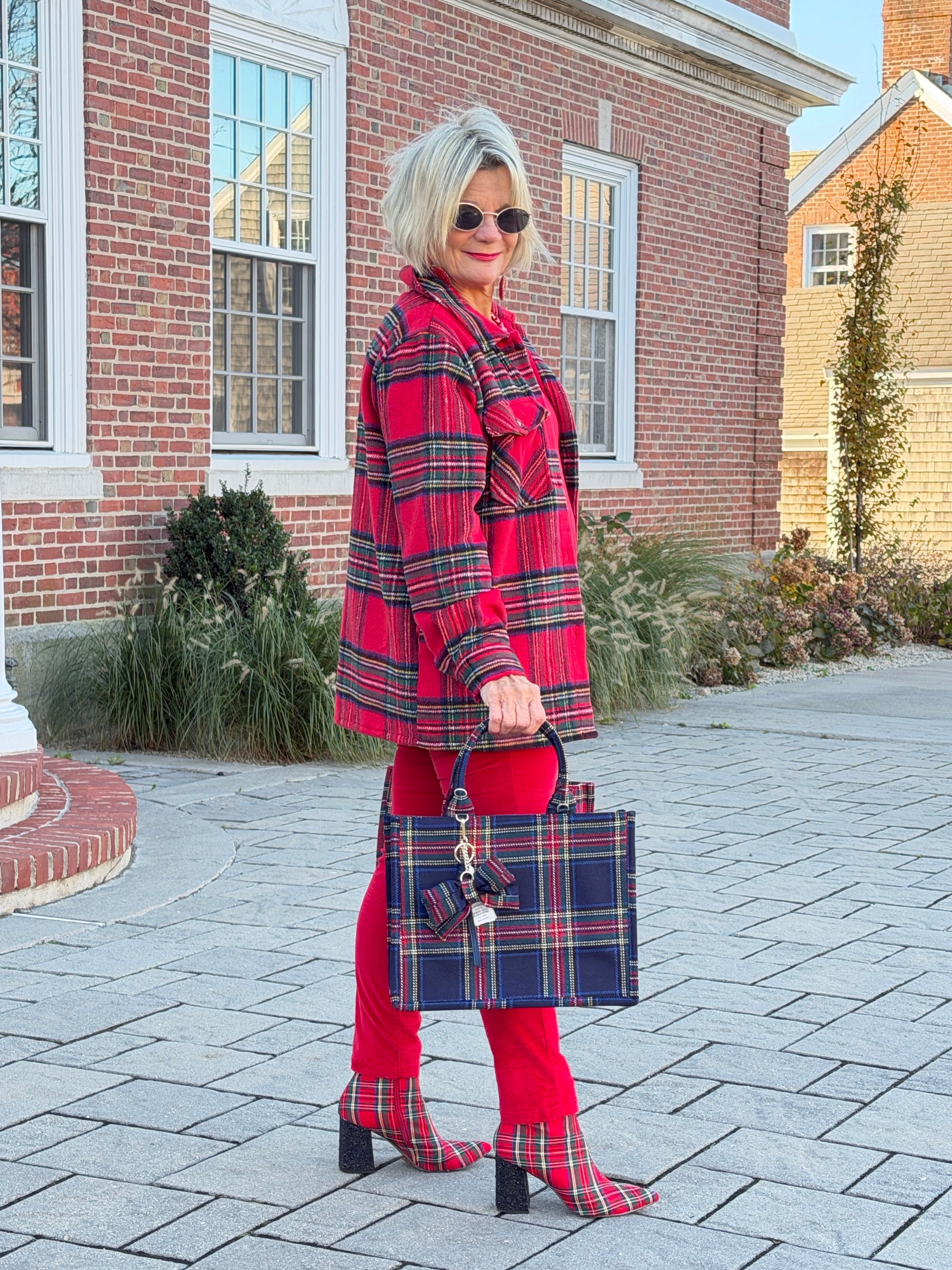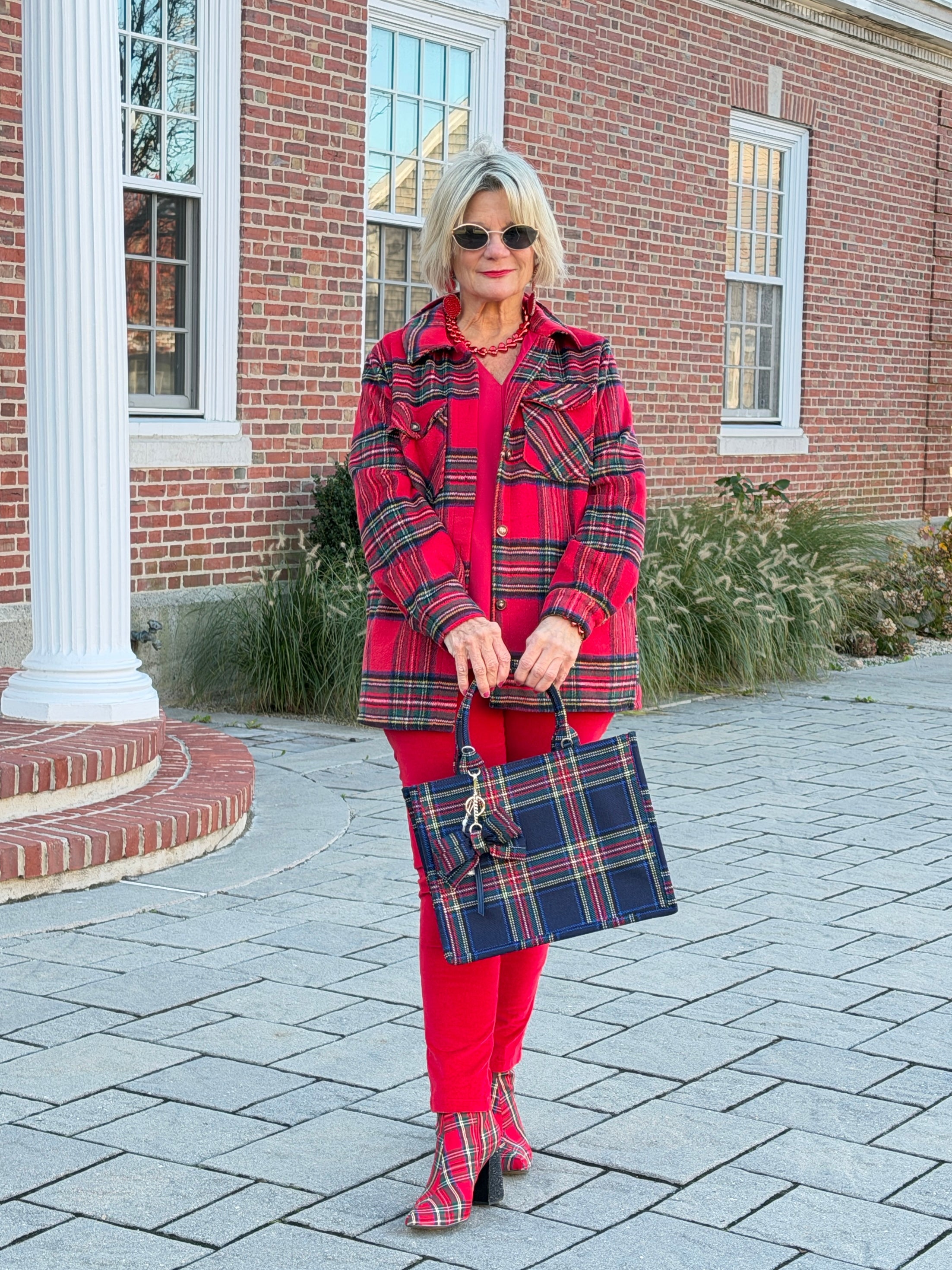 Measures L 14.5” x W 6” x H 11”; Handle 6”Made from polyester and wool, Say hello to the Scottie Tote—your new favorite carry-all with a preppy punch of plaid. Featuring double top handles and a secure magnetic snap closure, this tote is as functional as it is eye-catching. Inside, you’ll find one zip pocket and two slip pockets to keep all your essentials in perfect order. Whether you're headed to the office, brunch, or holiday shopping, this structured beauty brings charm and practicality in equal measure.