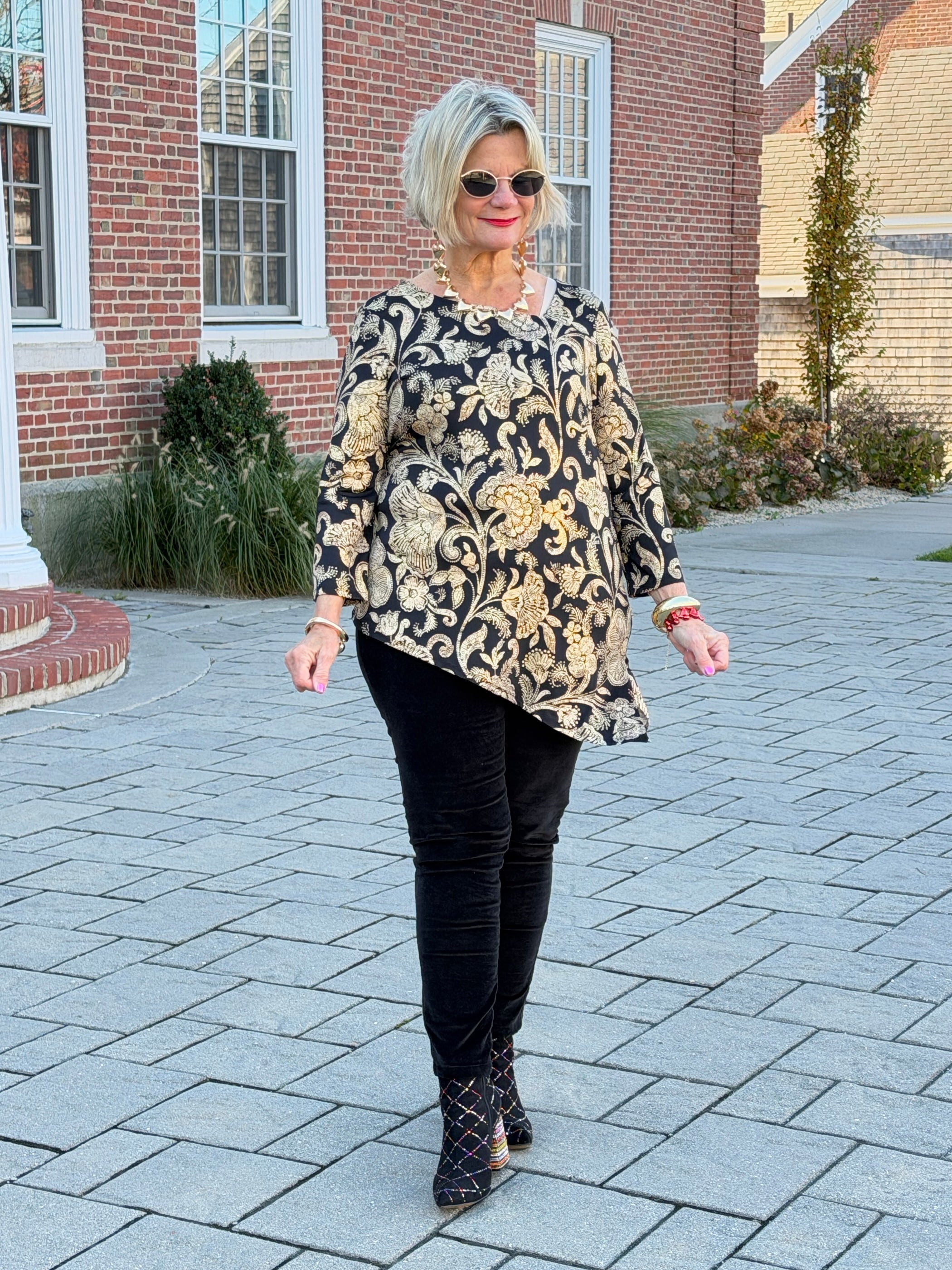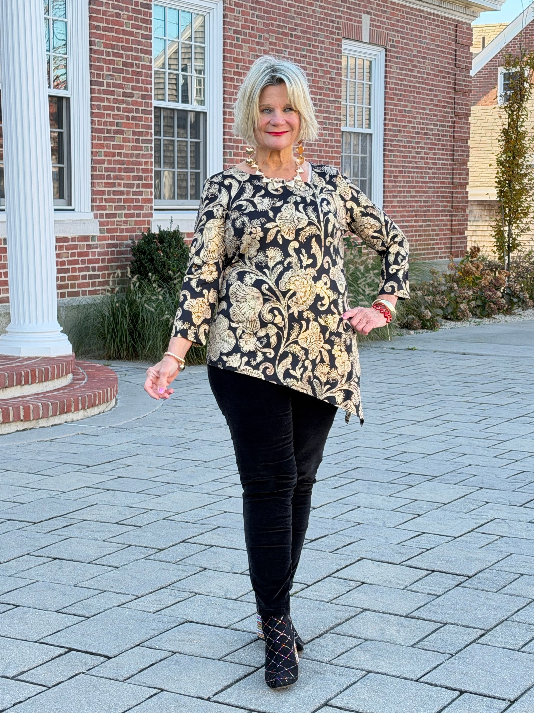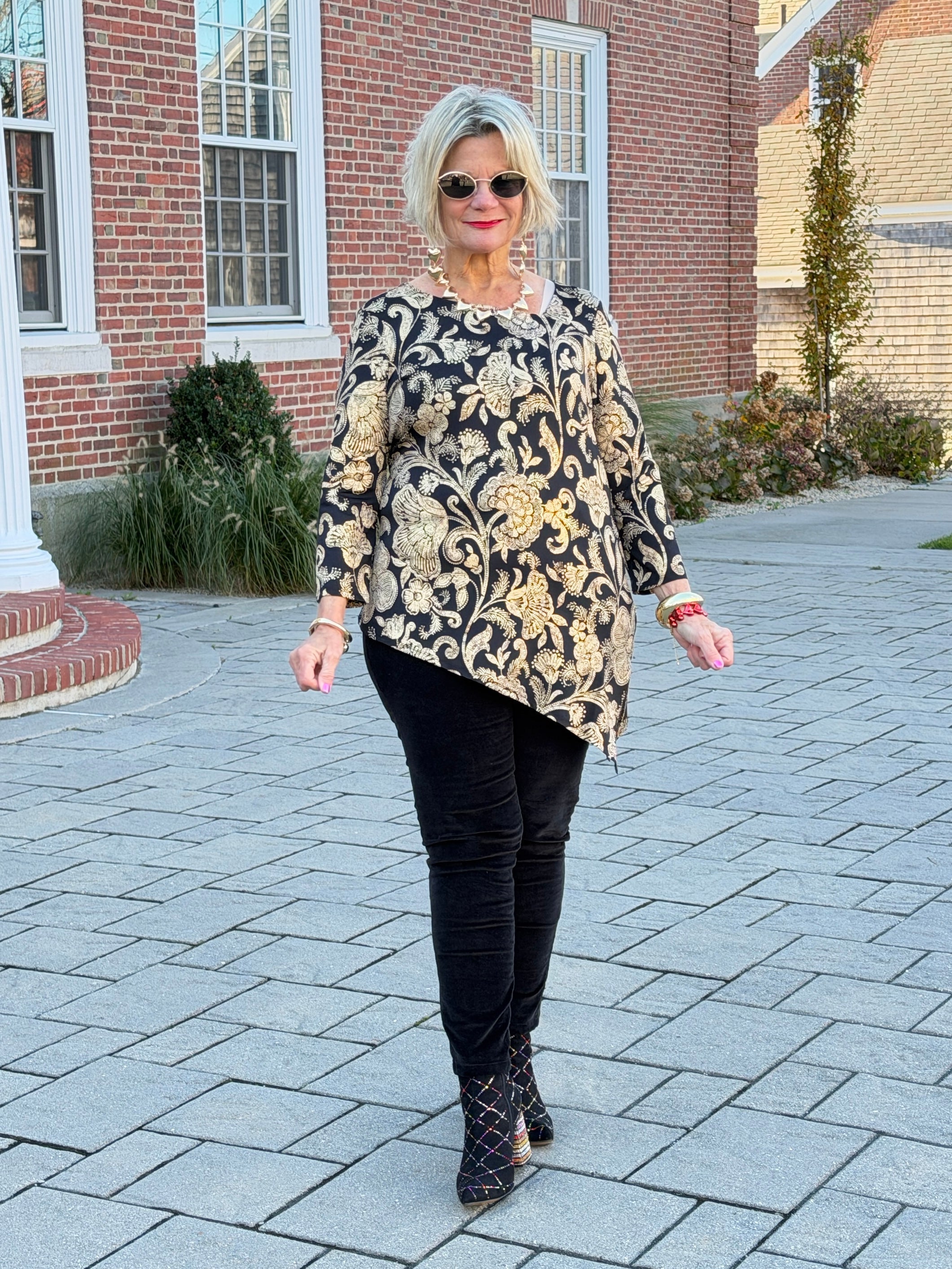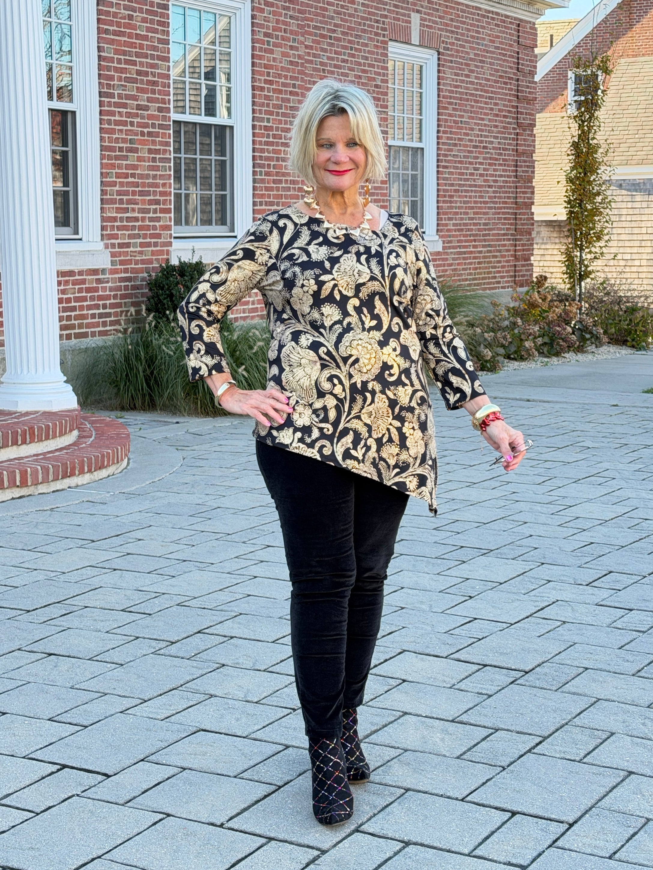 Bold florals meet gorgeous gold foil shimmer in this metallic-printed knit top, finished with an eye-catching asymmetrical hem and V-neckline. 3/4 sleeves make it just right for evening outings.