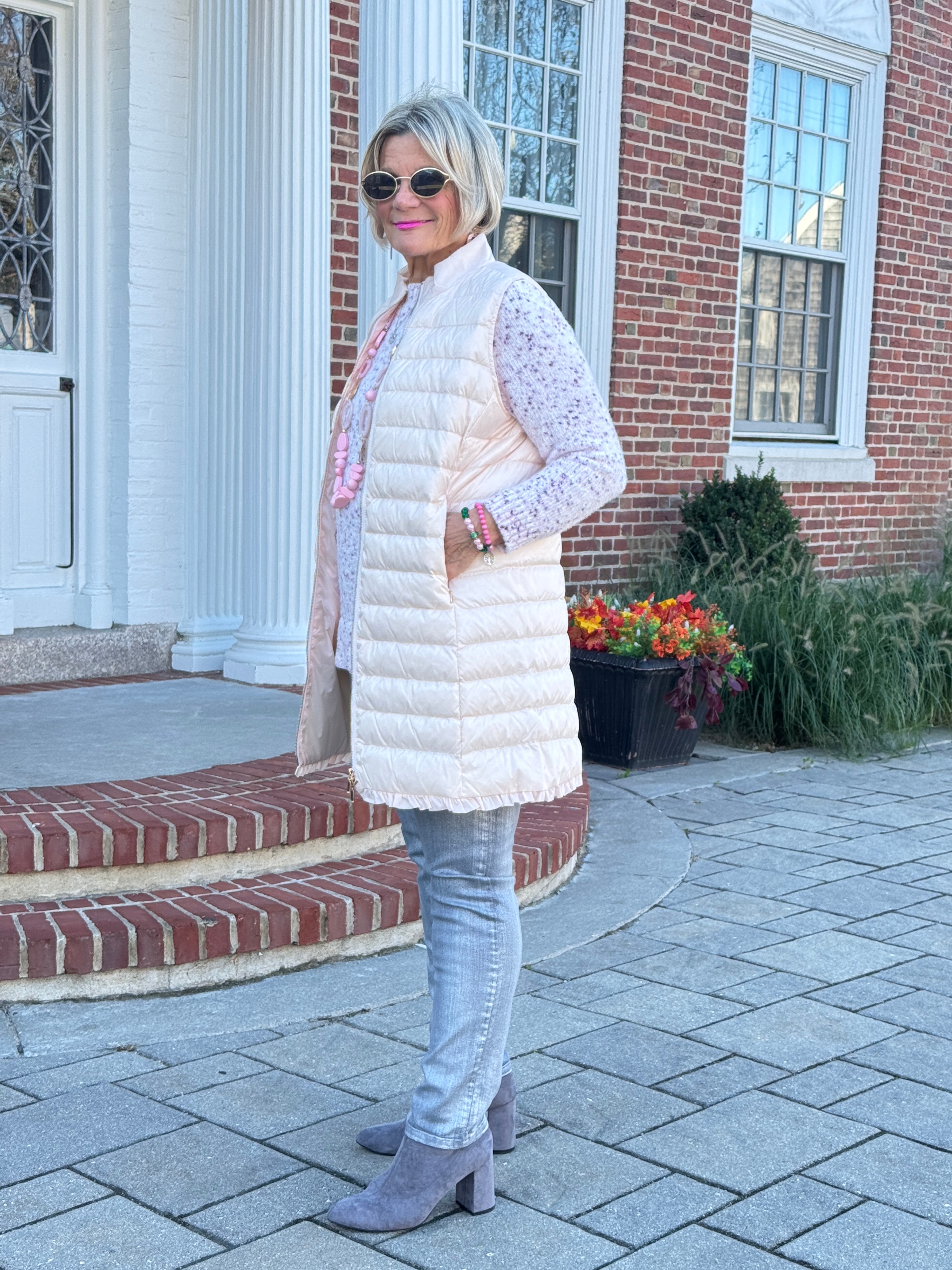 A fluffy high-pile fleece lining lends plush warmth to this recycled-nylon puffer vest that's equipped with water-repellent and antistatic properties.