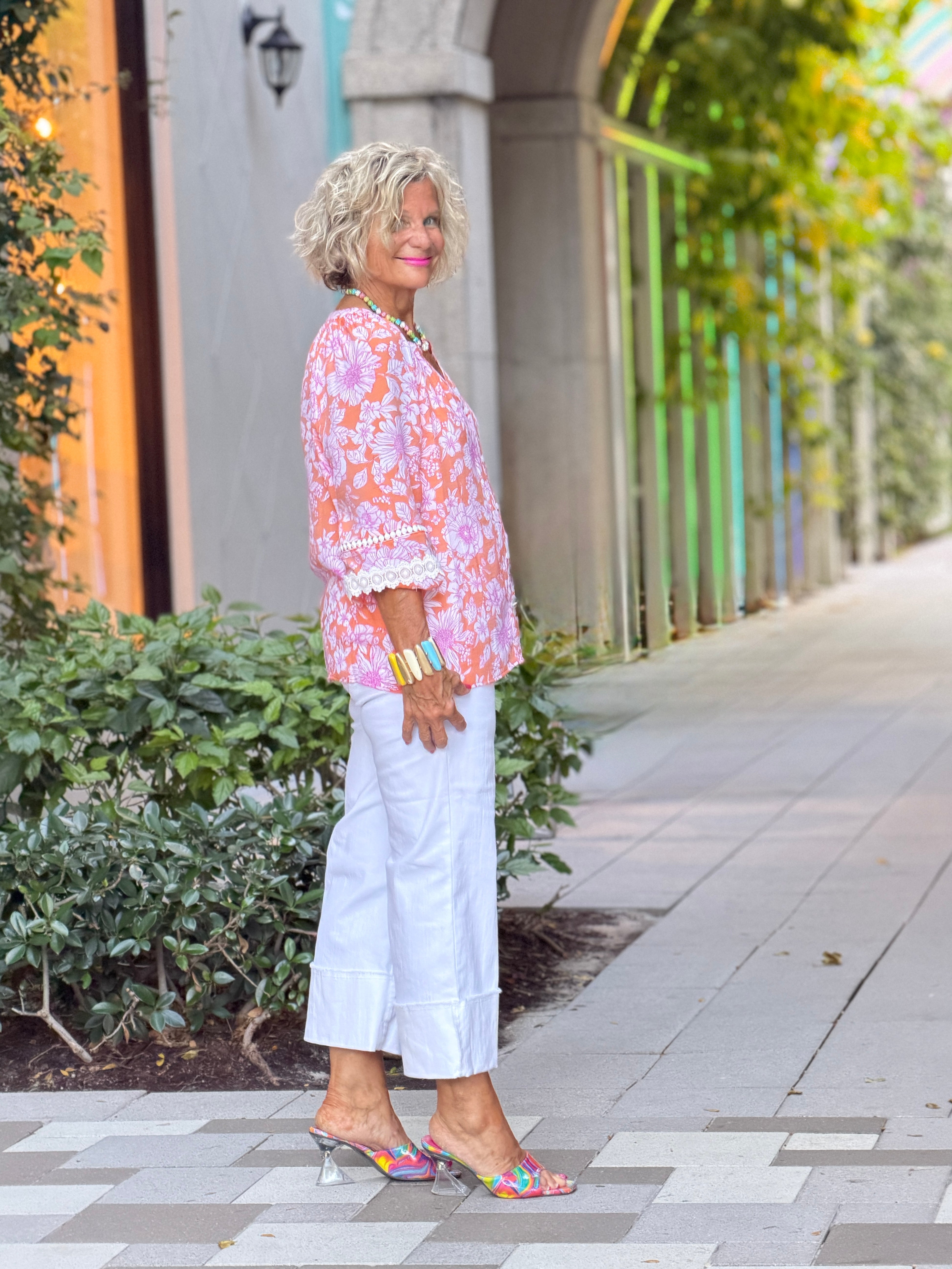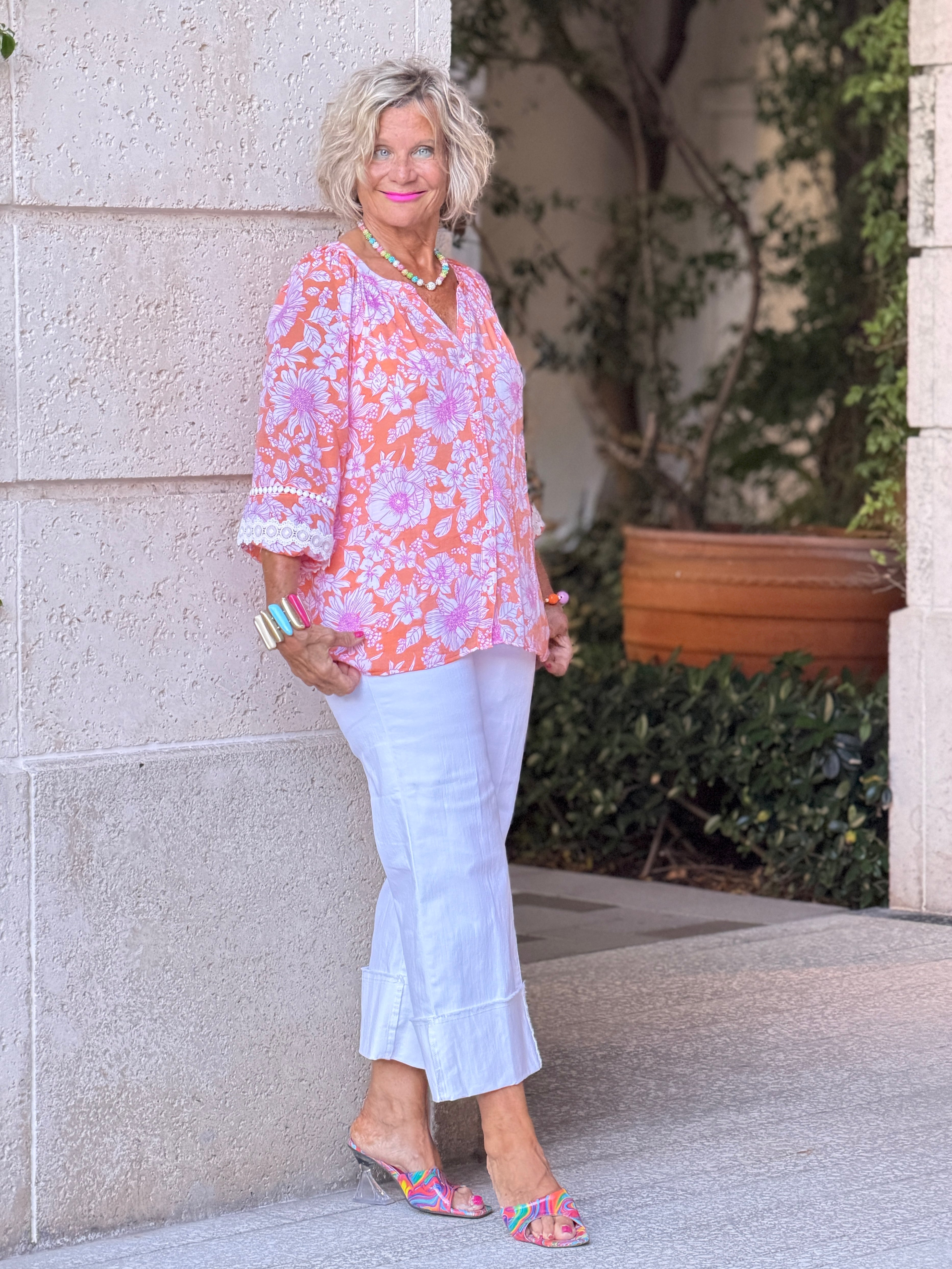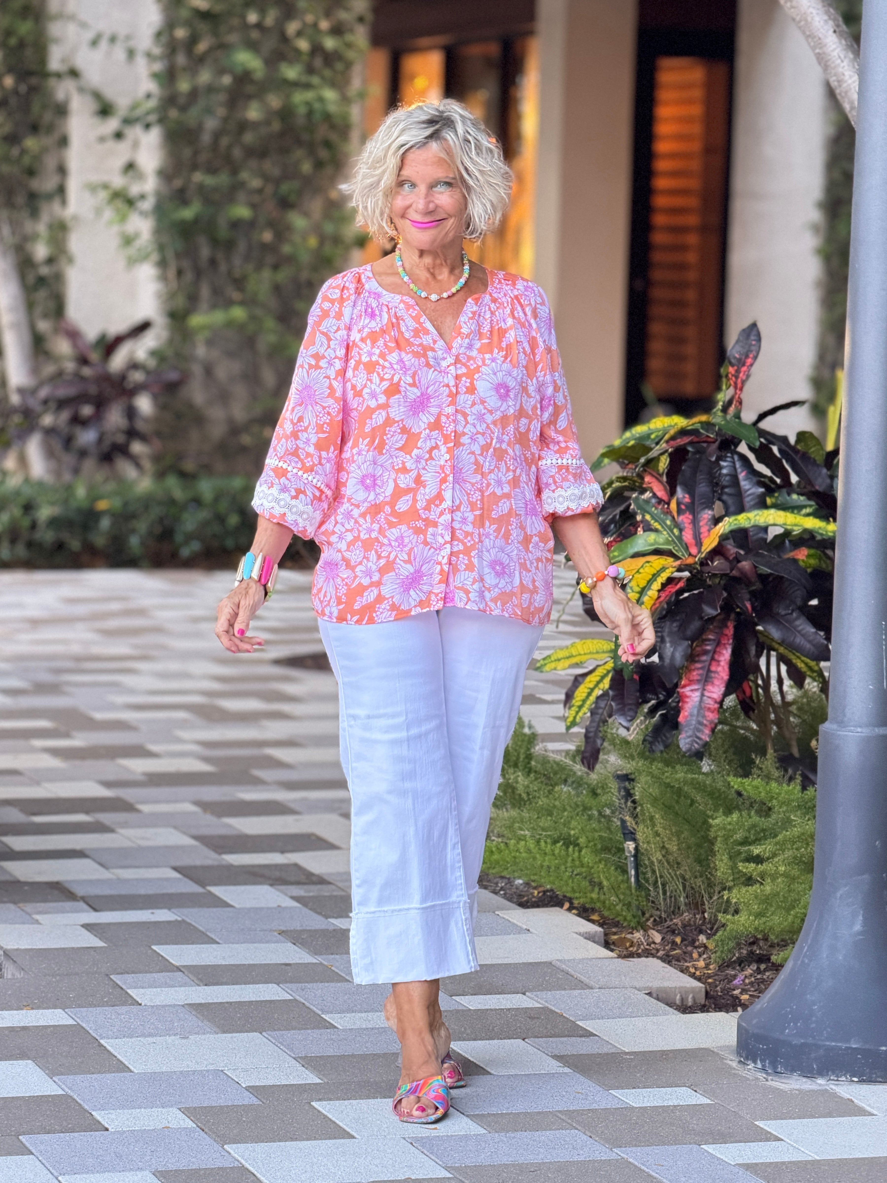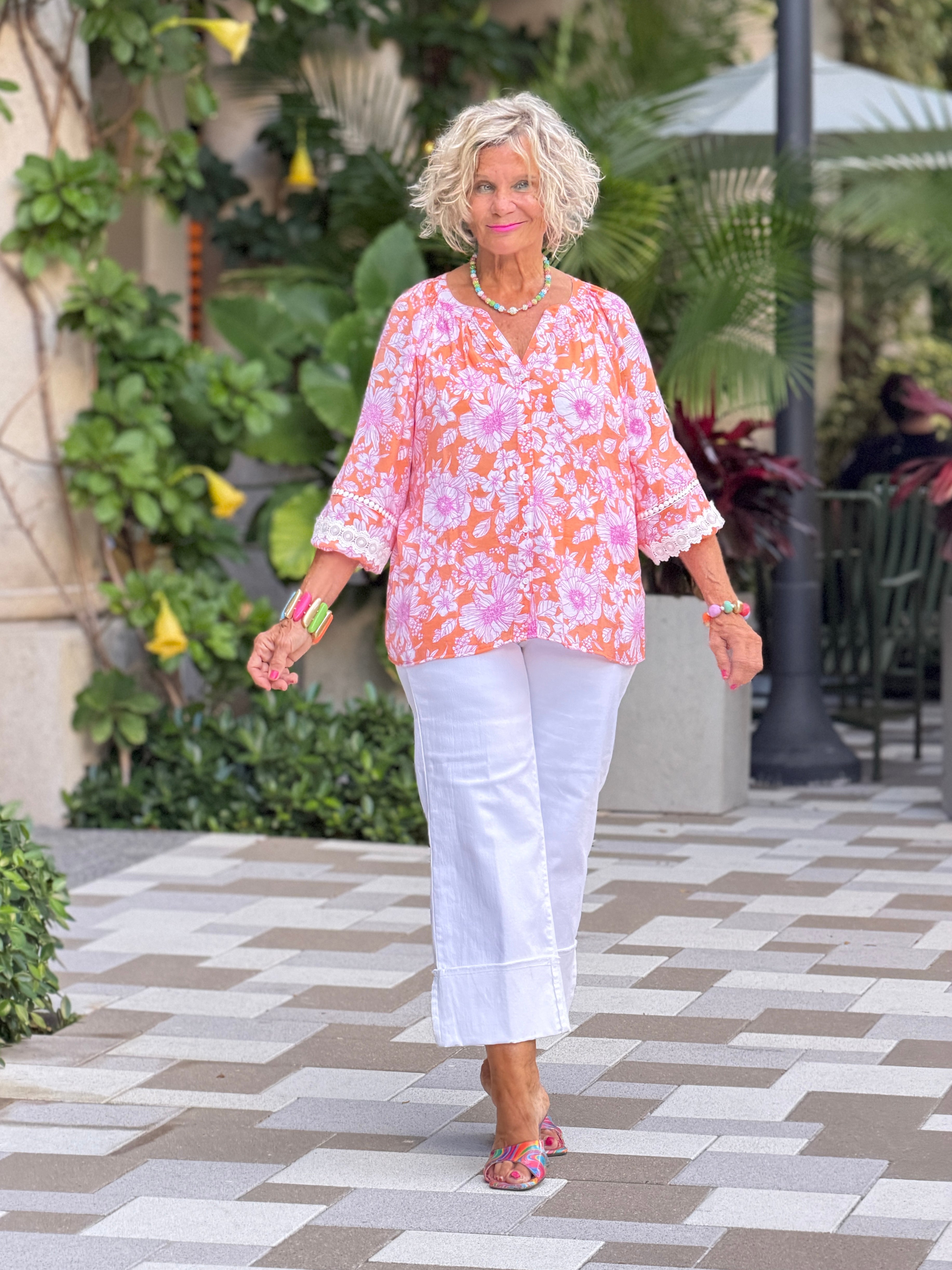 Designed with a flowing peasant silhouette, this floral blouse is crafted from airy silky gauze for a light, comfortable feel. Lace inset details along the sleeves add soft texture, while the button-front design keeps it versatile. Three-quarter sleeves provide easy coverage without feeling heavy. A feminine, easygoing blouse perfect for everyday styling.