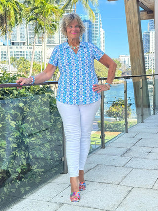 LULU B COASTAL BLOOM SHORT SLEEVE V-NECK COLLAR TOP