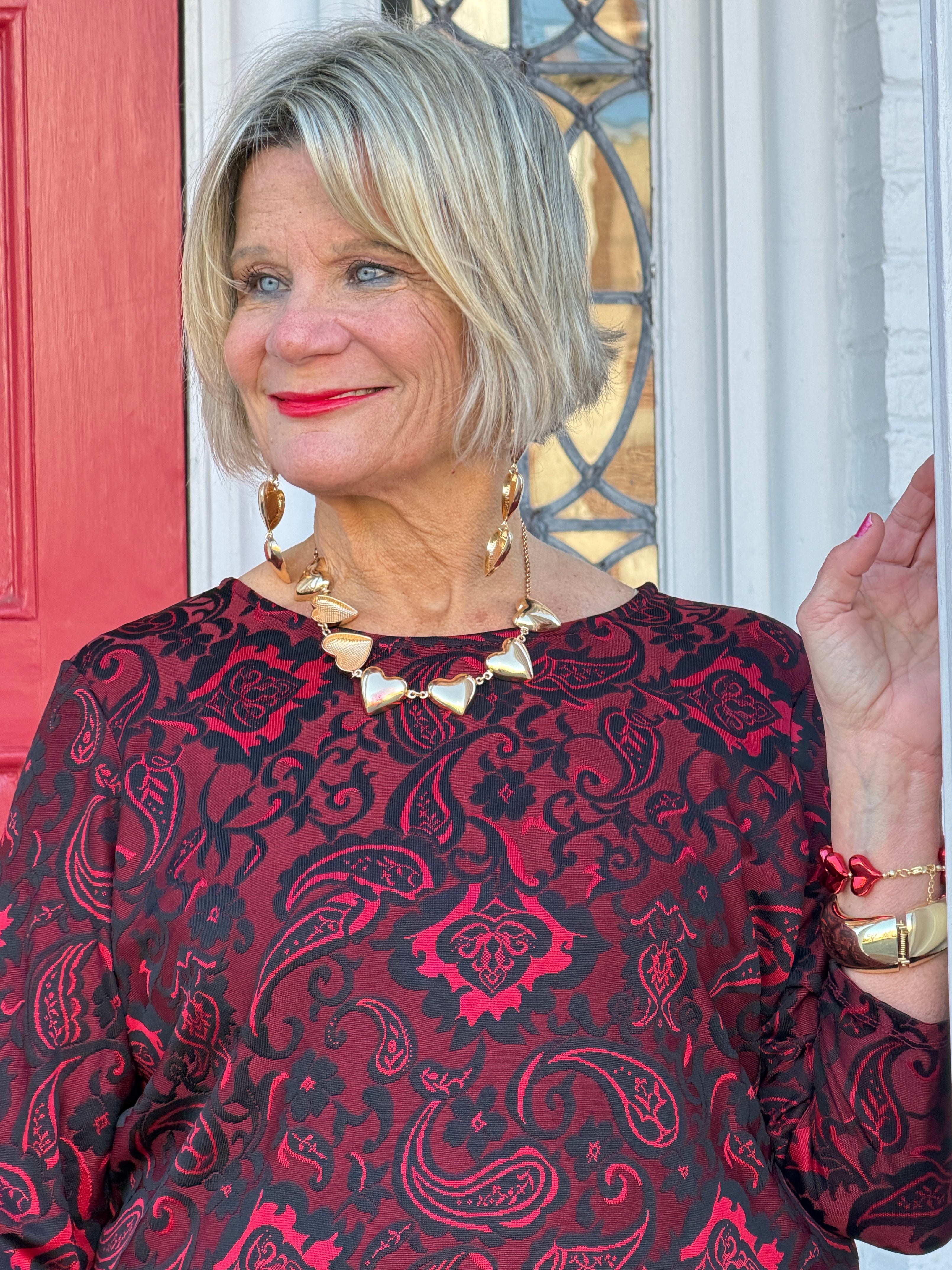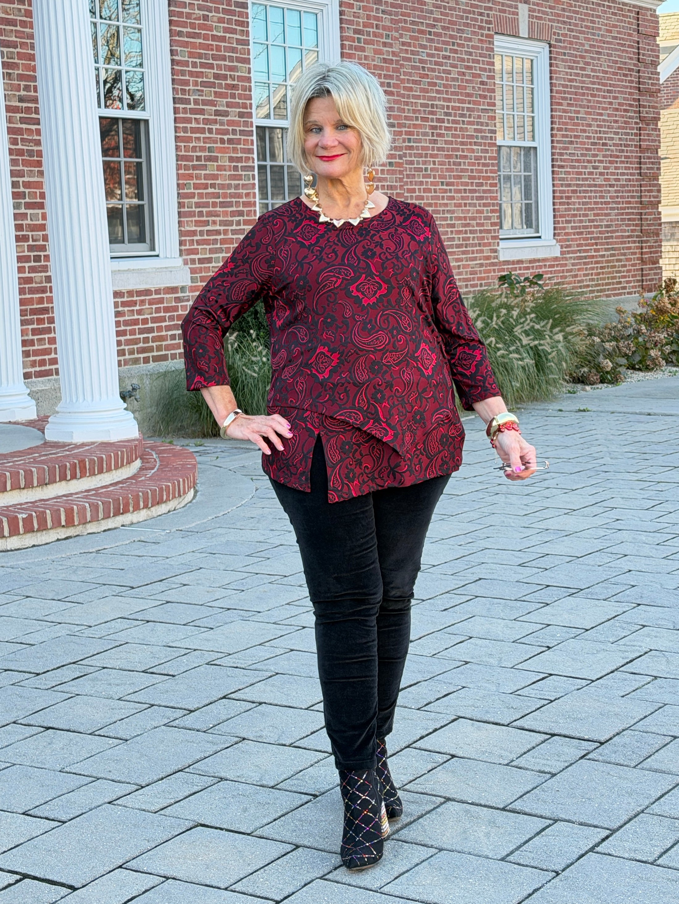 This flocked knit top features velvet-like florals and delicate lace accents at the crossover hemline. With a scoop neck and 3/4 sleeves, it's feminine, festive, and perfectly flattering.