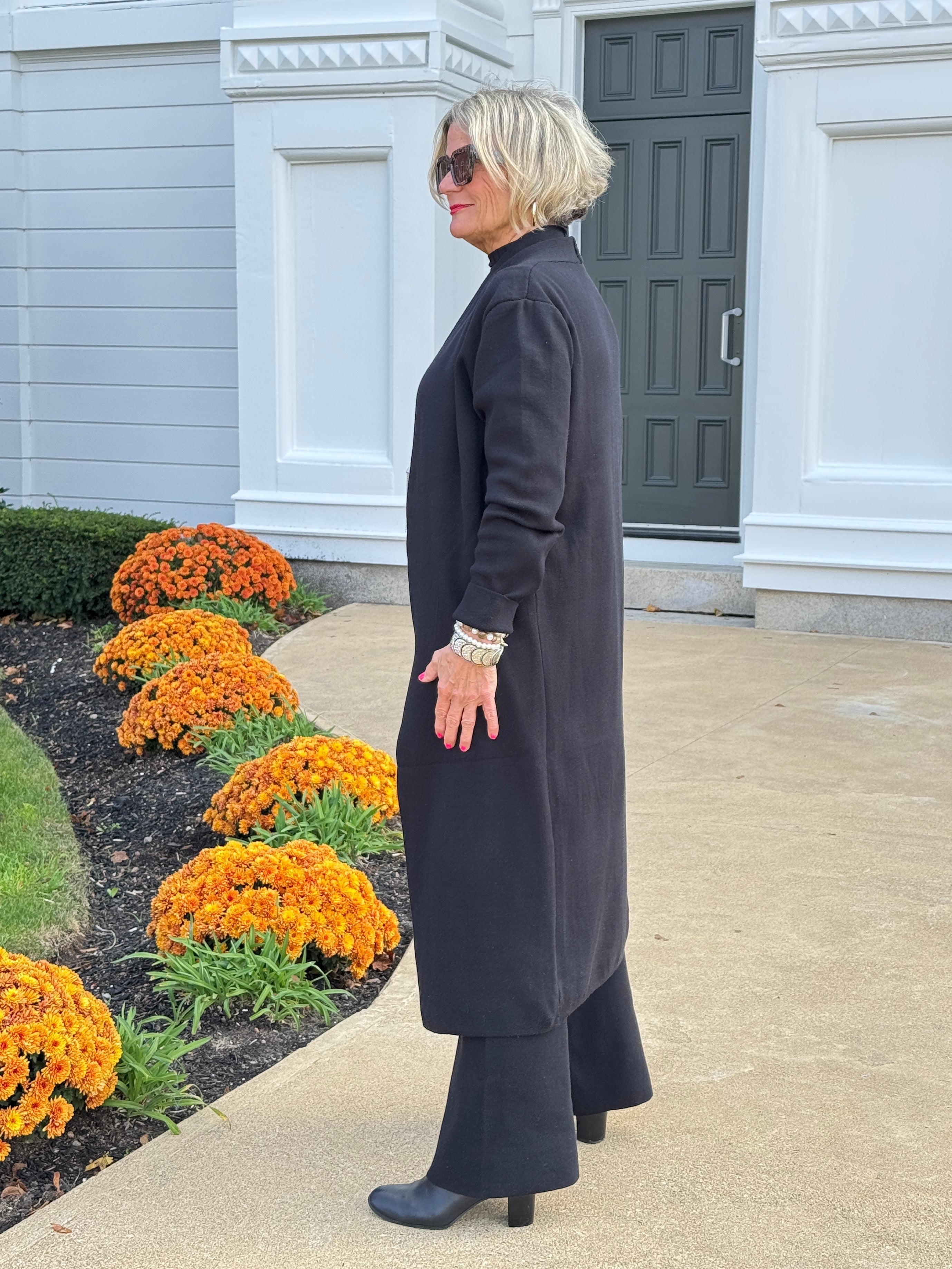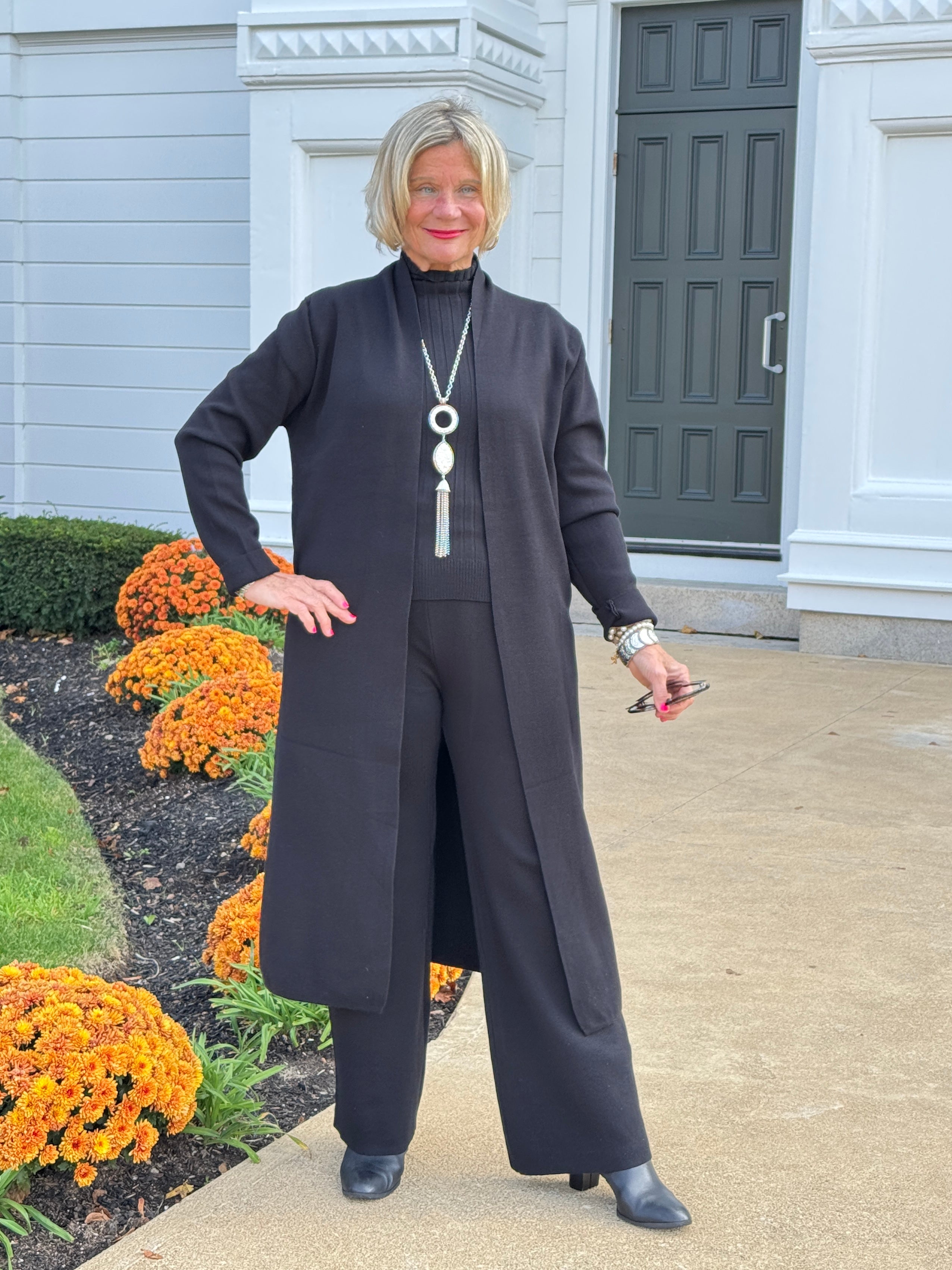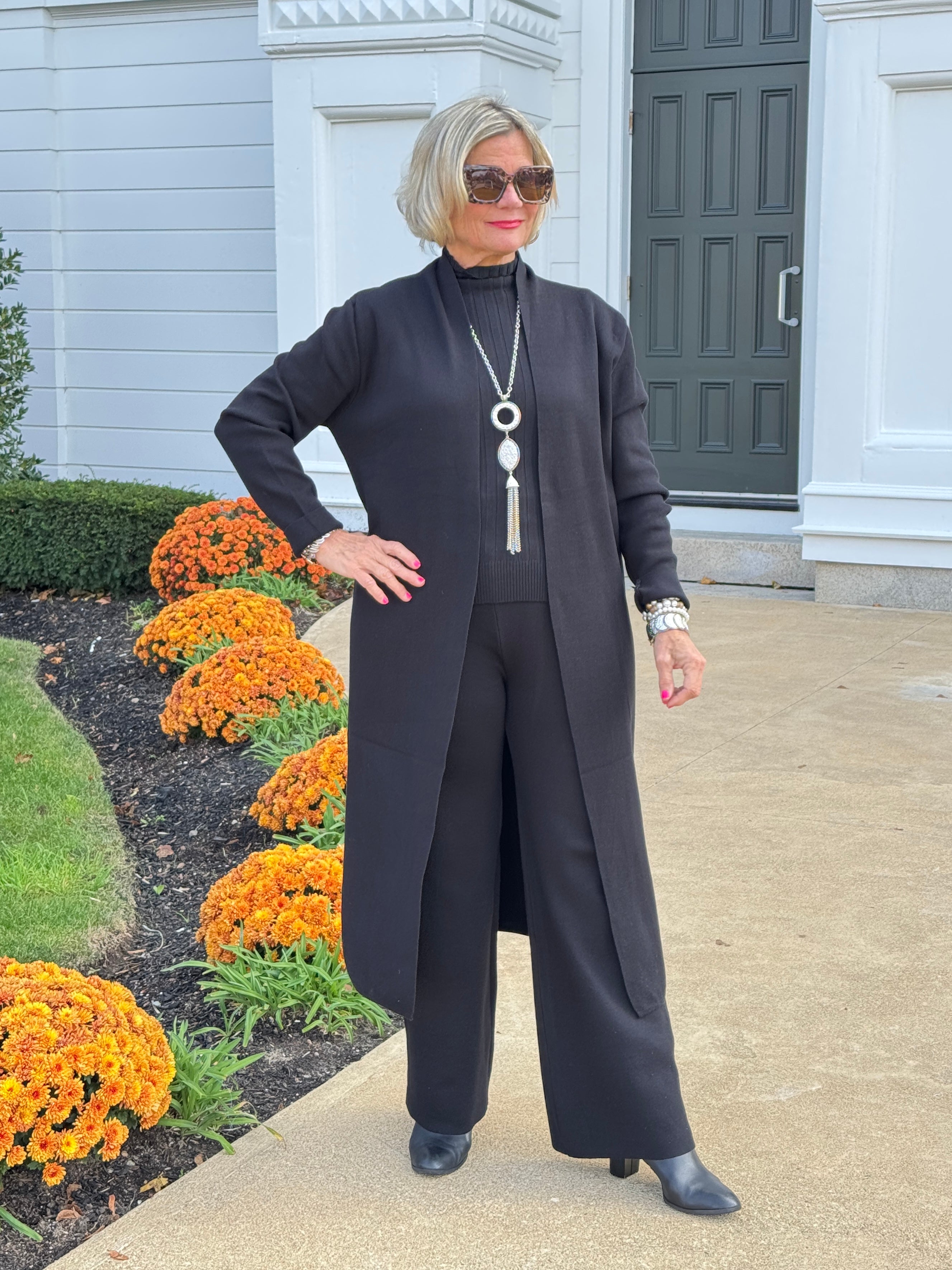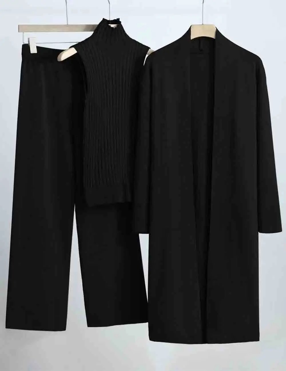 Ladies Solid Color Open Knit Cardigan & Pants 3PCS Set