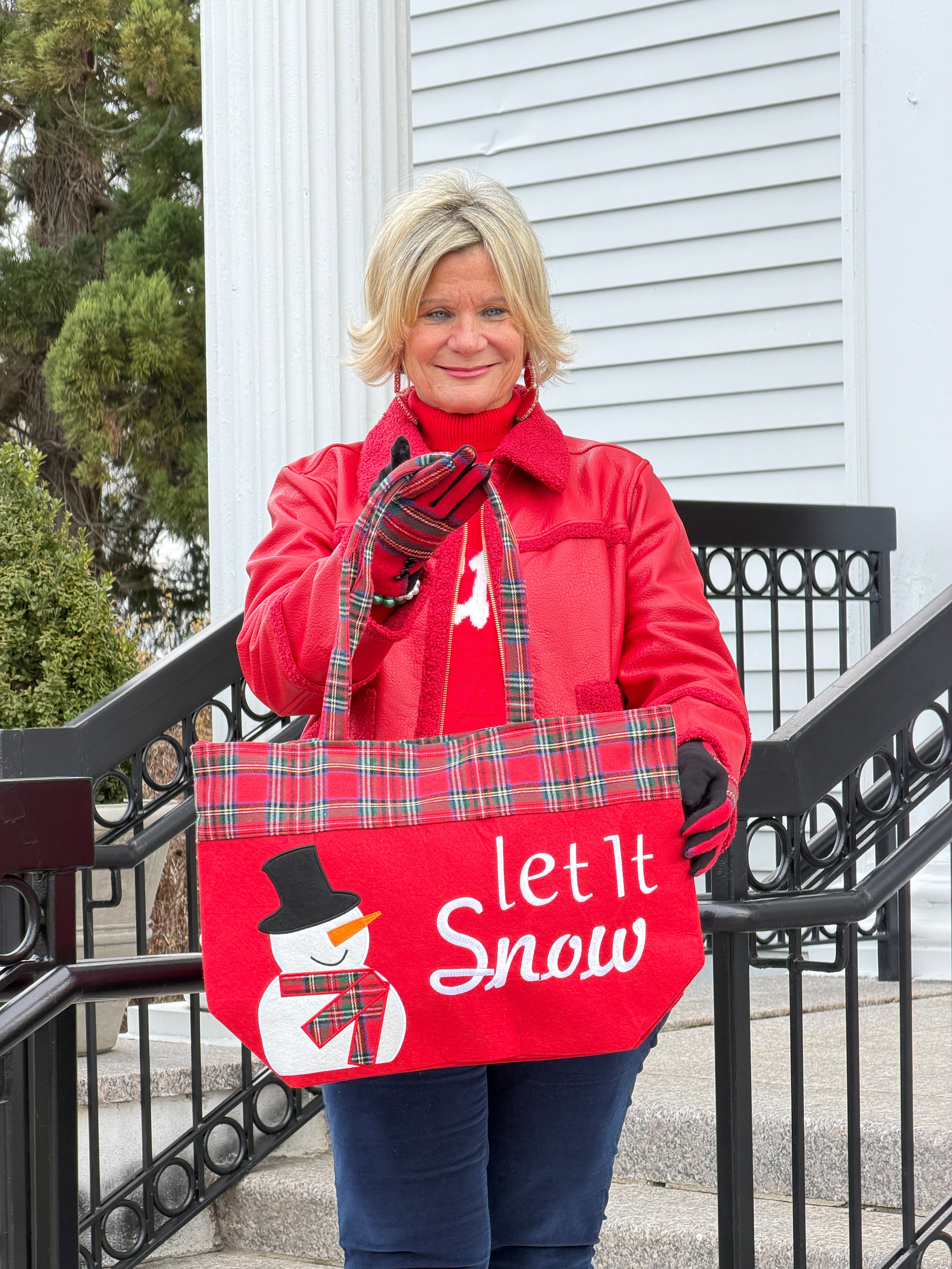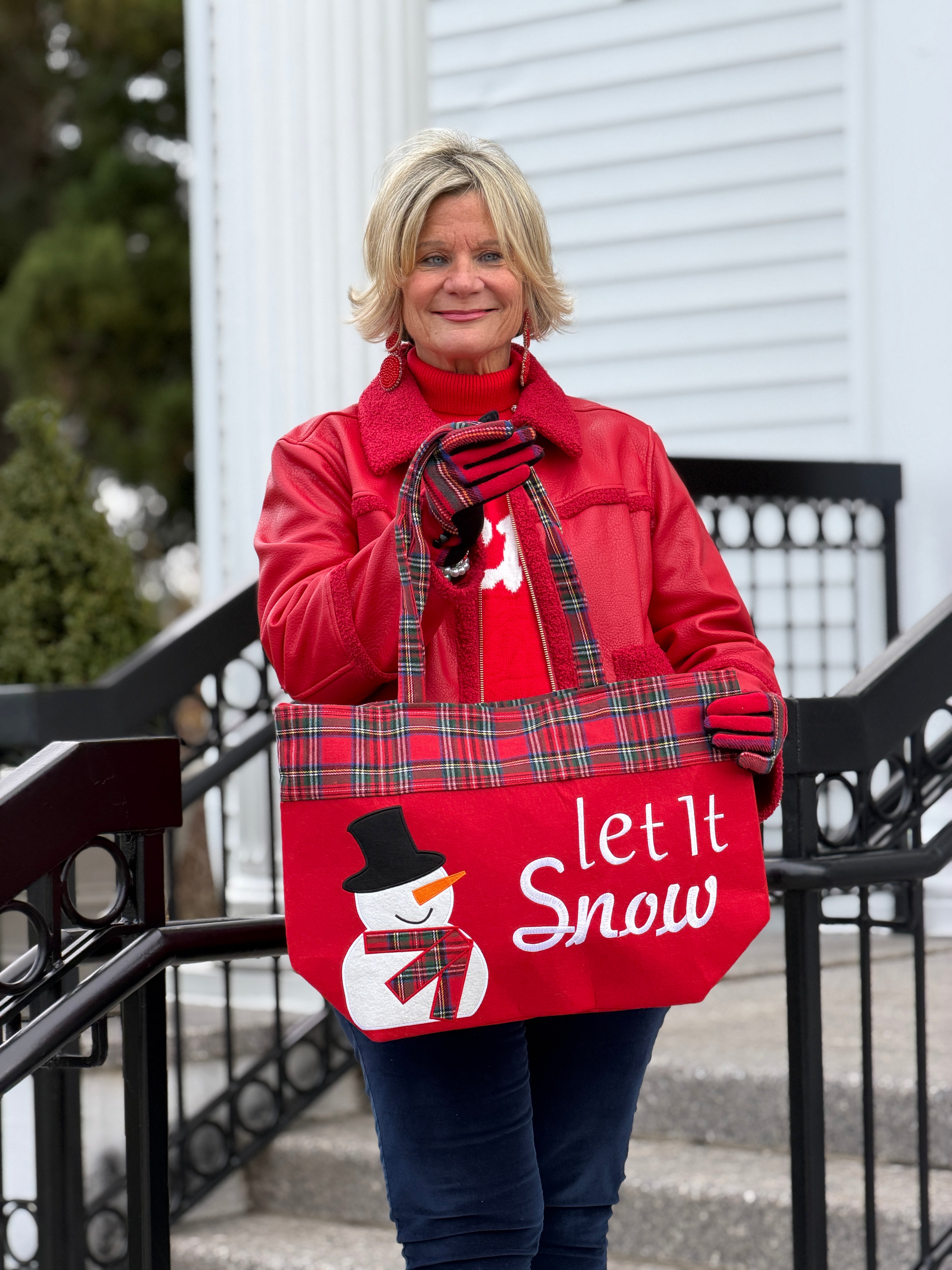 * Let It Snow Letter Snowman Christmas Tote Bag * SIZE : 19"X13"X6". * CONTENTS : 100% POLYESTER. * Introducing the "Let It Snow Letter Snowman Christmas Tote Bag" – a festive and stylish accessory that captures the spirit of the season! This charming red plaid tote bag features an adorable snowman design, making it the perfect companion for your holiday shopping or winter outings. Elevate your Christmas style with this delightful piece from H&D Accessories!