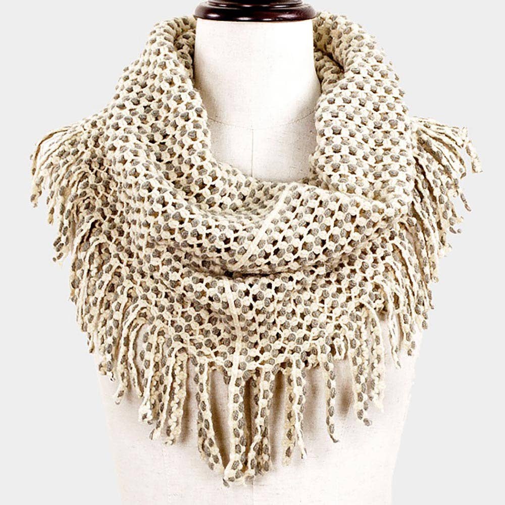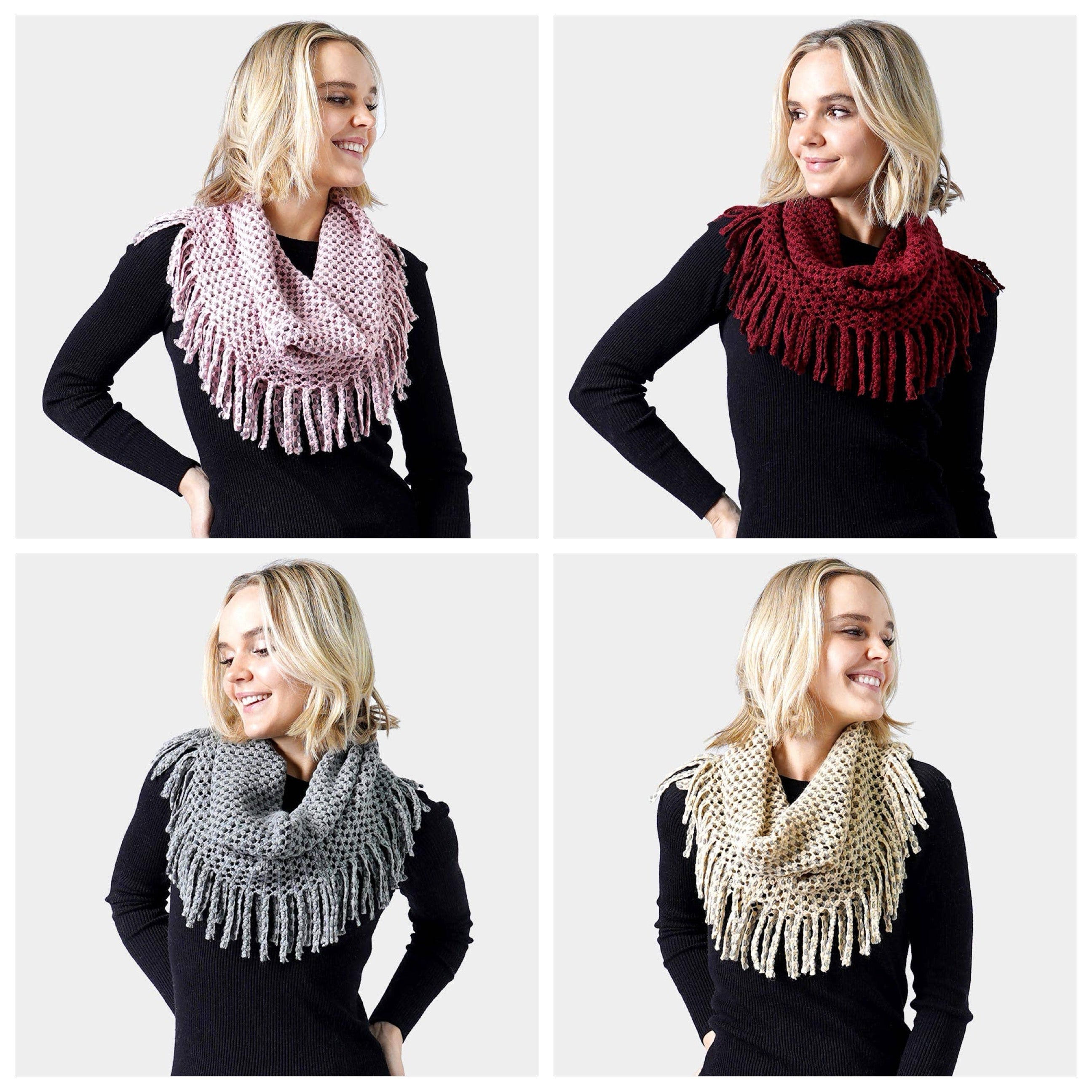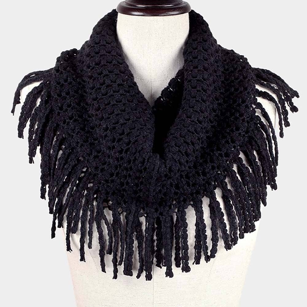 Mini Tube Fringe Scarf • Size: 27" X 12" • Material : Acrylic Fringe knit infinity scarf with a soft, looped design—perfect for adding cozy texture and effortless style to any winter look. Lightweight warmth ideal for layering.