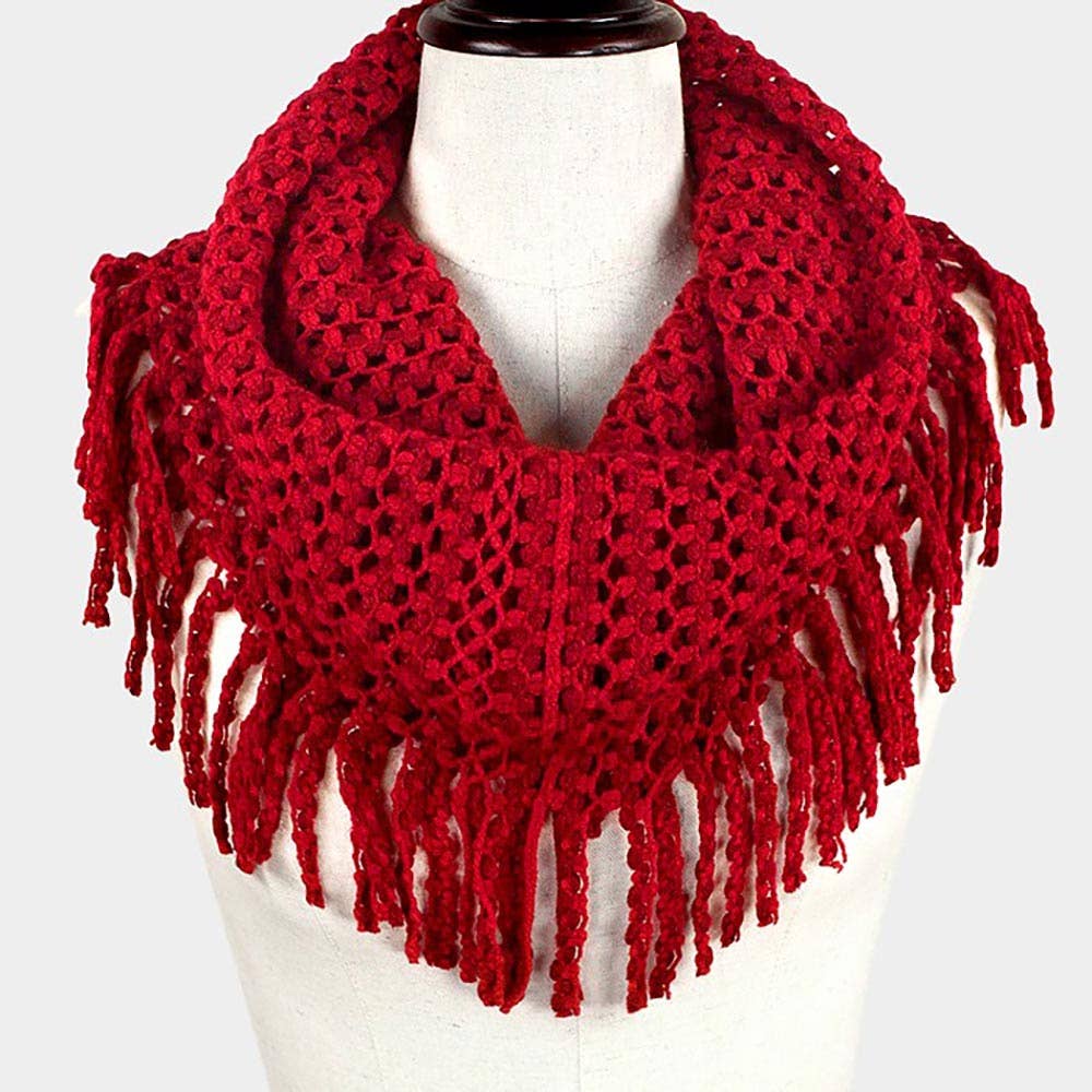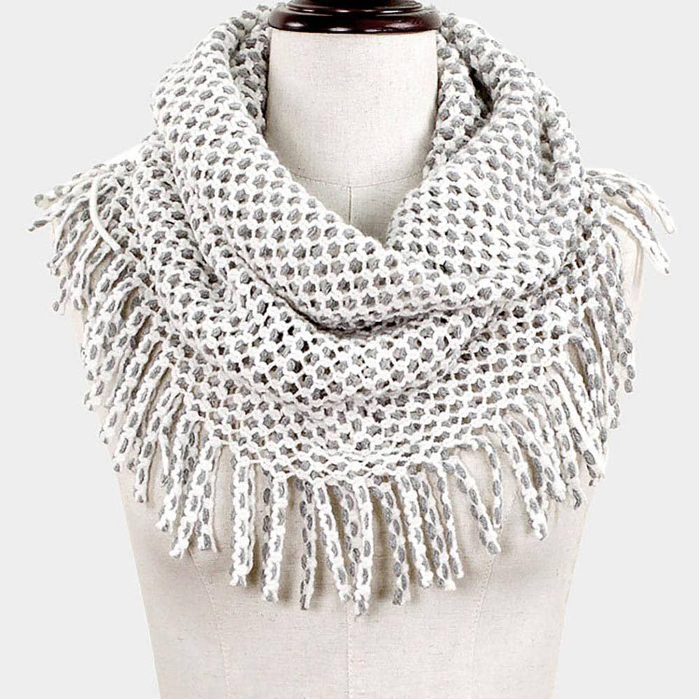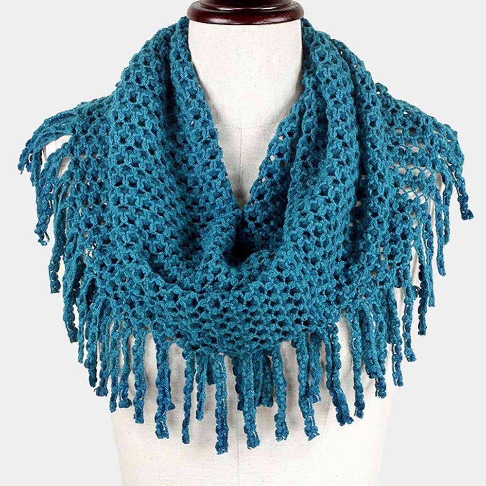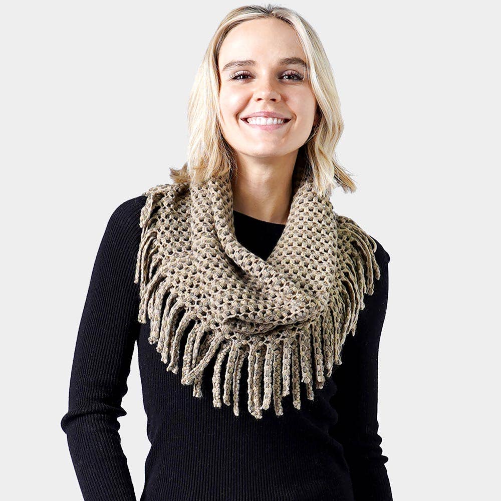 Mini Tube Fringe Scarf • Size: 27" X 12" • Material : Acrylic Fringe knit infinity scarf with a soft, looped design—perfect for adding cozy texture and effortless style to any winter look. Lightweight warmth ideal for layering.